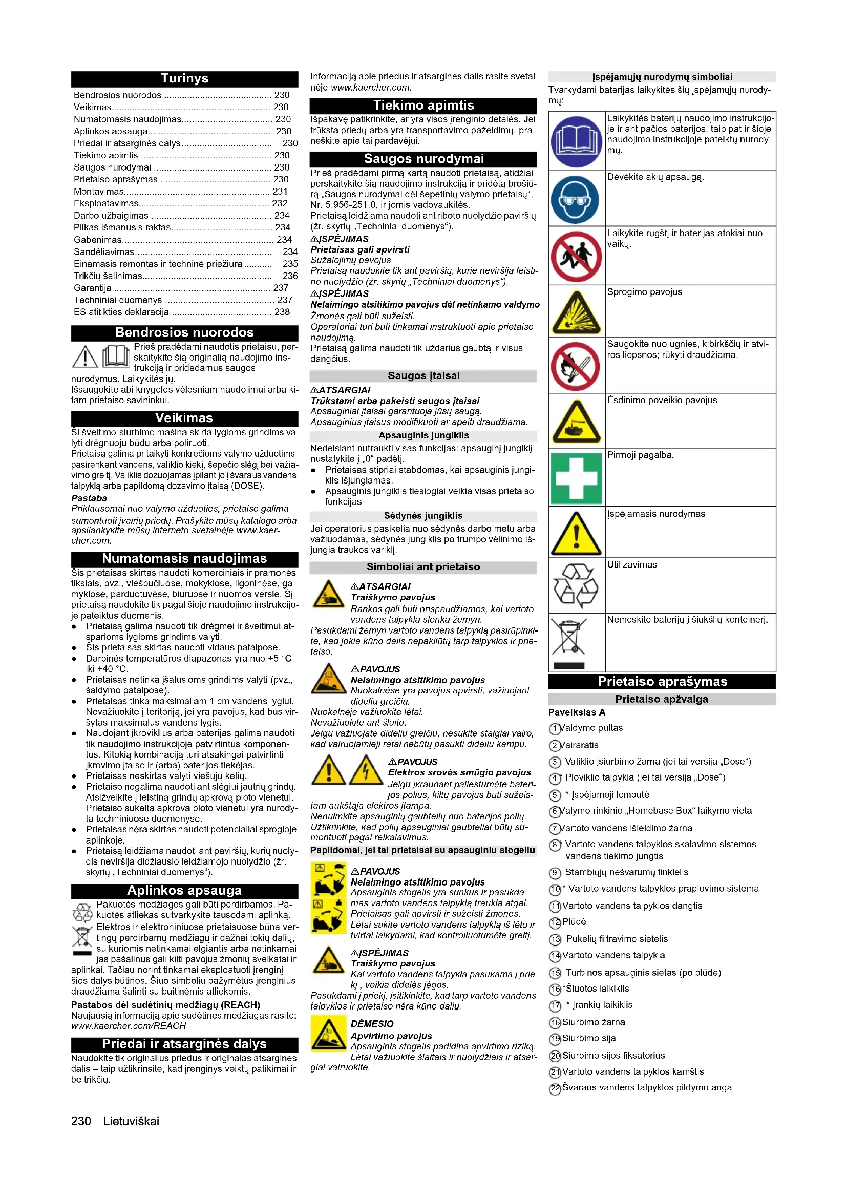 - ES atitikties deklaracija Laikykitės baterijų naudojimo instrukcijo- je ir ant pačios baterijos, taip pat ir šioje naudojimo instrukcijoje pateiktų nurody- mų. Dėvėkite akių apsaugą. Laikykite rūgštį ir baterijas atokiai nuo vaikų. Sprogimo pavojus Saugokite nuo ugnies, kibirkščių ir atvi- ros liepsnos; rūkyti draudžiama. Ėsdinimo poveikio pavojus Pirmoji pagalba. Įspėjamasis nurodymas Utilizavimas Nemeskite baterijų į šiukšlių konteinerį.Lietuviškai 231 23 Pripildymo sistema 24 Baterijos kištukas (jeigu naudojamas išorinis įkrovi- klis) Įkroviklio maitinimo laidas (jeigu naudojamas vidinis įkroviklis) 25 Akceleratoriaus pedalas 26 Važiuojant dieną įjungiami pažibinčiai 27 *Darbinis žibintas 28 * Šoninė valomoji plokštė 29 Šoninis šepetys (tik su SB variantu) 30 Valymo grandiklio reguliavimo ratukas (tik D valymo galvutei) 31 Kabelio kabliukai 32 Valymo galvutė 33 Valymo grandiklis 34 Guolio dangtis (norint pakeisti šepetį) 35 Šepečio keitimo pedalas (tik D valymo galvutei) 36 Sėdynė (su sėdynės jungikliu) 37 Sėdynės reguliavimo svirtis 38 Baterija 39 Identifikacinė plokštelė 40 Nešvarumų stambiųjų dalelių talpykla (tik „R“ valy- mo galvutei) 41 Švaraus vandens talpyklos užraktas su švaraus vandens filtru p. 238