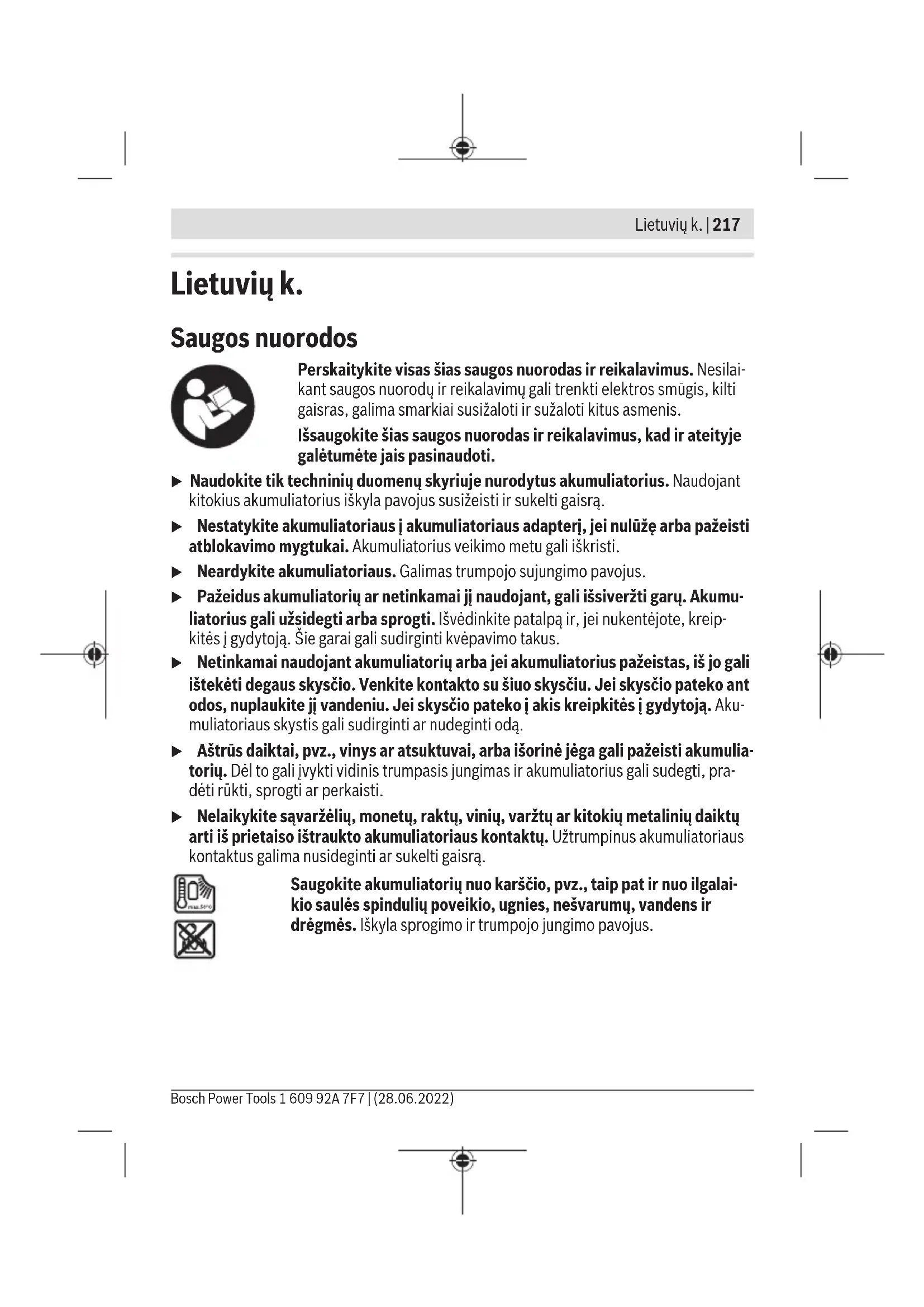 Kaitinamasis elementas nešyla. Akumuliatoriaus įkrovimas Kaitinamojo elemento kabelį sujunkite su akumulia- toriaus adapteryje(1) esančiu lizdu(2). Įjungimo mygtuku(5) suaktyvinkite akumuliatoriaus adapterį(1). Drabužis nešildomas ir išorinis USB prietaisas neįkraunamas. Išimkite akumuliatorių iš adapterio. 10sekundžių palaukite Akumuliatorių vėl įdėkite į adapterį. A) Kai kurių išorinių USB prietaisų, nors techniniai duomenys ir sutampa, su šiuo akumuliatoriaus adapteriu įkrauti negalima. Priežiūra ir servisas Klientų aptarnavimo skyrius ir konsultavimo tarnyba Klientų aptarnavimo skyriuje gausite atsakymus į klausimus, susijusius su jūsų gaminio remontu, technine priežiūra bei atsarginėmis dalimis. Detalius brėžinius ir informacijos apie atsargines dalis rasite interneto puslapyje: www.bosch-pt.com Bosch konsultavimo tarnybos specialistai mielai pakonsultuos Jus apie gaminius ir jų pa- pildomą įrangą. Ieškant informacijos ir užsakant atsargines dalis prašome būtinai nurodyti dešimtženklį gaminio numerį, esantį firminėje lentelėje. 1 609 92A 7F7 | (28.06.2022) Bosch Power ToolsLietuvių k. | 223 Lietuva Bosch įrankių servisas Informacijos tarnyba: (037) 713350 ļrankių remontas: (037) 713352 Faksas: (037) 713354 El. paštas: service-pt@lv.bosch.com Kitus techninės priežiūros skyriaus adresus rasite čia: www.bosch-pt.com/serviceaddresses Transportavimas Ličio jonų akumuliatoriams taikomos pavojingų krovinių gabenimą reglamentuojančių įstatymų nuostatos. Naudotojui akumuliatorius gabenti keliais leidžiama be jokių apriboji- mų. Jei siunčiant pasitelkiami tretieji asmenys (pvz., oro transportas, ekspedijavimo įmonė), būtina atsižvelgti į pakuotei ir ženklinimui taikomus ypatingus reikalavimus. Būtina, kad rengiant siuntą dalyvautų pavojingų krovinių gabenimo specialistas. Siųskite tik tokius akumuliatorius, kurių nepažeistas korpusas. Apklijuokite kontaktus ir supakuokite akumuliatorių taip, kad jis pakuotėje nejudėtų. Taip pat laikykitės ir esamų papildomų nacionalinių taisyklių. Šalinimas Elektriniai įrankiai, akumuliatoriai/baterijos, papildoma įranga ir pakuotės turi būti ekologiškai utilizuojami. Elektrinių prietaisų, akumuliatorių bei baterijų nemeskite į buitinių atliekų kon- teinerius! Tik ES šalims: Pagal Europos direktyvą 2012/19/ES dėl elektros ir elektroninės įrangos atliekų ir šios direktyvos perkėlimo į nacionalinę teisę aktus nebetinkami naudoti elektriniai prietaisai ir pagal 2006/66/EB pažeisti ir susidėvėję akumuliatoriai/baterijos turi būti surenkami at- skirai ir perdirbami aplinkai nekenksmingu būdu. Netinkamai pašalintos elektros ir elektroninės įrangos atliekos dėl galimų pavojingų me- džiagų gali turėti žalingą poveikį aplinkai ir žmonių sveikatai. Akumuliatoriai ir baterijos: Ličio jonų: Bosch Power Tools 1 609 92A 7F7 | (28.06.2022)224 | 한국어 Prašome laikytis "Transportavimo" skyriuje (žr. „Transportavimas“, Puslapis223) pateik- tų nuorodų.