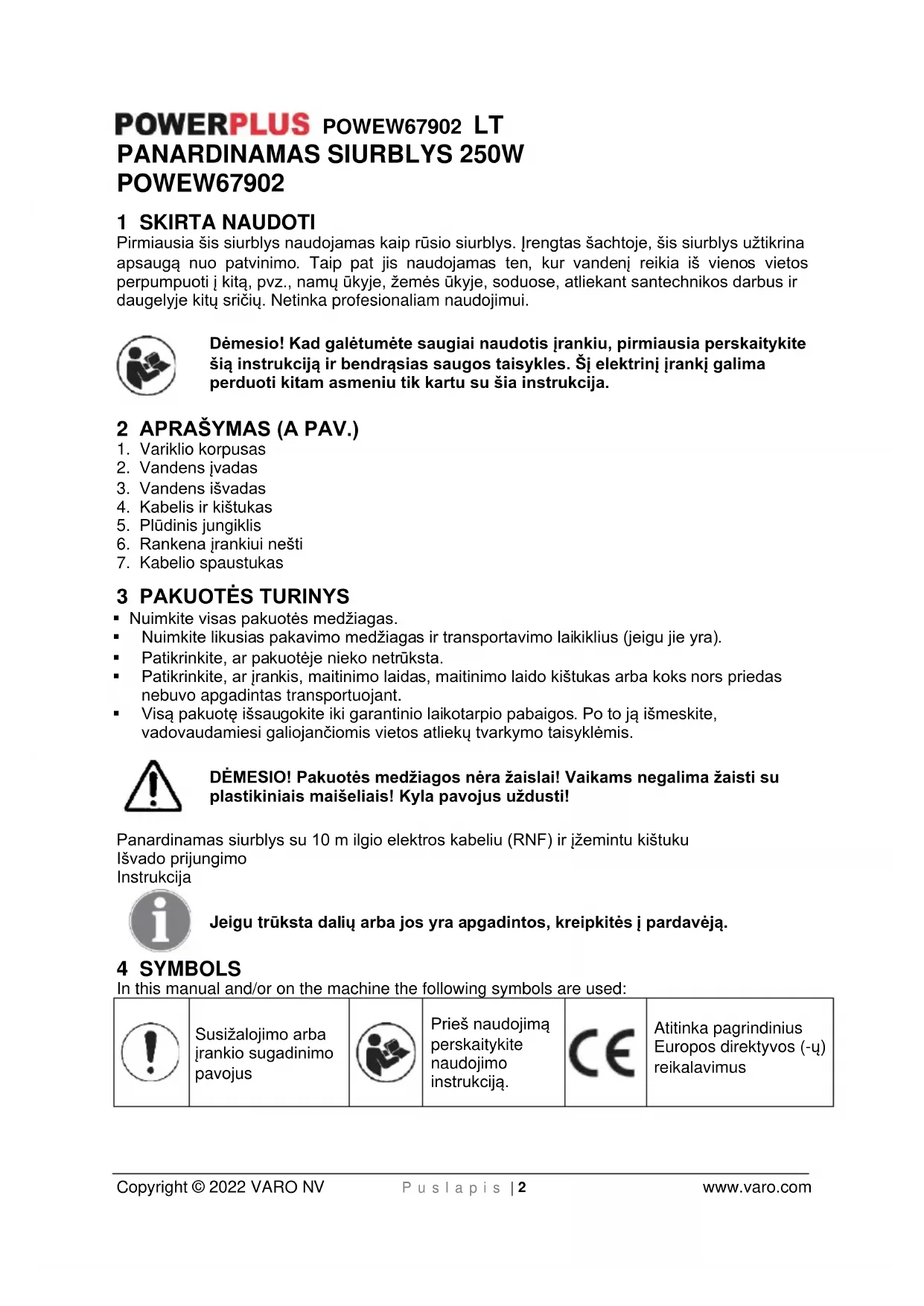 - Nustatydami plūdinį jungiklį, įsitikinkite, ar jis nepaliečia pagrindo, kol siurblys neišsijungia. Atsargiai! Siurblys gali pradėti veikti ne vandenyje. Šio prietaiso negali naudoti vaikai arba žmonės, kurie turi fizinių, protinių arba raidos sutrikimų, arba žmonės, kuriems trūksta patirties arba žinių, išskyrus tuos atvejus, jeigu šiuos žmones tinkamai instruktuoja už jų saugą atsakingas asmuo ar prižiūrėtojas, arba jie išstudijuoja pirmiau pateiktus nurodymus dėl šio prietaiso naudojimo.POWEW67902 LT Copyright © 2022 VARO NV P u s l a p i s | 5 www.varo.com