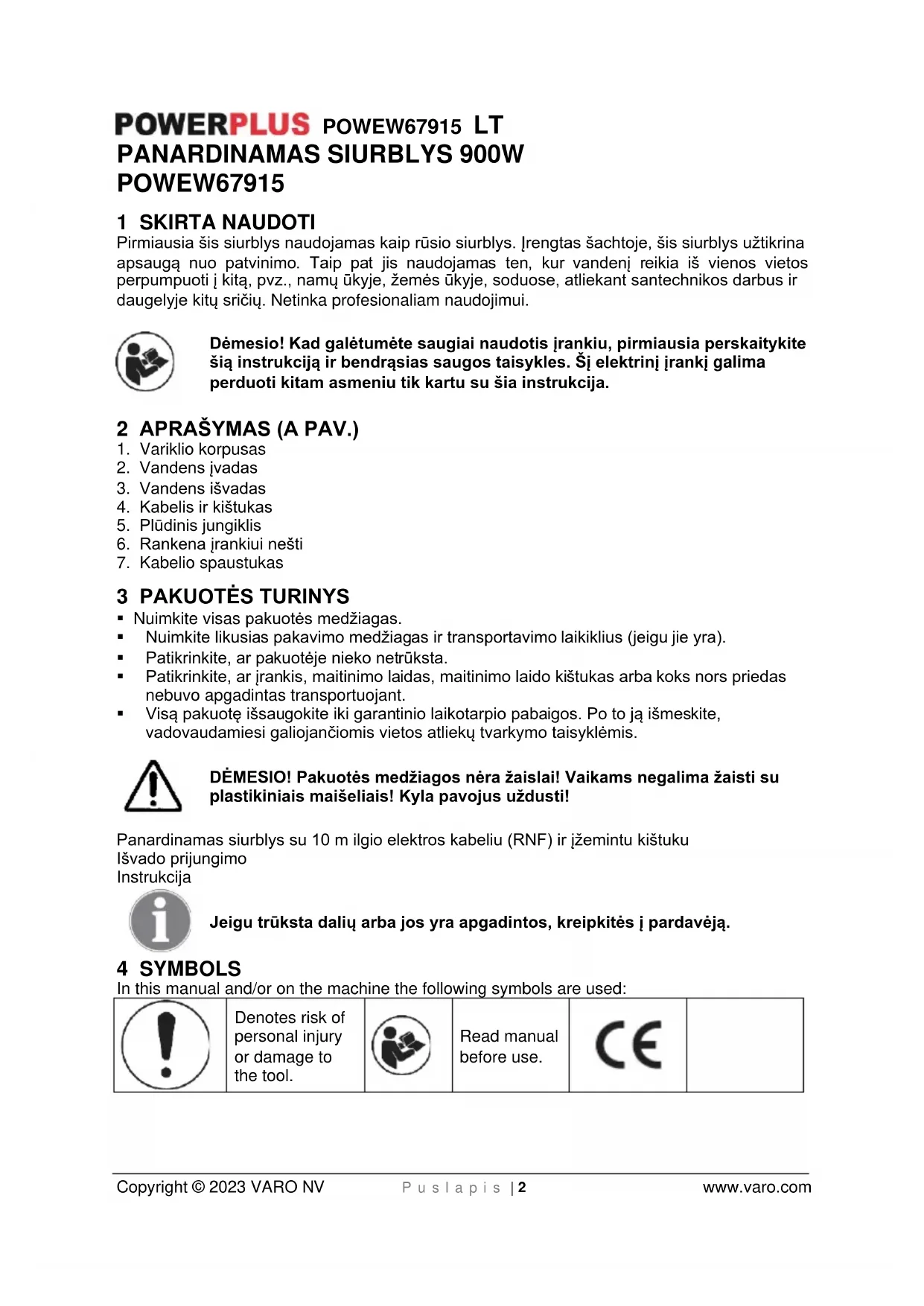 - stacionariai, naudojant lanksčią žarną. Atkreipkite dėmesį! Niekada neįrenkite siurblio, pakabindami jį neatremtą nuo tiekimo vamzdžio arba ant maitinimo kabelio. Šį panardinamą siurblį privaloma pakabinti ant specialiai pateiktos rankenos arba pastatyti ant veleno apačios. Norint užtikrinti, kad siurblys tinkamai veiktų, veleno apačia turi būti švari: be dumblo ir bet jokio purvo. Jeigu vandens lygis pernelyg nukris, ant veleno likęs dumblas greitai pridžius ir dėl siurblio negalėsite paleisti. Todėl panardinamą siurblį būtina reguliariai tikrinti (atliekant paleidimo testus). Plūdė nustatyta taip, kad siurblį galima būtų tuoj pat įjungti. Pastaba! Siurblio velenas privalo būtų mažiausiai 40 x 40 x 50 cm matmenų, kad plūdinis jungiklis galėtų laisvai judėti.POWEW67915 LT Copyright © 2023 VARO NV P u s l a p i s | 4 www.varo.com Elektros tiekimas Šiame naujame panardinamame siurblyje įrengtas nuo elektros smūgių apsaugotas kištukas, atitinkantis keliamus reikalavimus. Šis siurblys skirtas prijungti prie 230 V 50 Hz įžeminto elektros lizdo. Įsitikinkite, ar elektros lizdas yra tinkamai apsaugotas (min. 6 amperų saugikliu) ir ar jis yra puikios būklės. Įjunkite kištuką į lizdą ir siurblys bus paruoštas naudoti. Svarbi pastaba! Jeigu maitinimo kabelis arba kištukas būtų išoriškai pažeisti, kabelį taisyti privaloma patikėti tik kvalifikuotam specialistui, naudojančiam standartines atsargines dalis. Taip bus užtikrinta, kad jis atitiks privalomus saugos reikalavimus.