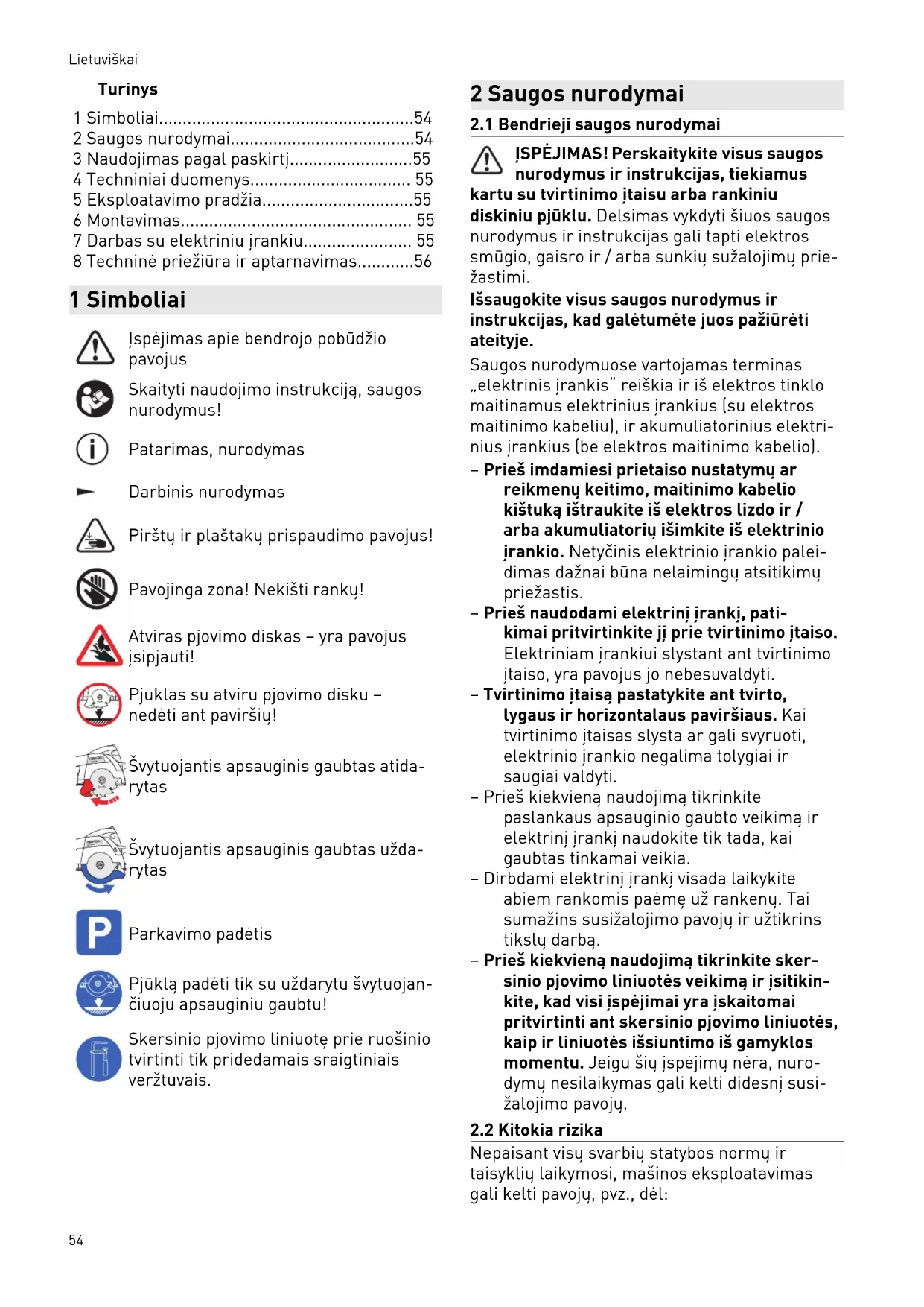 ĮSPĖJIMAS! Perskaitykite visus saugos nurodymus ir instrukcijas, tiekiamus kartu su tvirtinimo įtaisu arba rankiniu diskiniu pjūklu. Delsimas vykdyti šiuos saugos nurodymus ir instrukcijas gali tapti elektros smūgio, gaisro ir / arba sunkių sužalojimų prie žastimi. Išsaugokite visus saugos nurodymus ir instrukcijas, kad galėtumėte juos pažiūrėti ateityje. Saugos nurodymuose vartojamas terminas „elektrinis įrankis“ reiškia ir iš elektros tinklo maitinamus elektrinius įrankius (su elektros maitinimo kabeliu), ir akumuliatorinius elektri nius įrankius (be elektros maitinimo kabelio). – Prieš imdamiesi prietaiso nustatymų ar reikmenų keitimo, maitinimo kabelio kištuką ištraukite iš elektros lizdo ir / arba akumuliatorių išimkite iš elektrinio įrankio. Netyčinis elektrinio įrankio palei dimas dažnai būna nelaimingų atsitikimų priežastis. – Prieš naudodami elektrinį įrankį, pati kimai pritvirtinkite jį prie tvirtinimo įtaiso. Elektriniam įrankiui slystant ant tvirtinimo įtaiso, yra pavojus jo nebesuvaldyti. – Tvirtinimo įtaisą pastatykite ant tvirto, lygaus ir horizontalaus paviršiaus. Kai tvirtinimo įtaisas slysta ar gali svyruoti, elektrinio įrankio negalima tolygiai ir saugiai valdyti. – Prieš kiekvieną naudojimą tikrinkite paslankaus apsauginio gaubto veikimą ir elektrinį įrankį naudokite tik tada, kai gaubtas tinkamai veikia. – Dirbdami elektrinį įrankį visada laikykite abiem rankomis paėmę už rankenų. Tai sumažins susižalojimo pavojų ir užtikrins tikslų darbą. – Prieš kiekvieną naudojimą tikrinkite sker sinio pjovimo liniuotės veikimą ir įsitikin kite, kad visi įspėjimai yra įskaitomai pritvirtinti ant skersinio pjovimo liniuotės, kaip ir liniuotės išsiuntimo iš gamyklos momentu. Jeigu šių įspėjimų nėra, nuro dymų nesilaikymas gali kelti didesnį susi žalojimo pavojų.