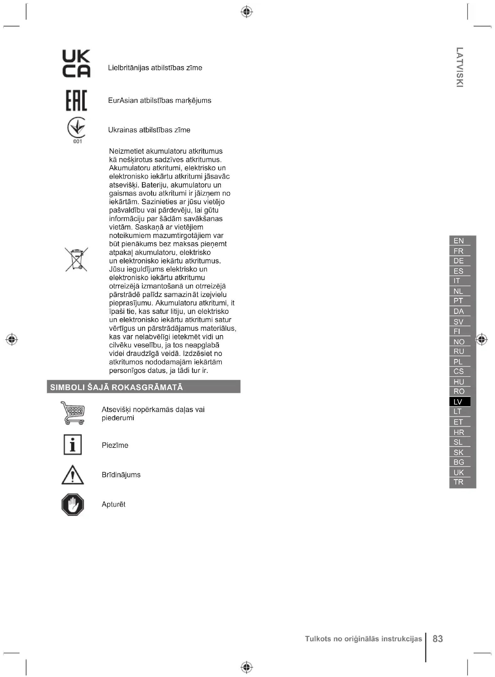 Garantuotas akustinis lygis Europos atitikties ženklas Didžiosios Britanijos atitikties ženklas „EurAsian“ atitikties ženklas88 Originalių instrukcijų vertimas Ukrainos atitikties ženklas Neišmeskite senų akumuliatorių, elektros ir elektroninės įrangos atliekų kartu su nerūšiuotomis komunalinėmis atliekomis. Seni akumuliatoriai, elektros ir elektroninės įrangos atliekas privaloma surinkti atskirai. Senos baterijos, akumuliatoriai ir šviesos šaltinių atliekos turi būti pašalinti iš įrangos. Patarimų dėl perdirbimo ir informacijos apie surinkimo punktus kreipkitės į savo vietos valdžios institucijas. Atsižvelgiant į vietos teisės aktus, mažmenininkai gali būti įpareigoti nemokamai priimti atgal senus akumuliatorius ir elektros bei elektroninės įrangos atliekas. Prisidėdami prie pakartotinio senų akumuliatorių ir elektros bei elektroninės įrangos atliekų panaudojimo ir perdirbimo padedate mažinti žaliavų poreikį. Senuose akumuliatoriuose, ypač tuose, kuriuose yra ličio, elektros ir elektroninės įrangos atliekose yra vertingų ir perdirbimui tinkamų medžiagų, kurios gali turėti neigiamą poveikį aplinkai ir žmonių sveikatai, jei nė ra šalinamos aplinkai nekenksmingu būdu. Ištrinkite senuose prietaisuose esančius asmens duomenis, jei tokių buvo. SIMBOLIAI VADOVE Detalės arba priedai yra parduodami atskirai Pastaba Įspėjimas! StabdytiEESTI
