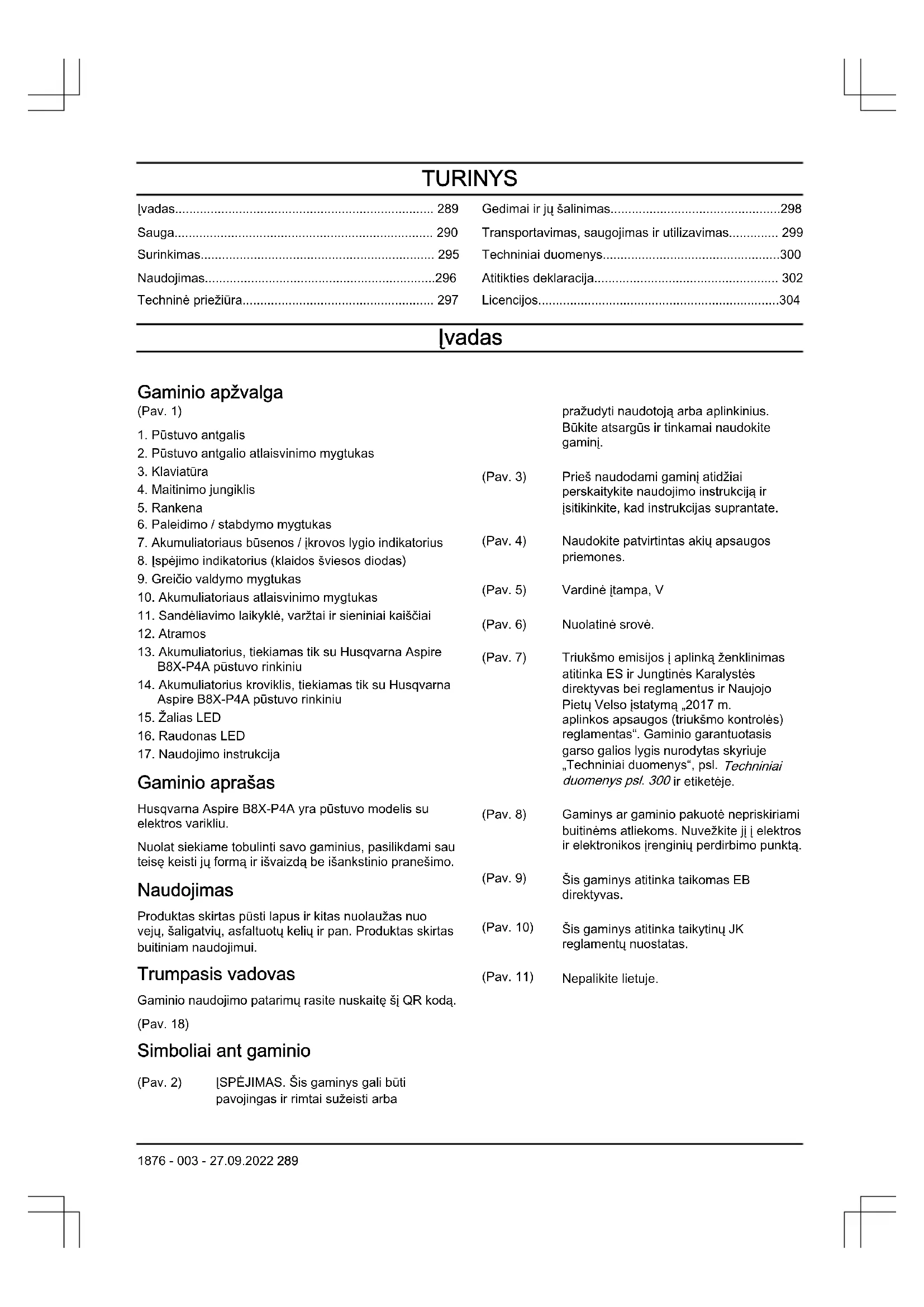 Huskvarna, 2022-06-30 Claes Losdal, Mokslinių tyrimų ir plėtros skyriaus vadovas, „Husqvarna AB“ Atsakingas už techninę dokumentaciją UK Importer: Husqvarna UK Ltd Preston Road, Co. Durham DL5 6UP 1876 - 003 - 27.09.2022 303Licencijos Autorių teisės