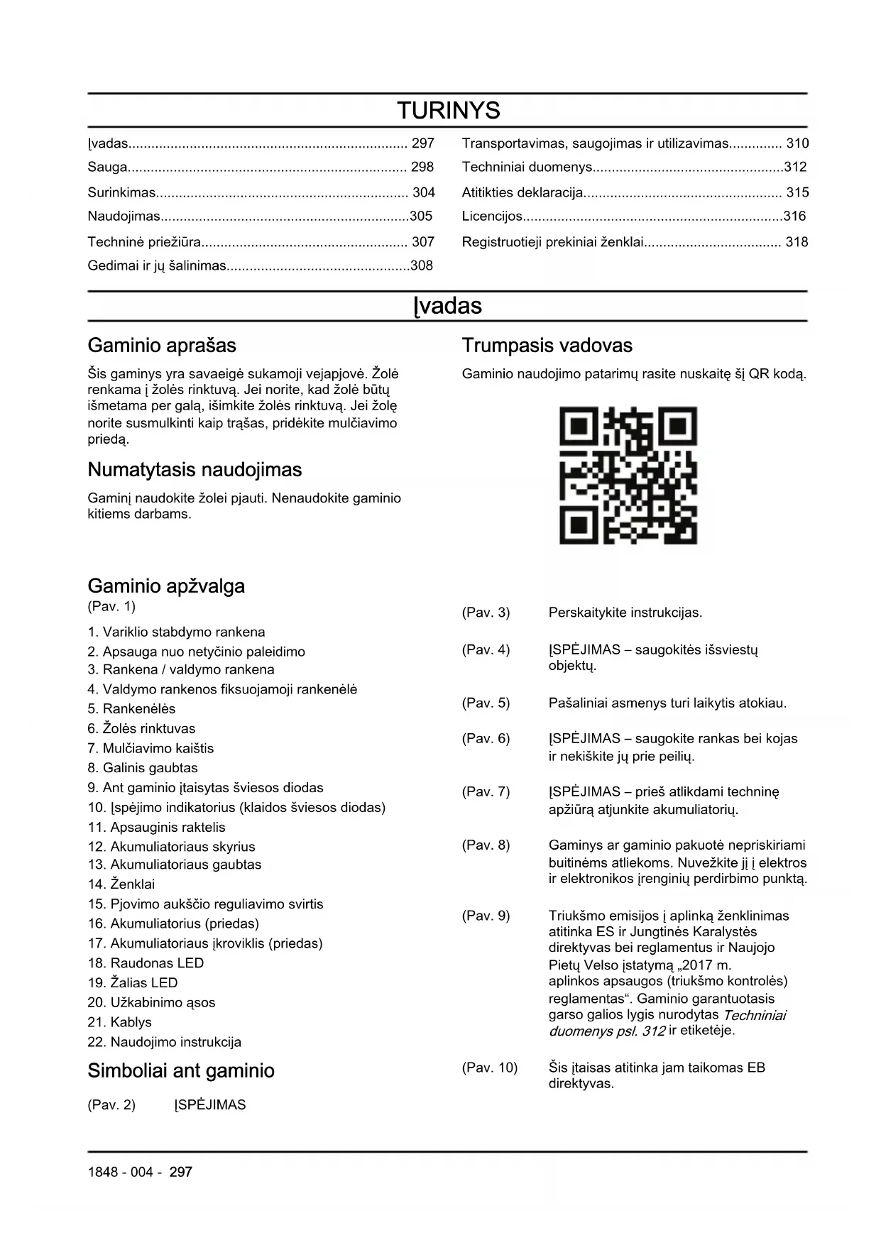 - Registruotieji prekiniai ženklai Įvadas Gaminio aprašas Šis gaminys yra savaeigė sukamoji vejapjovė. Žolė renkama į žolės rinktuvą. Jei norite, kad žolė būtų išmetama per galą, išimkite žolės rinktuvą. Jei žolę norite susmulkinti kaip trąšas, pridėkite mulčiavimo priedą. Numatytasis naudojimas Gaminį naudokite žolei pjauti. Nenaudokite gaminio kitiems darbams. Trumpasis vadovas Gaminio naudojimo patarimų rasite nuskaitę šį QR kodą. Gaminio apžvalga (Pav. 1) p. 318