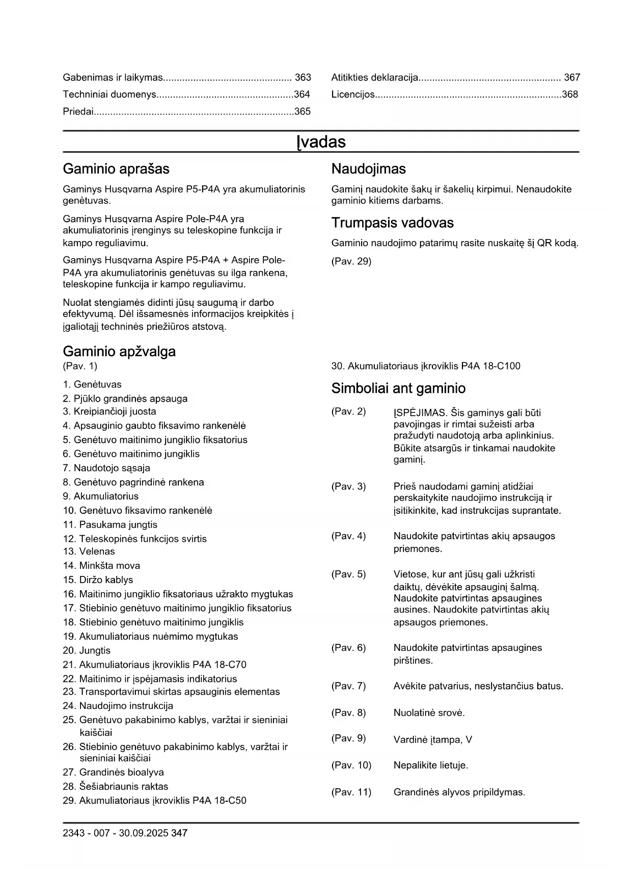 Huskvarna, 2025-10-31 Claes Losdal, Mokslinių tyrimų ir plėtros skyriaus vadovas, „Husqvarna AB“ Atsakingas už techninę dokumentaciją 2343 - 007 - 30.09.2025 367Licencijos Autorių teisės