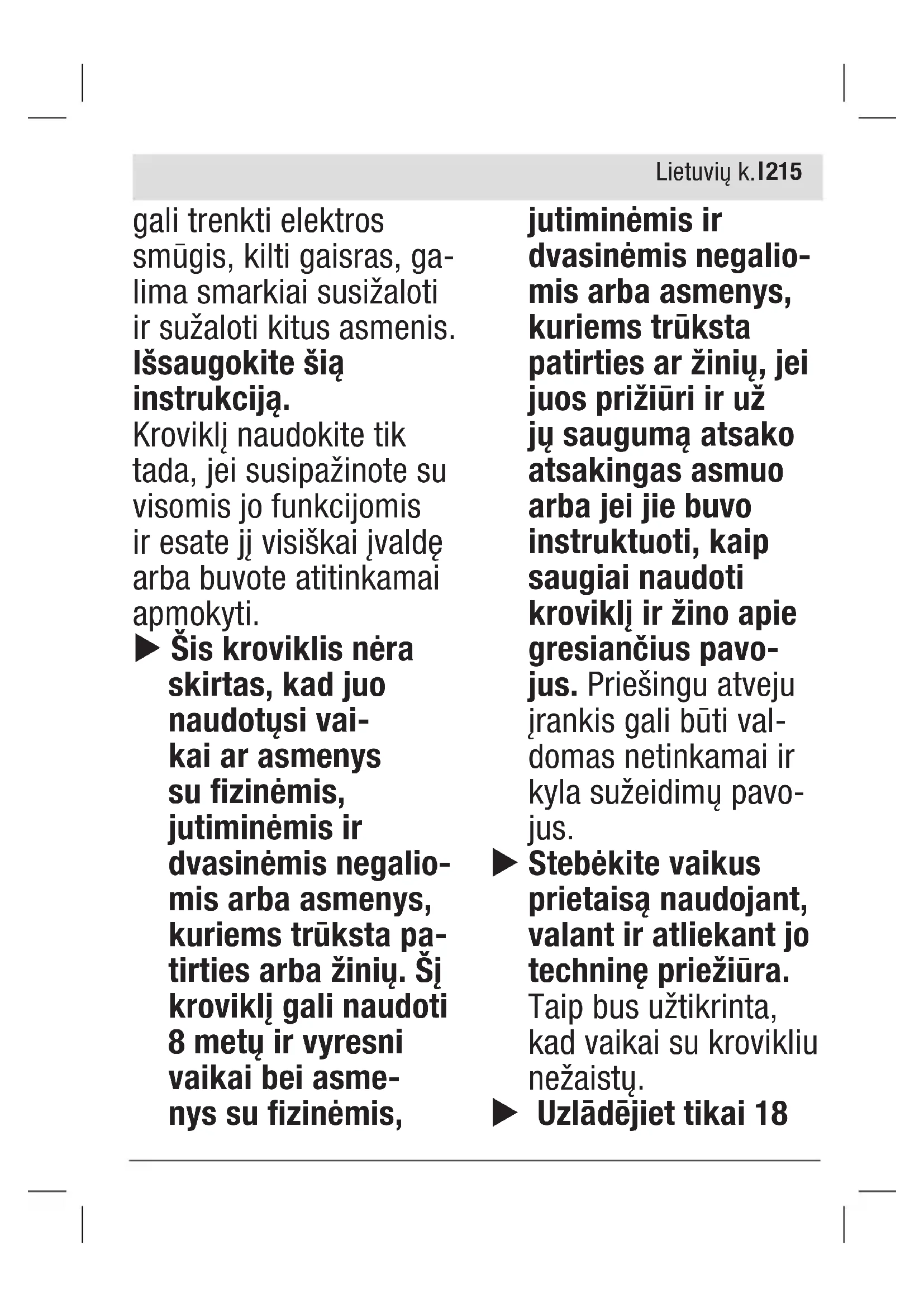 ALL sistēmas akumulatori 1,5 Ah ≈24 ≈33 2,0 Ah ≈32 ≈45 2,5 Ah ≈40 ≈60 3,0 Ah ≈48 ≈72 4,0 Ah ≈64 ≈95 4,0 Ah Power Plus ≈69 ≈88 5,0 Ah ≈80 ≈105 6,0 Ah ≈96 ≈130 atitinka įkrovą ≈ 80 % atitinka visiškos įkrovos būklę Indikatorių reikšmės Mirksi (greitai) žalias įkrovos būklės indikato- rius Apie greitojo įkrovimo procesą praneša greitai mirksintis žalias įkrovos būklės indikatorius (2). Akumuliatorių bet kada galima išimti ir naudoti. Lietuvių k.220 | Kai akumuliatoriaus įkrova pasiekia apie 80 %, žalias įkrovos būklės indikatorius pradeda mirksėti lėčiau. Greitojo įkrovimo procesas baigtas. Jei akumulia- torius lieka kroviklyje, įkrovimo procesas baigiamas mažu greičiu. Mirksi (lėtai) žalias įkrovos būklės indikatorius Kai akumuliatoriaus įkrova apie 80 %, žalias įkrovos būklės indikatorius (2) mirksi lėtai. Akumuliatorių galima išimti ir iškarto naudoti. Akumuliatoriaus įkrovos būklės indikatorius nuolat šviečia žaliai Nuolat šviečiantis žalias įkrovos būklės indikatorius (2) praneša, kad akumuliatorius yra visiškai įkrautas. Akumuliatorių galima išimti ir iš karto naudoti. Jei akumuliatorius neįstatytas, nuolat šviečiantis įkrovos būklės indikatorius (2) praneša, kad į tinklą yra įstatytas kištukas ir kad kroviklis yra paruoštas naudoti. Nuolat šviečiantis rau- donas temperatūros kontrolės indikatorius Nuolat šviečiantis raudonas indikatori- us (1) praneša, kad akumuliatoriaus temperatūra yra už leidžiamosios įkrovimo temperatūros intervalo ribų (0–45 °C). Kai pasiekiamas leidžiamosi- os temperatūros diapazonas, prasideda įkrovimo procesas. Mirksintis raudonas klai- dos indikatorius Mirksintis raudonas indikatorius (1) praneša apie įkrovimo proceso sutrikimą (žr. „Akumuliatorius neįkraunamas“, Puslapis 221). Lietuvių k.| 221 Gedimų šalinimas Akumuliatorius neįkraunamas Akumuliatorius neįkraunamas, raudonas indikatorius (1) mirksi, o žalias įkrovos būklės indikatorius (2) šviečia nuolat. Priežastis: kroviklis nustatė, kad įvyko vidinė klaida Pašalinimas: įsitikinkite, kad visi akumuliatoriai yra visiškai įstatyti. Ištraukite ir vėl įstatykite tinklo kištuką. Atvienojiet elektrotīkla spraudni un ievietojiet. Ja kļūda atkārtojas, uzticiet lādētāja pārbaudi pilnvarotam Husqvarna izstrādājumu pēcpārdošanas apkopes centram.. Priežastis: akumuliatorius netin- kamai įstatytas Pašalinimas: akumuliatorių tinkamai įstatykite į kroviklį. Priežastis: užteršti akumuliatori- aus ir kroviklio kontaktai Pašalinimas: nuvalykite akumu- liatoriaus ir kroviklio kontaktus; pvz., kelis kartus įstatykite ir išimkite akumuliatorių. Priežastis: akumuliatorius pažeistas Pašalinimas: pakeiskite akumuliatorių. Akumuliatorius neįkraunamas, indikatorius (1) šviečia raudo- nai. Priežastis: akumuliatoriaus temperatūra už leidžiamosios įkrovimo temperatūros ribų. Pašalinimas: palaukite, kol akumuliatoriaus temperatūra vėl bus leidžiamosios įkrovimo temperatūros diapazone (0–45 °C). Indikatoriai nešviečia Nešviečia joks indikatorius, akumuliatorius neįkraunamas. Priežastis: pažeistas kištukinis Lietuvių k.222 | lizdas, maitinimo laidas arba kroviklis Pašalinimas: patikrinkite tinklo įtampą. Kreipkitės į įgaliotas specializuotas dirbtuves, kad patikrintų kroviklį. Priežastis: neįkištas (netinkamai įkištas) kroviklio kištukas Pašalinimas: į kištukinį lizdą (tinkamai) įstatykite kištuką. Šalinimas Krovikliai, papildoma įranga ir pakuotės turi būti ekologiškai utilizuojami. Nemeskite kroviklių į buitinių atliekų konteineri- us! Tik ES šalims: Pagal Europos direktyvą 2012/19/ ES dėl elektros ir elektroninės įrangos atliekų ir šios direktyvos perkėlimo į nacionalinę teisę aktus, naudoti nebetinkami kro- vikliai turi būti surenkami atskirai ir perdirbami aplinkai nekenks- mingu būdu. Netinkamai pašalintos elektros ir elektroninės įrangos atliekos dėl galimų pavojingų medžiagų gali turėti žalingą poveikį aplinkai ir žmonių sveikatai. Lietuvių k.| 223