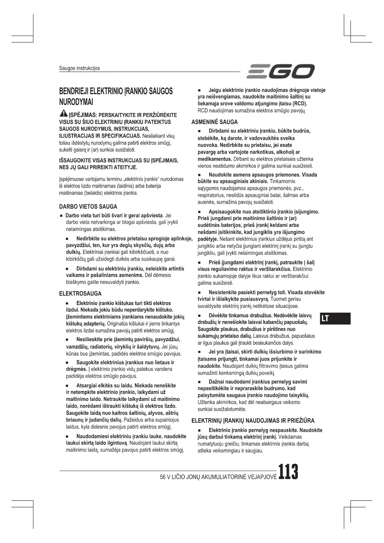 ◾ Darbo vieta turi būti švari ir gerai apšviesta. Jei darbo vieta netvarkinga ar blogai apšviesta, gali įvykti nelaimingas atsitikimas. ◾ Nedirbkite su elektros prietaisu sprogioje aplinkoje, pavyzdžiui, ten, kur yra degių skysčių, dujų arba dulkių. Elektriniai įrankiai gali kibirkščiuoti, o nuo kibirkščių gali užsidegti dulkės arba susikaupę garai. ◾ Dirbdami su elektriniu įrankiu, neleiskite artintis vaikams ir pašaliniams asmenims. Dėl dėmesio blaškymo galite nesuvaldyti įrankio. ELEKTROSAUGA ◾ Elektrinio įrankio kištukas turi tikti elektros lizdui. Niekada jokiu būdu neperdarykite kištuko. Įžemintiems elektriniams įrankiams nenaudokite jokių kištukų adapterių. Originalūs kištukai ir jiems tinkantys elektros lizdai sumažina pavojų patirti elektros smūgį. ◾ Nesilieskite prie įžemintų paviršių, pavyzdžiui, vamzdžių, radiatorių, viryklių ir šaldytuvų. Jei jūsų kūnas bus įžemintas, padidės elektros smūgio pavojus. ◾ Saugokite elektrinius įrankius nuo lietaus ir drėgmės. Į elektrinio įrankio vidų patekus vandens padidėja elektros smūgio pavojus. ◾ Atsargiai elkitės su laidu. Niekada neneškite ir netempkite elektrinio įrankio, laikydami už maitinimo laido. Netraukite laikydami už maitinimo laido, norėdami ištraukti kištuką iš elektros lizdo. Saugokite laidą nuo kaitros šaltinių, alyvos, aštrių briaunų ir judančių dalių. Pažeidus arba supainiojus laidus, kyla didesnis pavojus patirti elektros smūgį. ◾ Naudodamiesi elektriniu įrankiu lauke, naudokite laukui skirtą laido ilgintuvą. Naudojant laukui skirtą maitinimo laidą, sumažėja pavojus patirti elektros smūgį. ◾ Jeigu elektrinio įrankio naudojimas drėgnoje vietoje yra neišvengiamas, naudokite maitinimo šaltinį su liekamąja srove valdomu atjungimo įtaisu (RCD). RCD naudojimas sumažina elektros smūgio pavojų. ASMENINĖ SAUGA ◾ Dirbdami su elektriniu įrankiu, būkite budrūs, stebėkite, ką darote, ir vadovaukitės sveika nuovoka. Nedirbkite su prietaisu, jei esate pavargę arba vartojote narkotikus, alkoholį ar medikamentus. Dirbant su elektros prietaisais užtenka vienos neatidumo akimirkos ir galima sunkiai susižeisti. ◾ Naudokite asmens apsaugos priemones. Visada būkite su apsauginiais akiniais. Tinkamomis sąlygomis naudojamos apsaugos priemonės, pvz., respiratorius, neslidūs apsauginiai batai, šalmas arba ausinės, sumažina pavojų susižaloti. ◾ Apsisaugokite nuo atsitiktinio įrankio įsijungimo. Prieš jungdami prie maitinimo šaltinio ir (ar) sudėtinės baterijos, prieš įrankį keldami arba nešdami įsitikinkite, kad jungiklis yra išjungimo padėtyje. Nešant elektrinius įrankius uždėjus pirštą ant jungiklio arba netyčia įjungiant elektrinį įrankį su įjungtu jungikliu, gali įvykti nelaimingas atsitikimas. ◾ Prieš įjungdami elektrinį įrankį, patraukite į šalį visus reguliavimo raktus ir veržliarakčius. Elektrinio įrankio sukamojoje dalyje likus raktui ar veržliarakčiui galima susižeisti. ◾ Nesistenkite pasiekti pernelyg toli. Visada stovėkite tvirtai ir išlaikykite pusiausvyrą. Tuomet geriau suvaldysite elektrinį įrankį netikėtose situacijose. ◾ Dėvėkite tinkamus drabužius. Nedėvėkite laisvų drabužių ir nenešiokite laisvai kabančių papuošalų. Saugokite plaukus, drabužius ir pirštines nuo sukamųjų prietaiso dalių. Laisvus drabužius, papuošalus ar ilgus plaukus gali įtraukti besisukančios dalys. ◾ Jei yra įtaisai, skirti dulkių išsiurbimo ir surinkimo įtaisams prijungti, tinkamai juos prijunkite ir naudokite. Naudojant dulkių ltravimo įtaisus galima sumažinti kenksmingą dulkių poveikį. ◾ Dažnai naudodami įrankius pernelyg savimi nepasitikėkite ir nepraraskite budrumo, kad paisytumėte saugaus įrankio naudojimo taisyklių. Užtenka akimirkos, kad dėl neatsargaus veiksmo sunkiai susižalotumėte. ELEKTRINIŲ ĮRANKIŲ NAUDOJIMAS IR PRIEŽIŪRA ◾ Elektrinio įrankio pernelyg nespauskite. Naudokite jūsų darbui tinkamą elektrinį įrankį. Veikdamas numatytuoju greičiu, tinkamas elektrinis įrankis darbą atlieka veiksmingiau ir saugiau.Saugos instrukcijos56 V LIČIO JONŲ AKUMULIATORINĖ VEJAPJOVĖ114