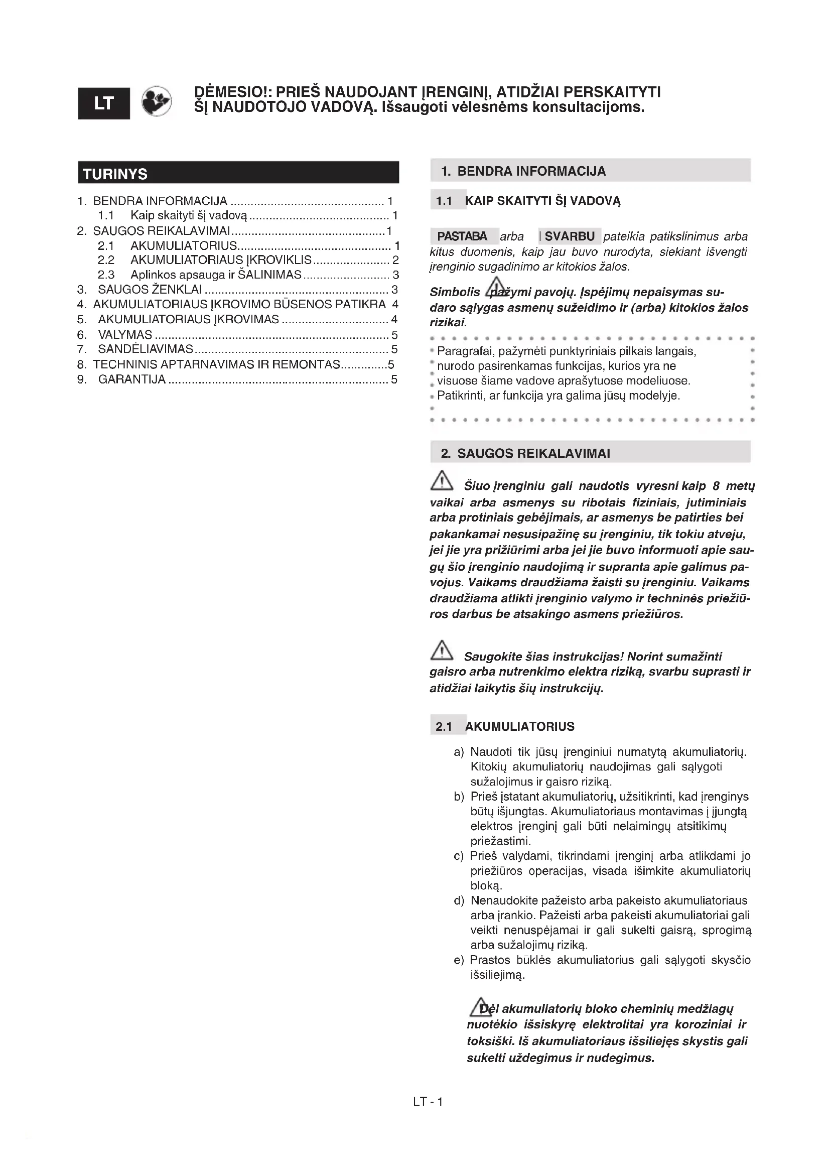 a) Naudoti tik jūsų įrenginiui numatytą akumuliatorių. Kitokių akumuliatorių naudojimas gali sąlygoti sužalojimus ir gaisro riziką. b) Prieš įstatant akumuliatorių, užsitikrinti, kad įrenginys būtų išjungtas. Akumuliatoriaus montavimas į įjungtą elektros įrenginį gali būti nelaimingų atsitikimų priežastimi. c) Prieš valydami, tikrindami įrenginį arba atlikdami jo priežiūros operacijas, visada išimkite akumuliatorių bloką. d) Nenaudokite pažeisto arba pakeisto akumuliatoriaus arba įrankio. Pažeisti arba pakeisti akumuliatoriai gali veikti nenuspėjamai ir gali sukelti gaisrą, sprogimą arba sužalojimų riziką. e) Prastos būklės akumuliatorius gali sąlygoti skysčio išsiliejimą. Dėl akumuliatorių bloko cheminių medžiagų nuotėkio išsiskyrę elektrolitai yra koroziniai ir toksiški. Iš akumuliatoriaus išsiliejęs skystis gali sukelti uždegimus ir nudegimus. DĖMESIO!: PRIEŠ NAUDOJANT ĮRENGINĮ, ATIDŽIAI PERSKAITYTI ŠĮ NAUDOTOJO VADOVĄ. Išsaugoti vėlesnėms konsultacijoms.