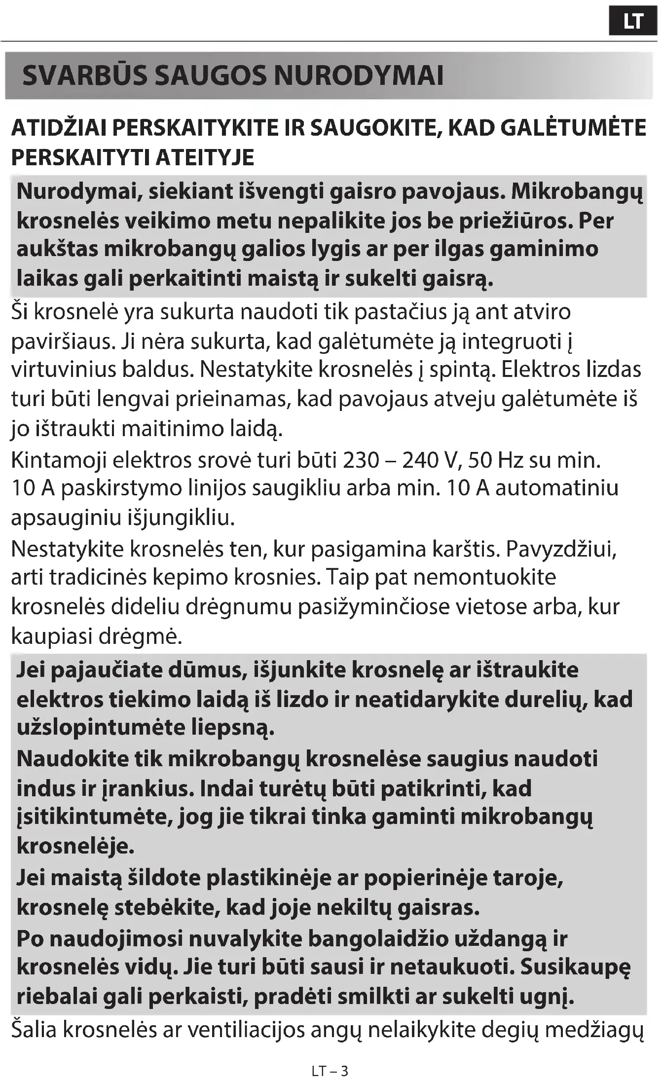 ATIDŽIAI PERSKAITYKITE IR SAUGOKITE, KAD GALĖTUMĖTE PERSKAITYTI ATEITYJE Nurodymai, siekiant išvengti gaisro pavojaus. Mikrobangų krosnelės veikimo metu nepalikite jos be priežiūros. Per aukštas mikrobangų galios lygis ar per ilgas gaminimo laikas gali perkaitinti maistą ir sukelti gaisrą. Ši krosnelė yra sukurta naudoti tik pastačius ją ant atviro paviršiaus. Ji nėra sukurta, kad galėtumėte ją integruoti į virtuvinius baldus. Nestatykite krosnelės į spintą. Elektros lizdas turi būti lengvai prieinamas, kad pavojaus atveju galėtumėte iš jo ištraukti maitinimo laidą. Kintamoji elektros srovė turi būti 230 – 240 V, 50 Hz su min. 10 A paskirstymo linijos saugikliu arba min. 10 A automatiniu apsauginiu išjungikliu. Nestatykite krosnelės ten, kur pasigamina karštis. Pavyzdžiui, arti tradicinės kepimo krosnies. Taip pat nemontuokite krosnelės dideliu drėgnumu pasižyminčiose vietose arba, kur kaupiasi drėgmė. Jei pajaučiate dūmus, išjunkite krosnelę ar ištraukite elektros tiekimo laidą iš lizdo ir neatidarykite durelių, kad užslopintumėte liepsną. Naudokite tik mikrobangų krosnelėse saugius naudoti indus ir įrankius. Indai turėtų būti patikrinti, kad įsitikintumėte, jog jie tikrai tinka gaminti mikrobangų krosnelėje. Jei maistą šildote plastikinėje ar popierinėje taroje, krosnelę stebėkite, kad joje nekiltų gaisras. Po naudojimosi nuvalykite bangolaidžio uždangą ir krosnelės vidų. Jie turi būti sausi ir netaukuoti. Susikaupę riebalai gali perkaisti, pradėti smilkti ar sukelti ugnį. Šalia krosnelės ar ventiliacijos angų nelaikykite degių medžiagų LT – 2LT – 2 ATSARGOS PRIEMONĖS, SIEKIANT IŠVENGTI GALIMO MIKROBANGŲ ENERGIJOS POVEIKIO