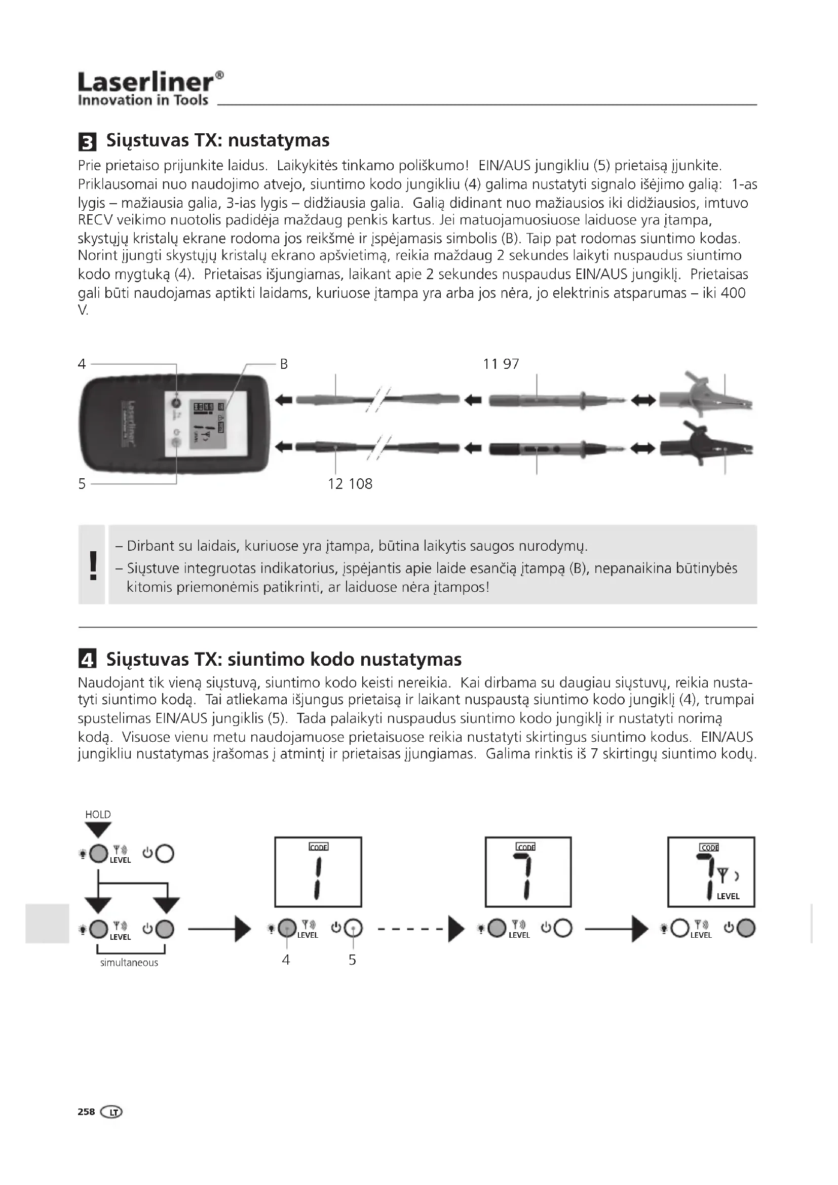 simultaneous HOLD CODE LEVELLEVELLEVELLEVEL CODE LEVEL CODE LEVEL Prie prietaiso prijunkite laidus. Laikykitŏs tinkamo poliškumo! EIN/AUS jungikliu (5) prietaisŅ řjunkite. Priklausomai nuo naudojimo atvejo, siuntimo kodo jungikliu (4) galima nustatyti signalo išŏjimo galiŅ: 1-as lygis – mažiausia galia, 3-ias lygis – didžiausia galia. GaliŅ didinant nuo mažiausios iki didžiausios, imtuvo RECV veikimo nuotolis padidŏja maždaug penkis kartus. Jei matuojamuosiuose laiduose yra řtampa, skystŸjŸ kristalŸ ekrane rodoma jos reikšmŏ ir řspŏjamasis simbolis (B). Taip pat rodomas siuntimo kodas. Norint řjungti skystŸjŸ kristalŸ ekrano apšvietimŅ, reikia maždaug 2 sekundes laikyti nuspaudus siuntimo kodo mygtukŅ (4). Prietaisas išjungiamas, laikant apie 2 sekundes nuspaudus EIN/AUS jungiklř. Prietaisas gali bŴti naudojamas aptikti laidams, kuriuose řtampa yra arba jos nŏra, jo elektrinis atsparumas – iki 400