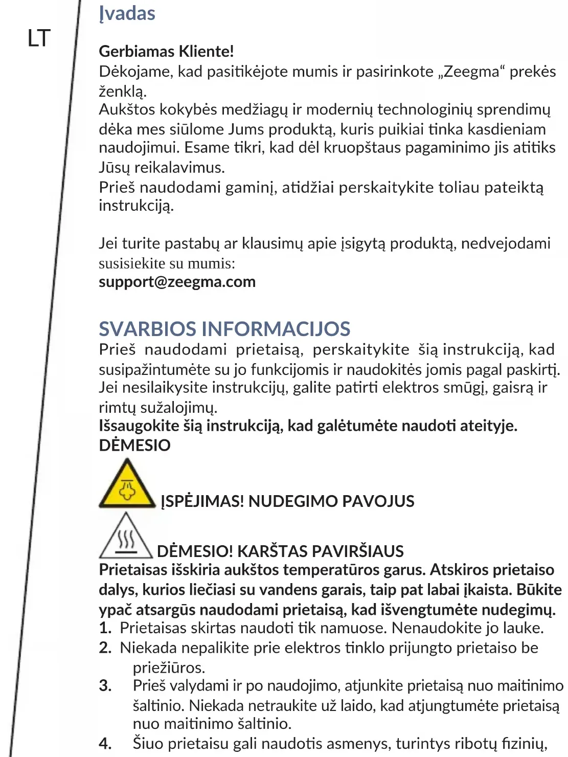 Ручний пароочисник, трубу та голівку треба очищувати м’якою сухою тканиною. Фотографії служать лише для ілюстрації, фактичний зовнішній вигляд виробів може відрізнятися від представленого на фото.LT Įvadas Gerbiamas Kliente! Dėkojame, kad pasikėjote mumis ir pasirinkote „Zeegma“ prekės ženklą. Aukštos kokybės medžiagų ir modernių technologinių sprendimų dėka mes siūlome Jums produktą, kuris puikiai nka kasdieniam naudojimui. Esame kri, kad dėl kruopštaus pagaminimo jis aks Jūsų reikalavimus. Prieš naudodami gaminį, adžiai perskaitykite toliau pateiktą instrukciją. Jei turite pastabų ar klausimų apie įsigytą produktą, nedvejodami susisiekite su mumis: support@zeegma.com SVARBIOS INFORMACIJOS Prieš naudodami prietaisą, perskaitykite šią instrukciją, kad susipažintumėte su jo funkcijomis ir naudokitės jomis pagal paskir. Jei nesilaikysite instrukcijų, galite par elektros smūgį, gaisrą ir rimtų sužalojimų. Išsaugokite šią instrukciją, kad galėtumėte naudo ateityje. DĖMESIO