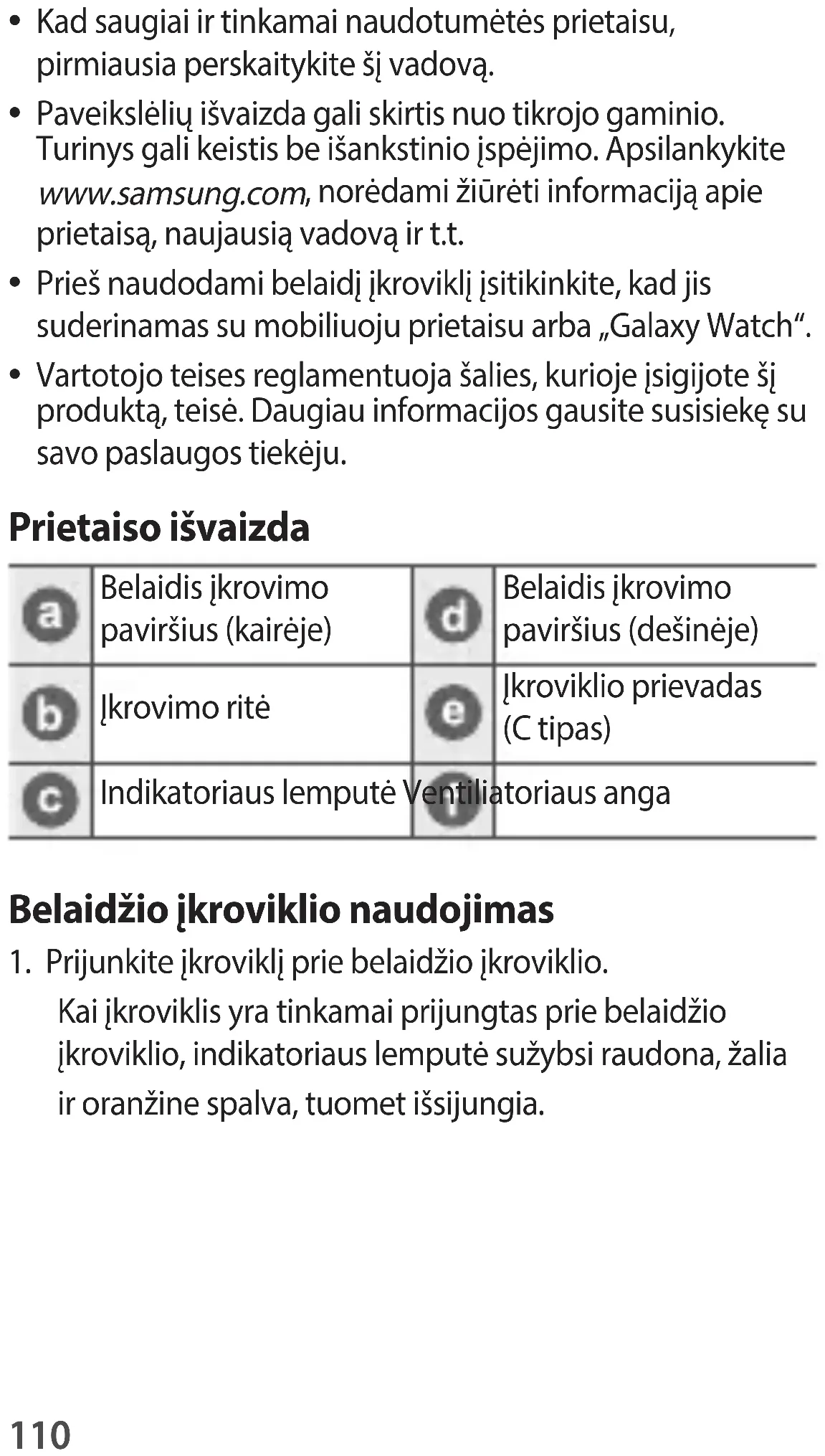 Indikatoriaus lemputė gali veikti skirtingai, priklausomai nuo mobiliojo prietaiso, belaidžio įkrovimo dangtelio arba „Galaxy Watch“.115 Lietuvių kalba Greitasis belaidis įkrovimas Norėdami pradėti greitąjį belaidį įkrovimą, padėkite greitojo belaidžio įkrovimo funkciją palaikantį mobilųjį prietaisą ant belaidžio įkroviklio. Daugiau informacijos rasite mobiliojo prietaiso naudotojo vadove. Naudokite tik „Samsung“ patvirtintą, su prietaisu teikiamą įkroviklį (12 V / 2,1 A).
