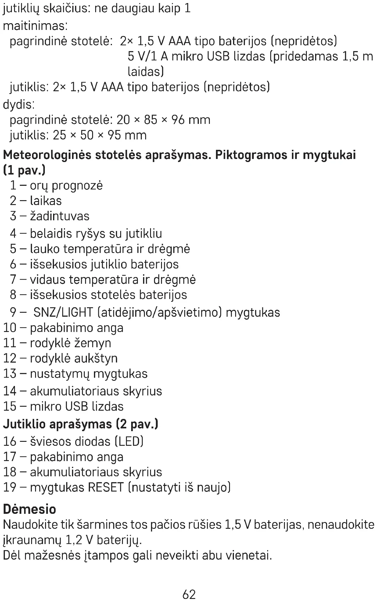 baterijas įsitikinkite, kad poliškumas teisingas, nes taip išvengsite meteorologinės stotelės ir jutiklių pažeidimo.