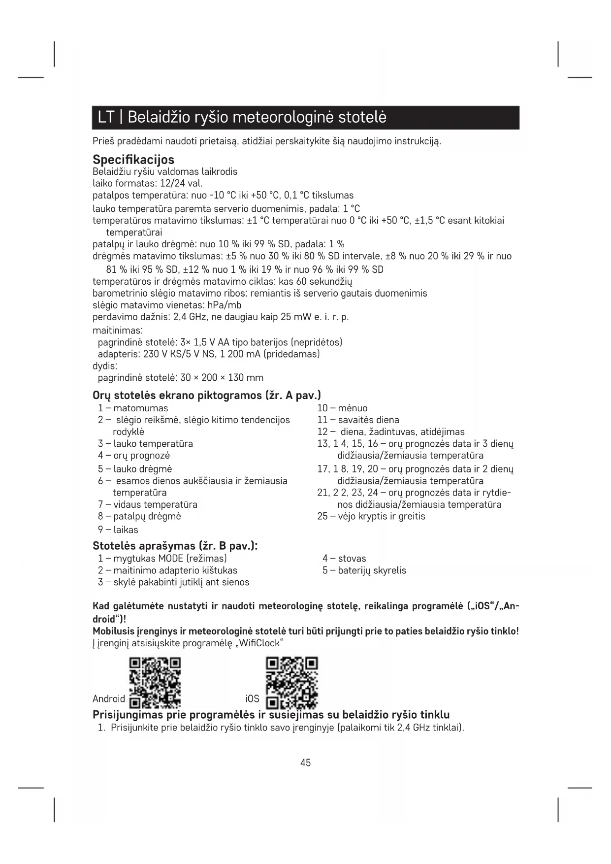 - Acest aparat nu este destinat utilizării de către persoane (inclusiv copii) a căror capacitate zică, senzorială sau mentală, ori experiența și cunoștințele insuciente împiedică utilizarea aparatului în siguranță, dacă nu vor supravegheate sau dacă nu au fost instruite privind utilizarea aparatului de către persoana responsabilă de securitatea acestora. Prin prezenta, EMOS spol. s r. o. declară că tipul de echipamente radio E0389 este în conformitate cu Directiva 2014/53/UE. Textul integral al declarației UE de conformitate este disponibil la următoarea adresă internet: http://www.emos.eu/download.45 LT | Belaidžio ryšio meteorologinė stotelė Prieš pradėdami naudoti prietaisą, atidžiai perskaitykite šią naudojimo instrukciją. Specikacijos Belaidžiu ryšiu valdomas laikrodis laiko formatas: 12/24 val. patalpos temperatūra: nuo -10 °C iki +50 °C, 0,1 °C tikslumas lauko temperatūra paremta serverio duomenimis, padala: 1 °C temperatūros matavimo tikslumas: ±1 °C temperatūrai nuo 0 °C iki +50 °C, ±1,5 °C esant kitokiai temperatūrai patalpų ir lauko drėgmė: nuo 10 % iki 99 % SD, padala: 1 % drėgmės matavimo tikslumas: ±5 % nuo 30 % iki 80 % SD intervale, ±8 % nuo 20 % iki 29 % ir nuo 81 % iki 95 % SD, ±12 % nuo 1 % iki 19 % ir nuo 96 % iki 99 % SD temperatūros ir drėgmės matavimo ciklas: kas 60 sekundžių barometrinio slėgio matavimo ribos: remiantis iš serverio gautais duomenimis slėgio matavimo vienetas: hPa/mb perdavimo dažnis: 2,4 GHz, ne daugiau kaip 25 mW e. i. r. p. maitinimas: pagrindinė stotelė: 3× 1,5 V AA tipo baterijos (nepridėtos) adapteris: 230 V KS/5 V NS, 1 200 mA (pridedamas) dydis: pagrindinė stotelė: 30 × 200 × 130 mm Orų stotelės ekrano piktogramos (žr. A pav.) 1 – matomumas 2 – slėgio reikšmė, slėgio kitimo tendencijos rodyklė 3 – lauko temperatūra 4 – orų prognozė 5 – lauko drėgmė 6 – esamos dienos aukščiausia ir žemiausia temperatūra 7 – vidaus temperatūra 8 – patalpų drėgmė 9 – laikas 10 – mėnuo 11 – savaitės diena 12 – diena, žadintuvas, atidėjimas 13, 1 4, 15, 16 – orų prognozės data ir 3 dienų didžiausia/žemiausia temperatūra 17, 1 8, 19, 20 – orų prognozės data ir 2 dienų didžiausia/žemiausia temperatūra 21, 2 2, 23, 24 – orų prognozės data ir rytdie- nos didžiausia/žemiausia temperatūra 25 – vėjo kryptis ir greitis Stotelės aprašymas (žr. B pav.): 1 – mygtukas MODE (režimas) 2 – maitinimo adapterio kištukas 3 – skylė pakabinti jutiklį ant sienos 4 – stovas 5 – baterijų skyrelis Kad galėtumėte nustatyti ir naudoti meteorologinę stotelę, reikalinga programėlė („iOS“/„An- droid“)! Mobilusis įrenginys ir meteorologinė stotelė turi būti prijungti prie to paties belaidžio ryšio tinklo! Į įrenginį atsisiųskite programėlę „WiClock“ Android iOS Prisijungimas prie programėlės ir susiejimas su belaidžio ryšio tinklu