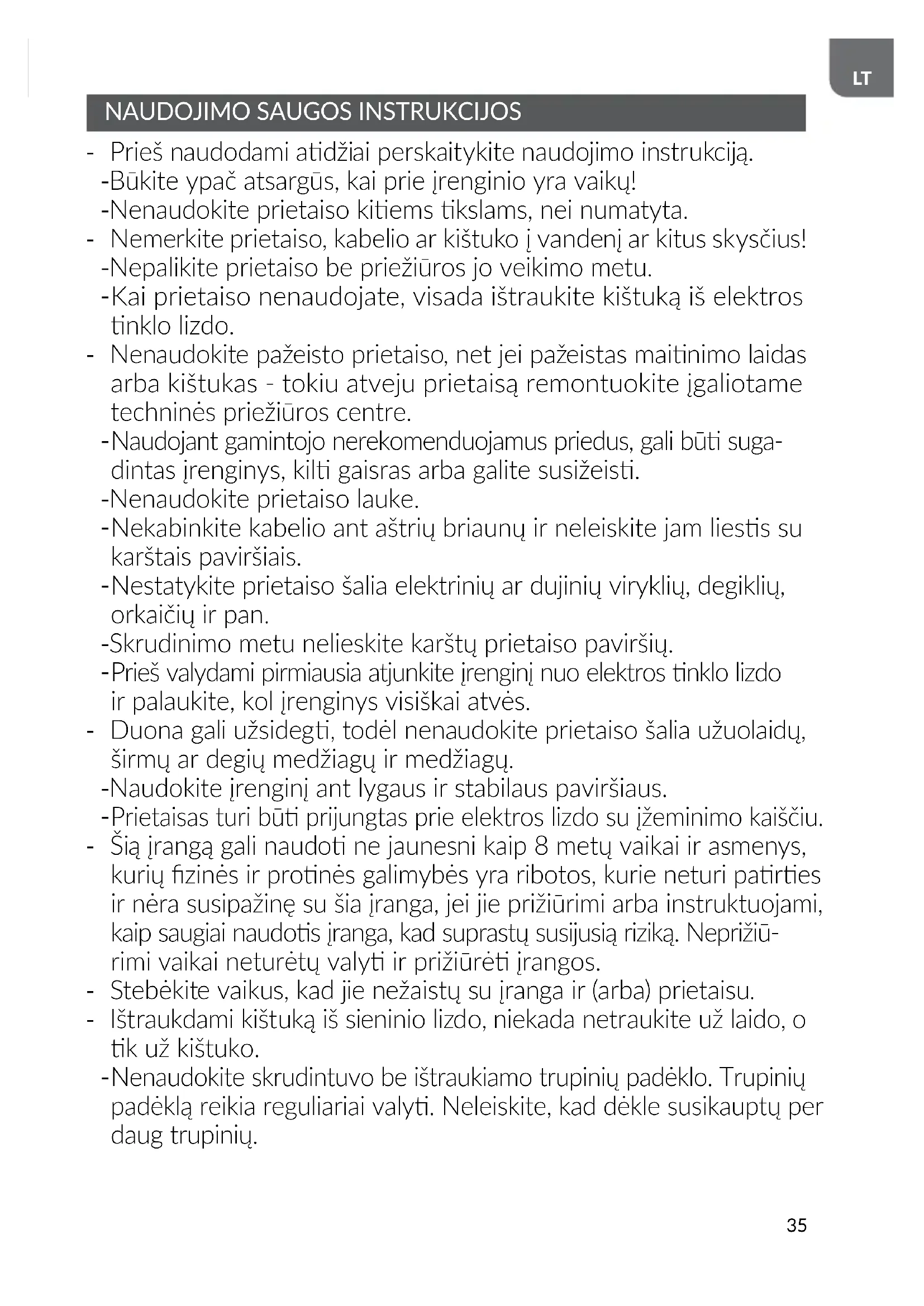 - Prieš naudodami adžiai perskaitykite naudojimo instrukciją. - Būkite ypač atsargūs, kai prie įrenginio yra vaikų! - Nenaudokite prietaiso kiems kslams, nei numatyta. - Nemerkite prietaiso, kabelio ar kištuko į vandenį ar kitus skysčius! - Nepalikite prietaiso be priežiūros jo veikimo metu.