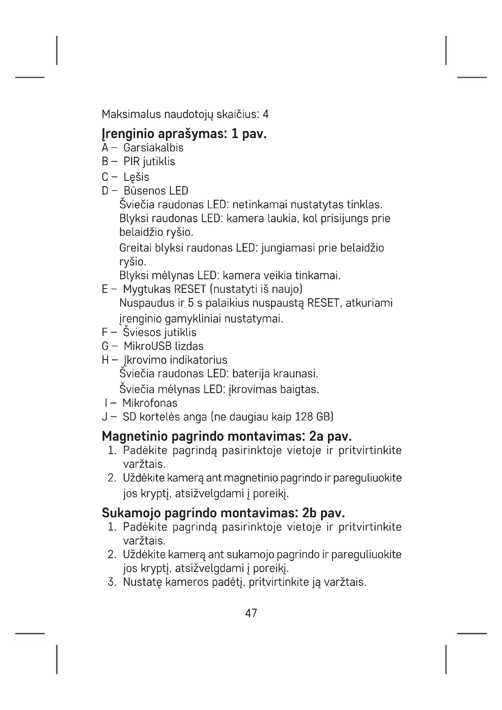 „EMOS GoSmart“ programėlės įdiegimas: 3 pav. Ši programėlė skirta „Android“ ir „iOS“ ir ją galima atsisiųsti iš „Google play“ arba „App Store“. Nuskenuokite atitinkamą QR kodą ir atsisiųskite programėlę. Maršrutizatoriaus nustatymas: 4 pav. Kamera palaiko tik 2,4 GHz belaidį ryšį (ne 5 GHz). Mobilioji programėlė: „EMOS GoSmart“: 5a pav. Atidarykite „EMOS GoSmart“ ir patvirtinkite privatumo politiką paliesdami „sutinku“. 5b pav. Pasirinkite „užsiregistruoti“. 5c pav. Įveskite galiojantį el. pašto adresą ir pasirinkite slaptažodį. Patvirtinkite privatumo politiką paliesdami „sutinku“. Pasirinkite „prisijungti“. 6a pav. Pasirinkite „pridėti prietaisą“. 6b pav. Pasirinkite atitinkamą gaminio kategoriją. 6c pav. Pasirinkite tinkamą gaminio tipą. 6d pav. Prijunkite įrenginį prie maitinimo. 6e pav. Įsitikinkite, kad blyksi įrenginio LED. Patvirtinkite paliesdami „toliau“. 6f pav. Įveskite belaidžio ryšio tinklo pavadinimą ir slaptažodį. Patvirtinkite paliesdami „toliau“. 6g pav. Jūsų įrenginio ekrane atsiras QR kodas. Laikykite QR kodą priešais kameros lęšį.49 Patvirtinkite, kad išgirdote garsinį signalą, reiškiantį, jog susiejimas pavyko sėkmingai. 6h pav. Įrenginys bus aptiktas automatiškai. 6i pav. Įrenginys rastas. Patvirtinkite paliesdami „atlikta“. Junglumas: belaidis ryšys 2,4 GHz IEEE 802,11 b/g/n Dažnio juosta: 2,400–2,4835 GHz Aš, EMOS spol. s r.o. patvirtinu, kad radijo įrenginių tipas H4053 atitinka Direktyvą 2014/53/ES. Visas ES atitikties deklaracijos tekstas prieinamas šiuo interneto adresu: http://www.emos. eu/download. Nemeskite kartu su buitinėmis atliekomis. Pristatykite į specialius rūšiuojamoms atliekoms skirtus surinkimo punktus. Susisiekite su vietinėmis valdžios institucijo- mis, kad šios suteiktų informaciją apie surinkimo punktus. Jei elektroniniai prietaisai yra išmetami at- liekų užkasimo vietose, kenksmingos medžiagos gali patekti į gruntinius vandenis, o paskui ir į maisto grandinę, ir tokiu būdu pakenkti žmonių sveikatai. LV | Cameră IP Komplektācija Kameras iekārta / Strāvas adapters / USB kabelis / Magnētis- kais stiprinājums / Rotējošais stiprinājums / Skrūvju komplekts / Lietošanas instrukcija Tehniskā specikācija Strāvas padeve: 5 V/1 A līdzstrāva Izmēri: 58 × 58 × 94 mm50 Neto svars: 225 g Izšķirtspēja: 1 920 × 1 080 Sensors: 1/2,9 collu 2 megapikseļu CMOS Baterijas kapacitāte: 9 600 mAh PIR detektora diapazons: 9 m PIR leņķis: 120° Objektīvs: 3,2 mm, F2,0 Uzglabāšana: SD karte (maks. 128 GB), mākoņkrātuve Elektroiekārtas korpusa aizsargātības pakāpe: IP65 APP: EMOS GoSmart operētājsistēmai Android un iOS Savienojums: 2,4 GHz WIFI (IEEE 802.11b/g/n) Maksimālais lietotāju skaits: 4 Ierīces apraksts: 1. att. A – Skaļrunis B – PIR sensors C – Objektīvs D – Statusa LED indikators LED indikators deg sarkanā krāsā: tīkls ir iestatīts nepareizi. LED indikators mirgo sarkanā krāsā: kamera gaida savienojumu ar Wi-Fi. LED indikators ātri mirgo sarkanā krāsā: pašlaik tiek izveidots savienojums ar Wi-Fi. LED indikators deg zilā krāsā: kamera darbojas pareizi. E – Poga “RESET” (Atiestatīšana) Nospiežot un piecas sekundes turot nospiestu pogu “RE- SET”, ierīce tiek atiestatīta uz rūpnīcas iestatījumiem. F – Gaismas sensors G – Mikro USB pieslēgvieta H – Uzlādes indikators LED indikators deg sarkanā krāsā: akumulatora uzlāde. LED indikators deg zilā krāsā: uzlāde ir pabeigta. I – Mikrofons J – SD kartes slots (maks. 128 GB)51 Magnētiskā stiprinājuma uzstādīšana: 2.a att.