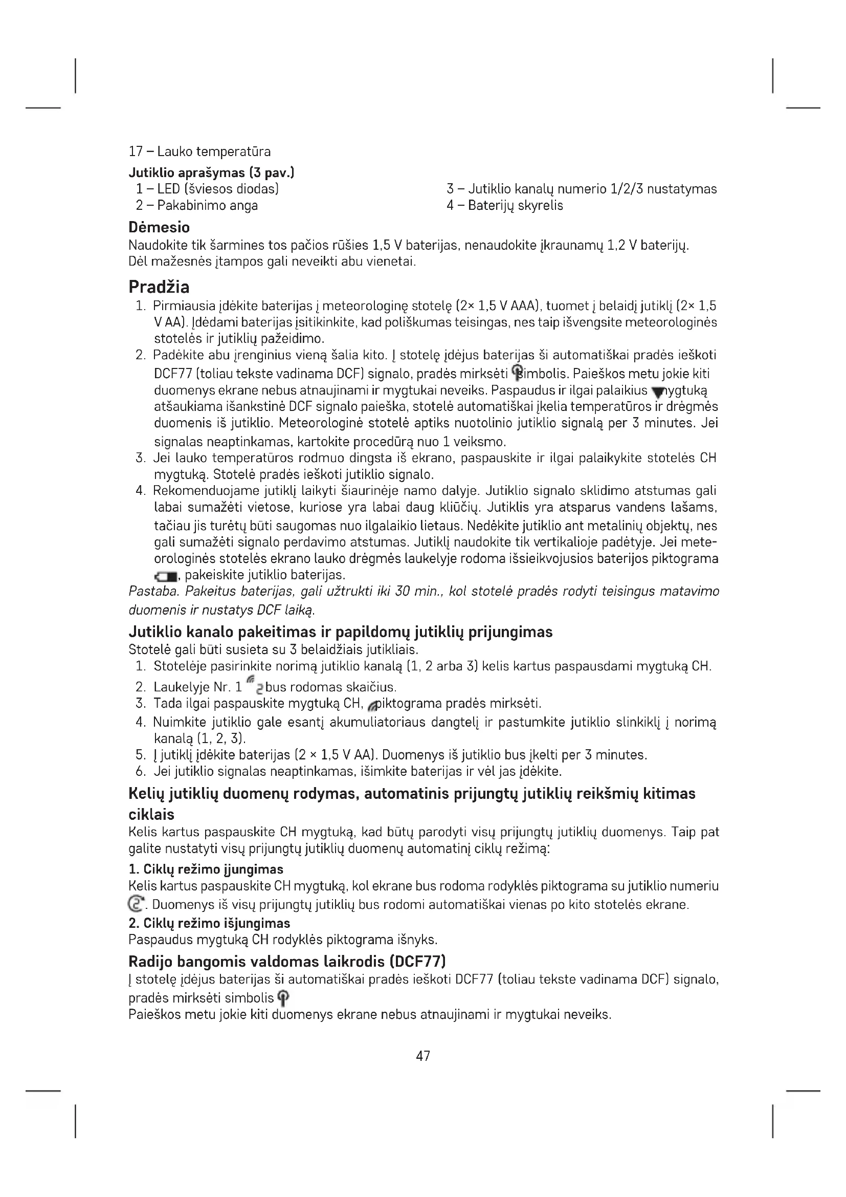 Paspaudus mygtuką CH rodyklės piktograma išnyks. Radijo bangomis valdomas laikrodis (DCF77) Į stotelę įdėjus baterijas ši automatiškai pradės ieškoti DCF77 (toliau tekste vadinama DCF) signalo, pradės mirksėti simbolis . Paieškos metu jokie kiti duomenys ekrane nebus atnaujinami ir mygtukai neveiks.48 Paspaudus ir ilgai palaikius mygtuką , atšaukiama išankstinė DCF signalo paieška, stotelė automa- tiškai įkelia temperatūros ir drėgmės duomenis iš jutiklio. Aptikus DCF signalą, piktograma nustoja mirksėti, kartu tu piktograma rodomas dabartinis laikas ir data. DCF signalas neaptiktas – DCF simbolis nerodomas. Norėdami pakartoti DCF signalo paiešką (3–8 min.) paspauskite ir ilgai palaikykite mygtuką