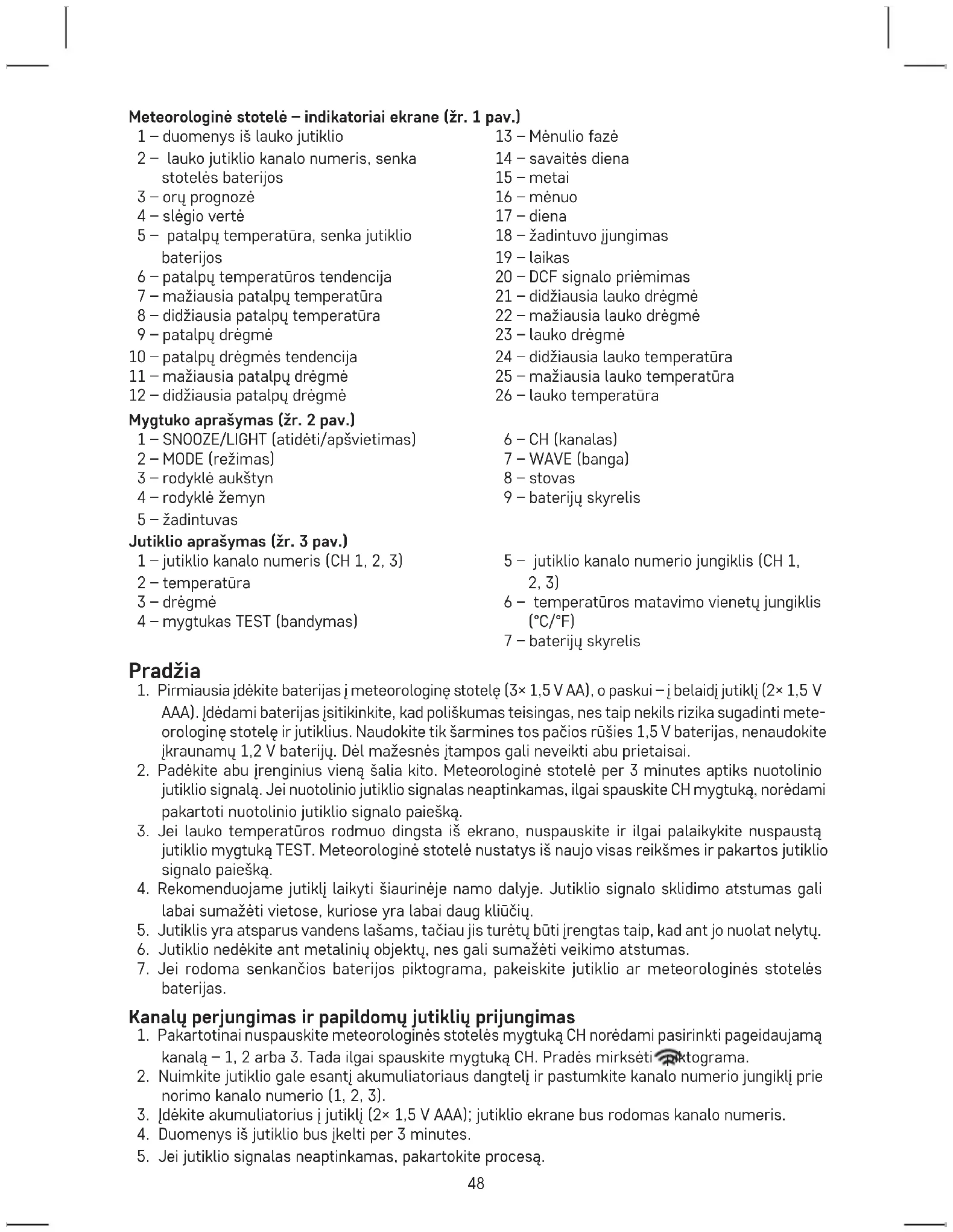 metai – datos formatas – mėnuo – diena – kalendoriaus kalba – laiko zona. Galite rinktis reikšmes, nuspausdami MODE („režimas“) mygtuką, nustatyti jas su aukštyn ir žemyn rodyklėmis. Kalendoriaus kalbos yra tokios: (ENG – anglų, FR – prancūzų, IT – italų, ES – ispanų, NE – olandų; DA, GE – vokiečių) 12/24 val. laiko formato, °C/°F temperatūros matavimo vienetų nustatymas Pakartotinai nuspaudus mygtuką MODE, perjungiamas 12/24 val. laiko formatas. Pakartotinai nuspaudus mygtuką , perjungiami °C/°F temperatūros matavimo vienetai.50 Atmosferos slėgis/istorija Slėgio reikšmė rodoma 4 laukelyje. Toliau pateikta slėgio istorijos lentelė iki pastarųjų 12 valandų. Pakartotinai nuspaudus ir palaikius mygtuką , perjungiami inHg ir hPa/mb slėgio matavimo vienetai. Meteorologinės stotelės perkėlimas į kitą vietą turi įtakos išmatuotoms vertėms. Įstačius baterijas arba perkėlus meteorologinę stotelę, matavimas tampa stabilus per 12 valandų. Temperatūros ir drėgmės tendencija temperatūros ir drėgmės tendencijos indikatorius kylanti pastovi mažėjanti Mėnulio fazės (žr. 4 pav.) Mėnulio fazė rodoma 13 laukelyje. 1 – Pilnatis 2 – Blankus priešpilnis 3 – Delčia 4 – Blankus pusmėnulis 5 – Jaunatis 6 – Šviečiantis pusmėnulis 7 – Priešpilnis 8 – Šviečiantis priešpilnis Didžiausios bei mažiausios temperatūros ir drėgmės rodmenų rodymas Išmatuotos lauko temperatūros vertės rodomos 24 ir 25 laukeliuose, o patalpų temperatūra – 7 ir 8 laukeliuose. Išmatuotos lauko drėgmės vertės rodomos 21 ir 22 laukeliuose, o patalpų drėgmė – 11 ir 12 laukeliuose. Išmatuotos reikšmės bus automatiškai ištrintos kiekvieną dieną 00.00 valandą. Norėdami rankiniu būdu ištrinti matuojamų verčių atmintį, ilgai palaikykite nuspaustą mygtuką. Žadintuvo nustatymas Palaikykite nuspaustą mygtuką – laiko nustatymai ims mirksėti. ir mygtukais nustatykite žadintuvo laiką. Norėdami patvirtinti ir naršyti po meniu, spauskite . Žadintuvas įjungiamas nuspaudus mygtuką; ekrane pasirodys . Norėdami išjungti žadintuvą, nuspauskite mygtuką; piktograma pradings. Signalo atidėjimo funkcija Galite atidėti žadintuvo skambėjimą 5 minutėms – nuspauskite SNOOZE/LIGHT mygtuką, esantį stotelės viršuje. Pradėjus skambėti žadintuvui, mygtuką nuspauskite vieną kartą. piktograma mirksės. Norėdami atšaukti SNOOZE funkciją, nuspauskite bet kurį kitą mygtuką – piktograma nustos mirksėti ir ekrane bus rodoma tik . Kitą dieną žadintuvas vėl įsijungs. Trumpas stotelės ekrano apšvietimas Nuspaudus SNOOZE/LIGHT (atidėjimo/apšvietimo) mygtuką, 5 sekundėms įsijungs ekrano apšvietimas. Orų prognozė Stotelė prognozuoja orus artimiausioms 12–24 valandų, tam naudojami atmosferos slėgio keitimosi duomenys 15–20 km srityje. Orų prognozės tikslumas yra 70–75 %. Prognozės piktograma rodoma 3 laukelyje. Kadangi orų prognozė gali nebūti 100 % tiksli, nei gamintojas, nei pardavėjas negali būti laikomi atsakingais už nuostolius, patirtus dėl netikslios prognozės. Pirmą kartą nustatant arba iš naujo nustatant meteorologinę stotelę, turi praeiti apie 12 valandų, kad stotelė pradėtų prognozuoti teisingai. Orų prognozės piktogramos (žr. 5 pav.) 1 – Saulėta 2 – Debesuota 3 – Apsiniaukę 4 – Lietus 5 – Sniegas51 Baterijų keitimo įspėjimas Pakeiskite stotelės ar jutiklio baterijas, kai stotelės ar jutiklio ekrane rodoma išsikrovusių baterijų piktograma . Techninė priežiūra ir eksploatacija Tinkamai naudojamas prietaisas patikimai veiks ne vienus metus. Štai keletas patarimų, kaip tinkamai naudoti prietaisą: