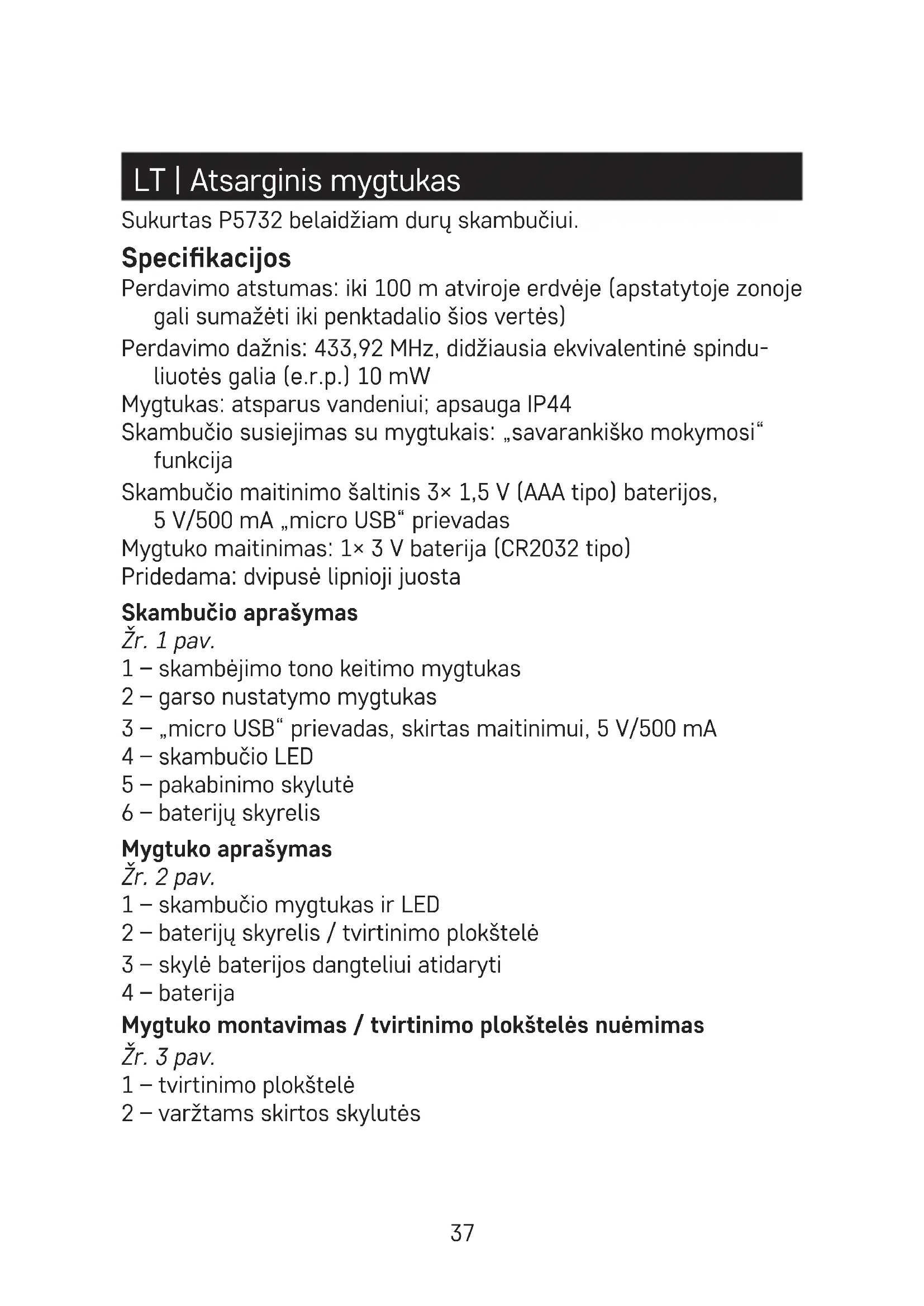 - Kai durų skambutis ilgai nenaudojamas, išimkite bateriją iš skambučio ir mygtuko.