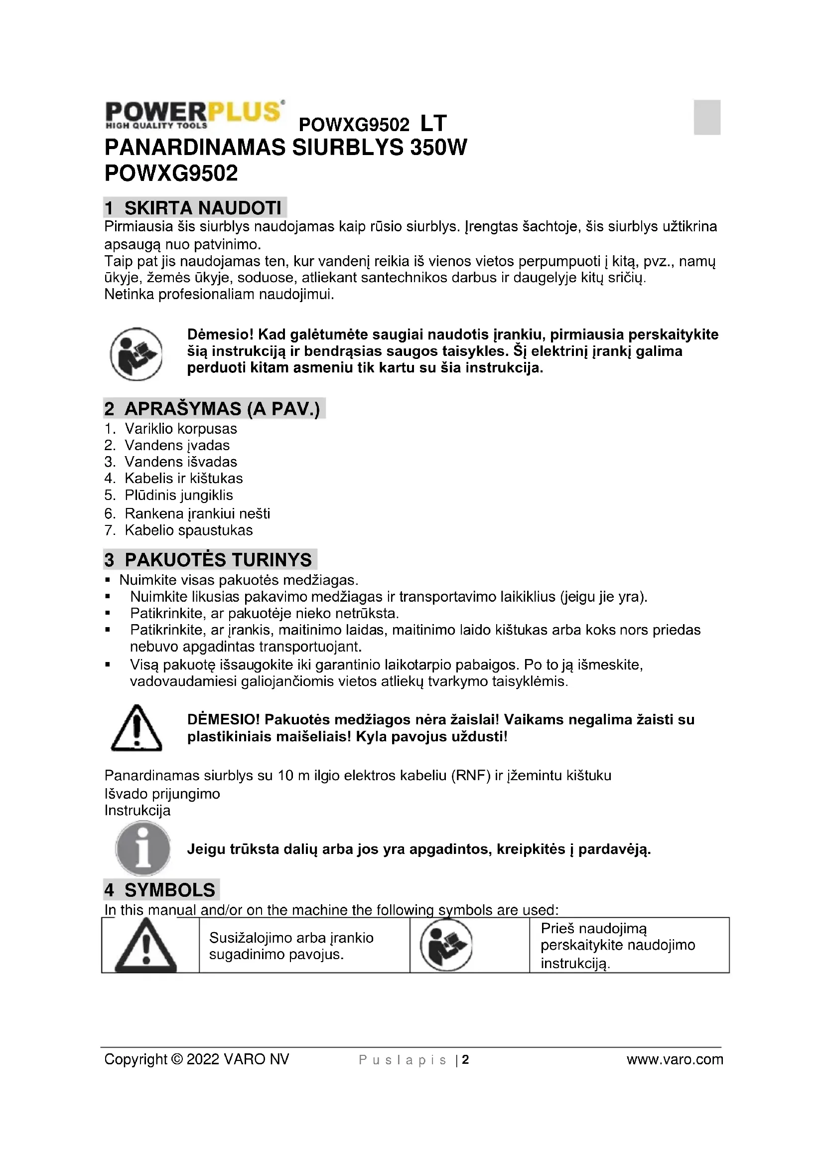 Prieš naudojimą perskaitykite naudojimo instrukciją.POWXG9502 LT Copyright © 2022 VARO NV P u s l a p i s | 3 www.varo.com