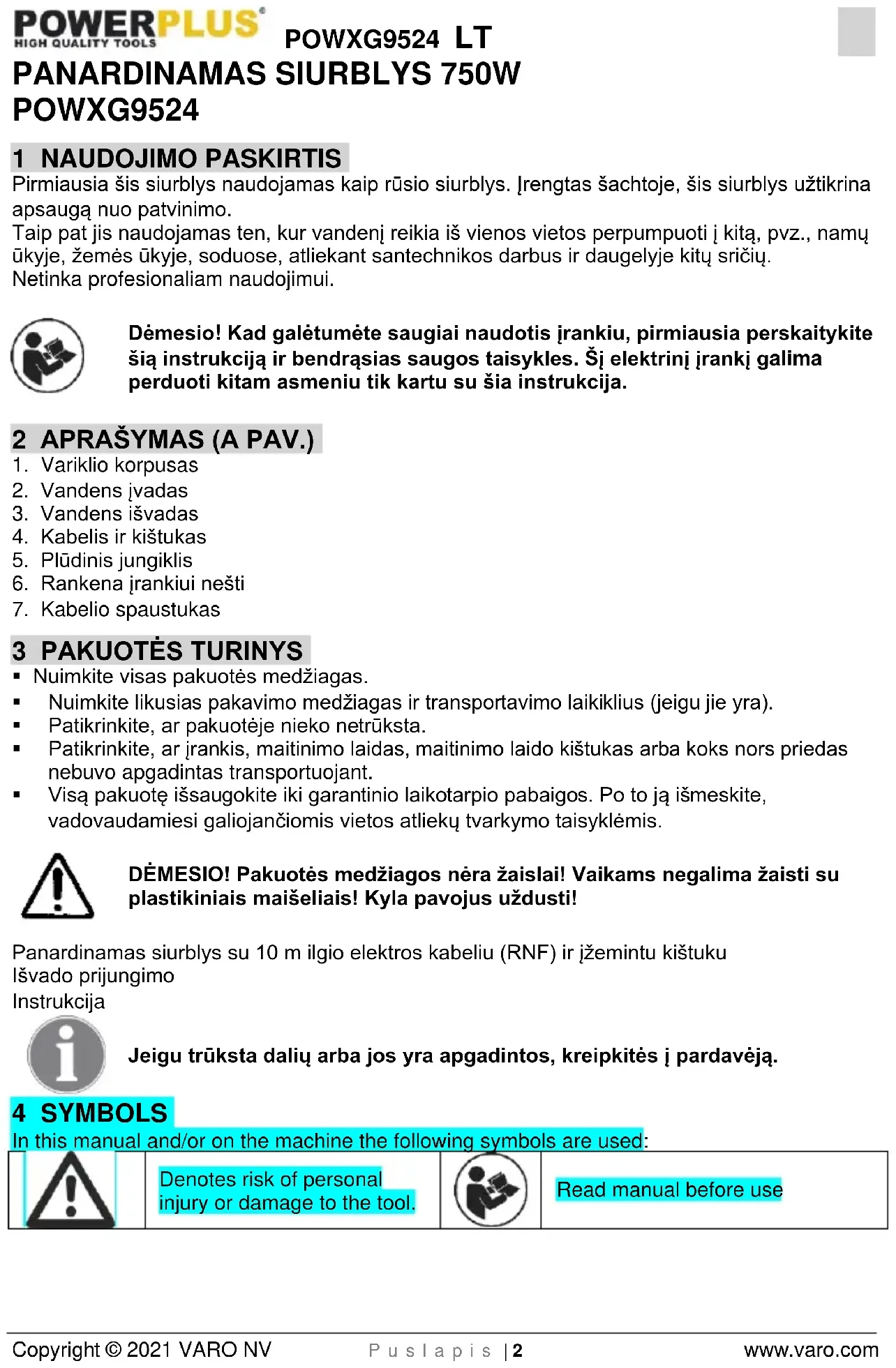 Triktys Priežastys Atitaisymo būdai Siurblys neįsijungia - Nutrūko elektros tiekimas - Neįsijungia plūdė - Patikrinkite elektros tiekimą - Aukščiau pakelkite plūdę Vanduo neteka - Užsikimšo tinklinis įvado filtras - Užlenkta slėginė žarna - Išplaukite tinklinį įvado filtrą vandens žarna - Pataisykite žarną Siurblys neišsijungia - Plūdė negali nusileisti - Pastatykite siurblį tinkamai, art veleno pagrindo Nepakankamas vandens srautas - Užsikimšo tinklinis įvado filtras - Dėl purvino vandens arba jame esančių šlifuojančiųjų dalelių sumažėjo siurblio galingumas - Išvalykite tinklinį įvado filtrą - Išvalykite siurblį ir pakeiskite nusidėvėjusias dalis Trumpai paveikęs, siurblys išsijungia - Dėl purvino vandens šiluminis saugiklis išjungia siurblį - Vanduo per karštas. Šiluminis saugiklis išjungia siurblį - Ištraukite siurblio kištuką iš elektros lizdo. Išvalykite siurblį ir veleną - Užtikrinkite, kad nebūtų viršijama maks. 35 °C temperatūra 13 SAUGOJIMAS Kruopščiai nuvalykite visą įrenginį ir jo priedus. Įrenginį laikykite jį stabiliai, tvirtai padėję vėsioje, sausoje, vaikams nepasiekiamoje vietoje. Saugokite nuo per aukštos ir per žemos temperatūros. Saugokite nuo tiesioginių saulės spindulių. Jeigu įmanoma, laikykite tamsoje. Norėdami apsaugoti nuo drėgmės, nelaikykite plastikiniuose maišeliuose.POWXG9524 LT Copyright © 2021 VARO NV P u s l a p i s | 7 www.varo.com 14 GARANTIJA Pagal įstatymą šiam gaminiui suteikiama 36 mėnesių garantija, kuri įsigalioja nuo pirkimo datos, kai jį įsigyja pirmasis vartotojas. Ši garantija galioja visiems medžiagų arba gamybos defektams. Ši garantija netaikoma akumuliatoriams, krovikliams, dalims, sugedusioms dėl įprasto nusidėvėjimo, pavyzdžiui, guoliams, šepetėliams, kabeliams, kištukams arba tokiems priedams kaip grąžtai, grąžtų galvutės, pjovimo diskai ir pan.; ši garantija negalioja esant žalai arba defektams, partirtai dėl netinkamo naudojimo, nelaimingų atsitikimų arba bandymų keisti gaminio konstrukciją; gabenimo išlaidos nepadengiamos. Ši garantija galioja visiems medžiagų arba gamybos defektams, išskyrus: akumuliatorius, kroviklius, dalis, sugedusias dėl įprasto nusidėvėjimo, pavyzdžiui, guolius, šepetėlius, kabelius, kištukus arba tokius priedus kaip grąžtai, grąžtų galvutės, pjovimo diskai ir pan.; ši garantija negalioja žalai arba defektams, partirtai dėl netinkamo naudojimo, nelaimingų atsitikimų arba bandymų keisti gaminio konstrukciją; gabenimo išlaidos nepadengiamos. Garantijos sąlygos netaikomos žalai ir (arba) defektams, atsiradusiems dėl netinkamo naudojimo. Mes taip pat atsisakome visų atsakomybių dėl bet kokių kūno sužeidimų, padarytų netinkamai naudojant šį įrankį. Remonto darbus gali atlikti tik įgaliotasis „Powerplus“ įrankių techninės pirežiūros centras. Daugiau informacijos visuomet gausite paskambinę tel. 00 32 3 292 92 90. Bet kokias transportavimo išlaidas visada padengia klientas, nebent būtų sutarta kitaip raštu. Pretenzijų pagal garantiją taip pat negalima teikti, jeigu prietaisas sugadintas dėl aplaidumo atliekant techninę priežiūrą arba perkrovos. Garantija neabejotinai netaikoma tais atvejais, jeigu žala padaryta skysčiui, dulkėms prasiskverbus į įrankio vidų, taip pat dėl tyčinės žalos (padarytos tyčia arba dėl visiško neatsargumo), netinkamo naudojimo (naudojant prietaisą ne pagal numatytąją paskirtį), nekompetentingo naudojimo (pvz., nesilaikant instrukcijoje pateiktų nurodymų), nemokšiško surinkimo, žaibo smūgio, netinkamos tinklo įtampos. Šis sąrašas nėra išsamus. Priimtinų garantinių pretenzijų atveju garantinis laikotarpis nepratęsiamas, be to, jeigu prietaisas būtų pakeistas nauju, nauja garantija nesuteikiama (galioja likęs ankstesnės garantijos laikotarpis). Pagal garantiją pakeisti prietaisai arba dalys lieka „Varo NV“ nuosavybe. Mes pasiliekame teisę atmesti bet kokius ieškinius, kai tik neįmanoma patvirtinti gaminio pirkimo arba kai akivaizdu, jog gaminys nebuvo tinkamai techniškai prižiūrimas. (Reguliariai valykite ventiliacijos angas, tikrinkite anglinius šepetėlius ir pan.) Privaloma išsaugoti pirkimo čekį kaip pirkimo datos įrodymą. Neišardytas prietaisas privalo būti grąžintas atstovui priimtinai švarus (originaliame išlietame dėkle, jeigu įrenginys buvo jame pristatytas), pateikiant pirkimo įrodymą. 15 APLINKOSAUGA Jeigu po ilgo naudojimo seną prietaisą reikėtų pakeisti nauju, neišmeskite jo kartu su buitinėmis atliekomis; atiduokite jį į atitinkamą atliekų surinkimo ir perdirbimo punktą. Senų elektrinių įrenginių atliekų negalima išmesti ir tvarkyti kaip įprastas buitines atliekas. Atiduokite juos pakartotiniam panaudojimui, jei yra tokia galimybė. Dėl pakartotiniam panaudojimui surenkamų atliekų taisyklių jūsų šalyje, pasikonsultuokite su vietos valdžia ar prekybos atstovu.POWXG9524 LT Copyright © 2021 VARO NV P u s l a p i s | 8 www.varo.com 16 ATITIKTIES DEKLARACIJA VARO N.V. - Vic. Van Rompuy N.V. Joseph Van Instraat 9 - BE2500 Lier - BELGIUM, pareiškia, kad, gaminys: PANARDINAMAS SIURBLYS 750W prekės ženklas: POWERplus modelis: POWXG9524 remiantis Europos suderintų standartų taikymu, atitinka galiojančių Europos Sąjungos direktyvų pagrindinius reikalavimus ir kitas atitinkamas jų sąlygas. Bet koks neįgaliotas šio aparato pakeitimas panaikina šią deklaraciją. Europos direktyvos (įskaitant, jeigu taikytina, jų dalinius pakeitimus, priimtus iki pasirašymo datos): 2011/65/EU 2014/35/EU 2014/30/EU Suderinti Europos standartai (įskaitant, jeigu taikytina, jų dalinius pakeitimus, priimtus iki pasirašymo datos): EN60335-1 : 2012 EN60335-2-41: 2003 EN55014-1 : 2017 EN55014-2 : 2015