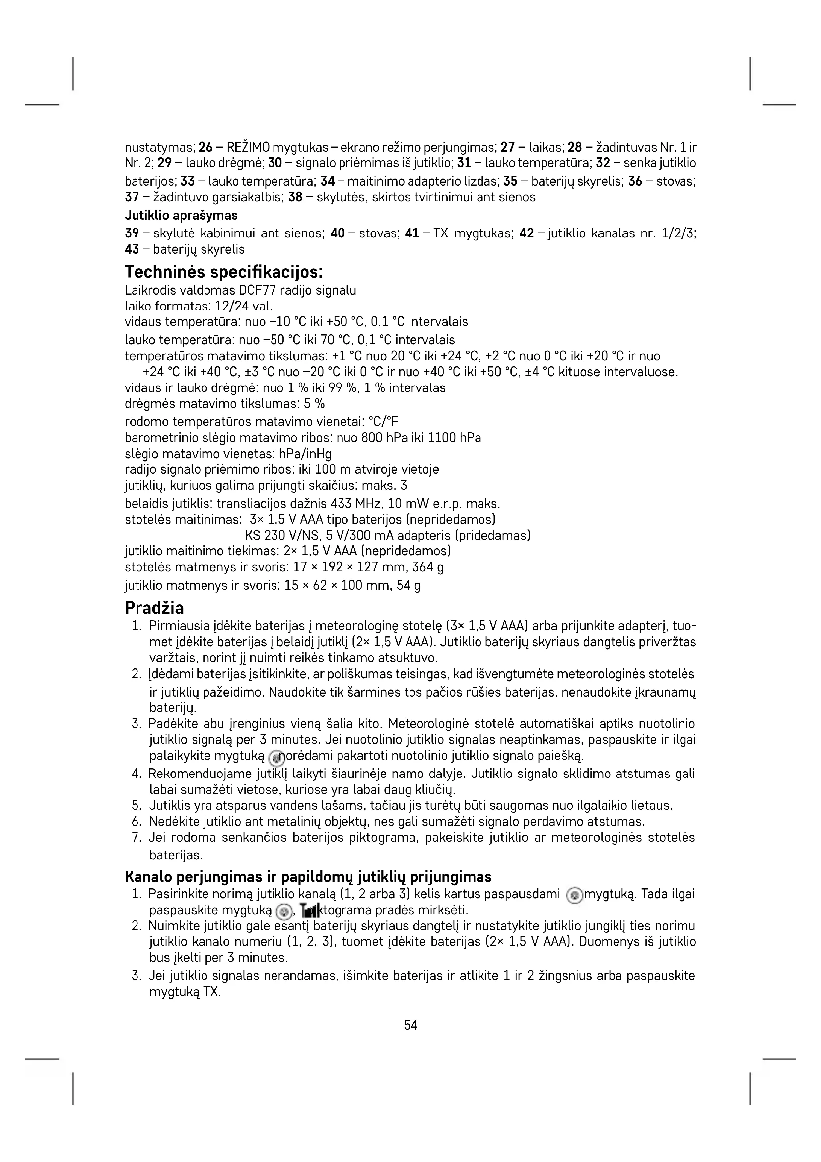 Kelis kartus paspauskite mygtuką, kol piktograma išnyks. Radijo bangomis valdomas laikrodis (DCF77) Po susiejimo su meteorologine stotele belaidis jutiklis 5 minutes automatiškai ieškos DCF77 (toliau tekste – DCF) signalo, mirksės simbolis. (DCF jutiklis yra jutiklio viduje). Signalas aptiktas – simbolis nustoja mirksėti ir rodomas dabartinis laikas ir DCF simbolis . Signalas neaptiktas – DCF simbolis nerodomas. DCF signalas bus kasdien sinchronizuojamas nuo