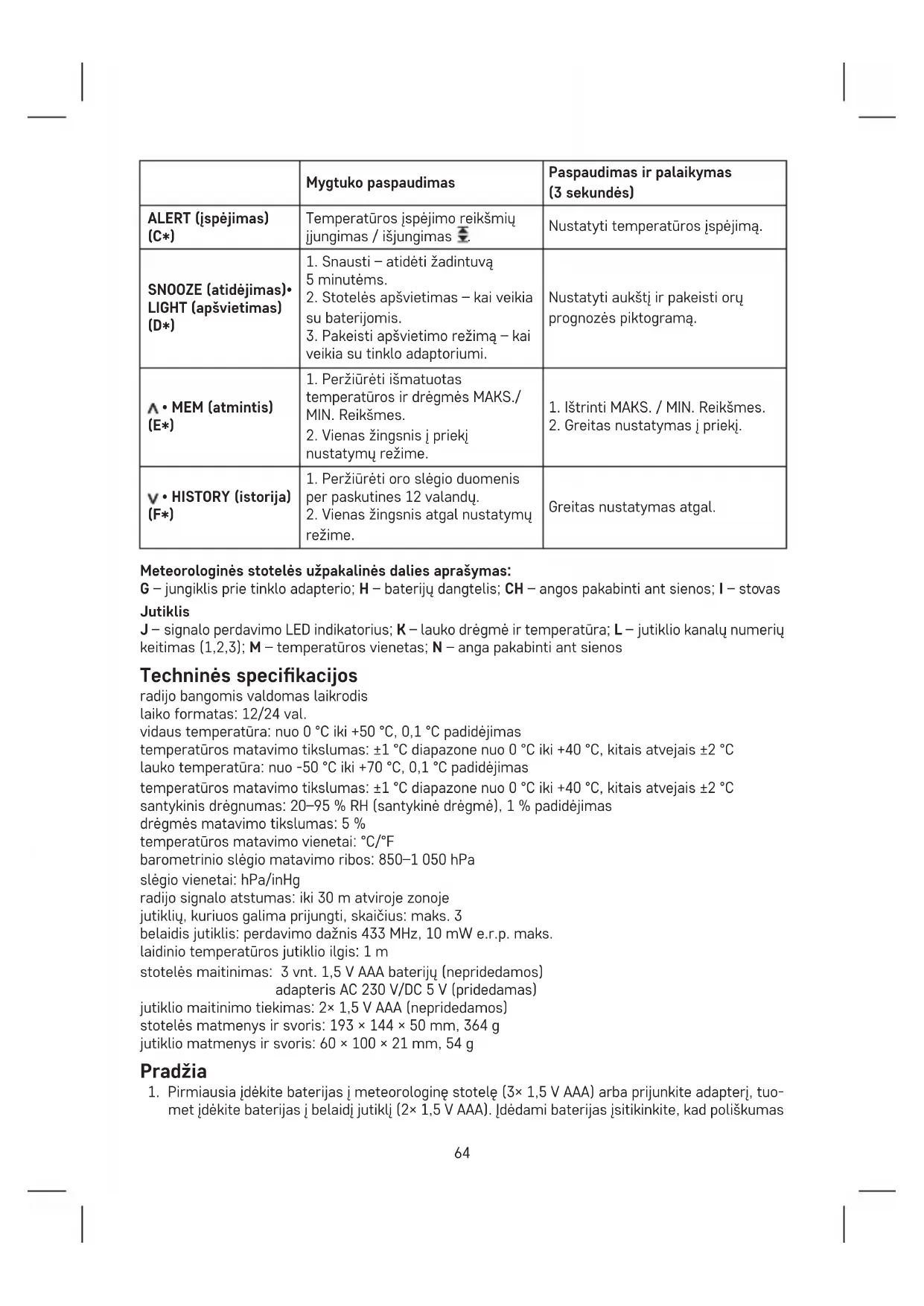 nuo -190m iki 2 000 m, su 10 m padidėjimu. Oro slėgis – istorija Stotelė rodo oro slėgį hPa ir inHg vienetais bei išsaugo matavimo duomenis per paskutines 12 valandų laukelyje nr. 16. Meteorologinės stotelės perkėlimas į kitą vietą turi įtakos išmatuotoms vertėms. Po baterijų įstatymo arba meteorologinės stotelės perkėlimo matavimai stabilizuojasi per 12 valandų. Kelis kartus paspauskite HISTORY mygtuką, kad rodytų paskutinių 12 valandų oro slėgio reikšmes vieną po kitos. Išmatuotos reikšmės ir laiko nuorodos bus rodomos laukeliuose nr. 15, 16. Informacija Po 20 sekundžių nuo nustatymų atlikimo stotelė persijungs iš nustatymų režimo į įprastąjį. Temperatūros, drėgmės ir oro slėgio tendencijos temperatūros, drėgmės ir slėgio indikatorius kylantis pastovus krintantis Mėnulio fazės Mėnulio fazės rodomos laukelyje nr. 14. Mėnulio fazių piktogramos yra tokios: jaunatis pilnėjantis pusmėnulis pirmas ketvirtis priešpilnis pilnatis delčia paskutinis ketvirtis mažėjantis pusmėnulis Didžiausių ir mažiausių temperatūros ir drėgmės rodmenų parodymas Kelis kartus paspaudus MEM mygtuką, bus palaipsniui rodomi didžiausi ir mažiausi temperatūros ir drėgmės rodmenys. Laikant nuspaudus MEM mygtuką, kai rodomos MAKS./MIN reikšmės, atmintis bus ištrinta.67 Žadintuvo nustatymai Meteorologinėje stotelėje galima nustatyti 2 žadintuvo laikus. Paspaudus MODE mygtuką, bus rodomas A1 žadintuvo laikas. Pasirinkimas bus rodomas laukelyje nr. 21. Kai rodomas žadintuvo laikas, laikykite paspaudę MODE mygtuką ir naudodami MEM bei HISTORY mygtukus nustatykite norimą laiką. Įjunkite žadintuvą paspausdami MEM ar HISTORY mygtukus, kol rodomas žadintuvo laikas laukelyje nr. 21. Įjungto žadintuvo piktograma bus rodomas laukelyje nr. 19. Dar kartą paspaudus MEM ar HISTORY mygtukus, kol rodomas žadintuvo laikas, žadintuvas išsijungs ir piktograma išnyks. Ta pati procedūra taikoma nustatyti A2 žadintuvą ( piktograma). Atidėjimo ir ekrano fono apšvietimo funkcijos (SNOOZE / LIGHT) Galite atidėti žadintuvo skambėjimą 5 minutėms, naudodami SNOOZE•LIGHT mygtuką, esantį stotelės viršuje. Žadintuvui pradėjus skambėti paspauskite mygtuką. Mirksės žadintuvo piktograma. Norėdami atšaukti SNOOZE režimą, paspauskite bet kurį kitą mygtuką – žadintuvo piktograma nustos mirksėti ir bus rodoma ekrane. Žadintuvas vėl bus aktyvintas kitą dieną. Orų prognozė Stotelė prognozuoja orą remdamasi atmosferos slėgio pokyčiais artimiausioms 12–24 valandų 15–20km apimančiai sričiai. Orų prognozės tikslumas yra 70–75 %. Prognozės piktograma rodoma laukelyje nr. 11. Kadangi orų prognozė gali nebūti 100 % tiksli, nei gamintojas, nei pardavėjas negali būti laikomi atsakingais už nuostolius, patirtus dėl netikslios prognozės. Pirmą kartų nustatant arba iš naujo nustatant meteorologinę stotelę, turi praeiti apie 12 valandų, kad stotelė pradėtų prognozuoti teisingai. Oro prognozės piktogramos: saulėta debesuota didelis debesuotumas lietus smarkus lietus – snaigės piktograma pasirodys, kai lauko temperatūra bus nuo -3 °C iki +1 °C. Malonios aplinkos piktograma – šypsenėlė Malonios aplinkos piktograma rodoma laukelyje nr. 30. Jeigu drėgmė yra nuo 40 iki 70 % RH, temperatūra nuo 20 iki 28 °C, bus rodoma COMFORT (komforto) piktograma – malnoi aplinka. Jeigu drėgmė mažesnė nei 40 % RH, bus rodoma DRY (sausros) piktograma – sausa aplinka. Jeigu drėgmė didesnė nei 70 % RH, bus rodoma WET (drėgmės) piktograma – drėgna aplinka. Jei temperatūra nėra nuo 20 iki 28 °C, o drėgmė nėra nuo 40 iki 70 % santykinės drėgmės, nebus rodoma jokia piktograma. Didžiausios ir mažiausios temperatūros ribų nustatymas Temperatūros ribos gali būti nustatytos atskirai net 3 lauko temperatūros jutikliams. Paspauskite ilgai ALERT (C) mygtuką. Didžiausios temperatūros nustatymo reikšmė pradės mirksėti . Naudokite MEM ir HISTORY mygtukus, norėdami nustatyti norimą temperatūrą nuo -49 °C iki 70 °C. Tada paspauskite ALERT (C) mygtuką ir nustatykite mažiausią temperatūrą nuo -50 °C iki 69 °C . Paspauskite ALERT mygtuką, norėdami įjungti / išjungti temperatūros įspėjimo funkciją piktograma bus rodoma laukelyje nr. 26. Laikant nuspaudus nustatymo mygtukus, galima greičiau keisti reikšmes.68 Temperatūros ribų diapazonas yra nuo -50 °C iki +70 °C, 1 °C padidėjimas. Kai bus viršytos nustatytos temperatūros ribos, pasigirs pakartotinis įspėjimo signalas ir reikšmė pradės mirksėti. Paspauskite ALERT mygtuką, norėdami nutildyti signalą. Baterijų keitimo įspėjimas Pakeiskite stotelės ar jutiklio baterijas, kai stotelės ar jutiklio ekrane rodoma išsikrovusių baterijų piktograma