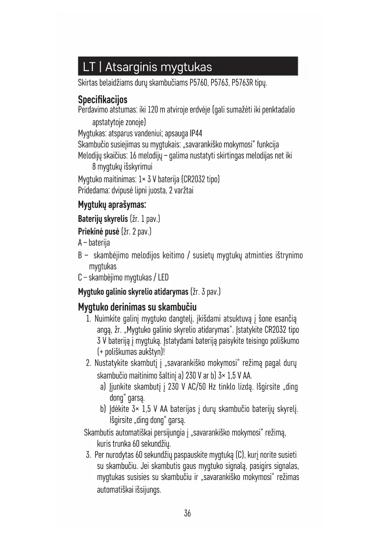 - Kai durų skambutis ilgai nenaudojamas, išimkite bateriją iš durų skambučio mygtuko.