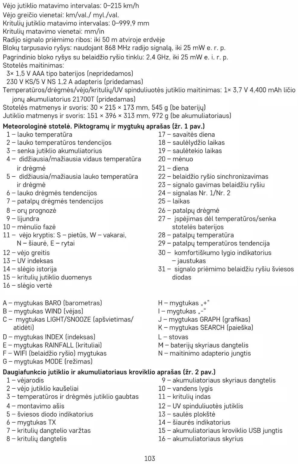 - Acest aparat nu este destinat utilizării de către persoane (inclusiv copii) a căror capacitate zică, senzorială sau mentală, ori experiența și cunoștințele insuciente împiedică utilizarea aparatului în siguranță, dacă nu vor supravegheate sau dacă nu au fost instruite privind utilizarea aparatului de către persoana responsabilă de securitatea acestora. Trebuie asigurată supravegherea copiilor pentru se împiedica joaca lor cu acest aparat. Nu aruncaţi consumatorii electrici la deşeuri comunale nesortate, folosiţi bazele de recepţie a deşeurilor sortate. Pentru informaţii actuale privind bazele de recepţie contactaţi organele locale. Dacă consumatorii electrici sunt depozitaţi la stocuri de deşeuri comunale, substanţe- le periculoase se pot in ltra în apele subterane şi pot să ajungă în lanţul alimentar, periclitând să- nătatea şi confortul dumneavoastră. Prin prezenta, EMOS spol. s r. o. declară că tipul de echipamente radio E5059 este în conformitate cu Directiva 2014/53/UE. Textul integral al declarației UE de conformitate este disponibil la următoarea adresă internet: http://www.emos.eu/download. LT | Belaidžio ryšio meteorologinė stotelė Techniniai parametrai Laikrodis valdomas belaidžio ryšio signalu Laiko formatas: 12/24 val. Vidaus temperatūra: nuo -10 °C iki +50 °C, 0,1 °C intervalais Lauko temperatūra: nuo -40 °C iki +70 °C, 0,1 °C intervalais Temperatūros matavimo tikslumas: ±1 °C Patalpų ir lauko drėgmė: 1–99 %, 1 % intervalais Drėgmės matavimo tikslumas: 30–80 % intervale – 3 %, kituose intervaluose – 5 % Temperatūros matavimo vienetai: °C/°F Barometrinio slėgio matavimo ribos: 850–1 050 hPa Slėgio matavimo vienetai: hPa/inHg/mmHg103 Vėjo jutiklio matavimo intervalas: 0–215 km/h Vėjo greičio vienetai: km/val./ myl./val. Kritulių jutiklio matavimo intervalas: 0–999,9 mm Kritulių matavimo vienetai: mm/in Radijo signalo priėmimo ribos: iki 50 m atviroje erdvėje Blokų tarpusavio ryšys: naudojant 868 MHz radijo signalą, iki 25 mW e. r. p. Pagrindinio bloko ryšys su belaidžio ryšio tinklu: 2,4 GHz, iki 25 mW e. i. r. p. Stotelės maitinimas: 3× 1,5 V AAA tipo baterijos (nepridedamos) 230 V KS/5 V NS 1,2 A adapteris (pridedamas) Temperatūros/drėgmės/vėjo/kritulių/UV spinduliuotės jutiklio maitinimas: 1× 3,7 V 4,400 mAh ličio jonų akumuliatorius 21700T (pridedamas) Stotelės matmenys ir svoris: 30 × 215 × 173 mm, 545 g (be baterijų) Jutiklio matmenys ir svoris: 151 × 396 × 313 mm, 972 g (be akumuliatoriaus) Meteorologinė stotelė. Piktogramų ir mygtukų aprašas (žr. 1 pav.) 1 – lauko temperatūra 2 – lauko temperatūros tendencijos 3 – senka jutiklio akumuliatorius 4 – didžiausia/mažiausia vidaus temperatūra ir drėgmė 5 – didžiausia/mažiausia lauko temperatūra ir drėgmė 6 – lauko drėgmės tendencijos 7 – patalpų drėgmės tendencijos 8 – orų prognozė 9 – lijundra 10 – mėnulio fazė 11 – vėjo kryptis: S – pietūs, W – vakarai, N – šiaurė, E – rytai 12 – vėjo greitis 13 – UV indeksas 14 – slėgio istorija 15 – kritulių jutiklio duomenys 16 – slėgio vertė 17 – savaitės diena 18 – saulėlydžio laikas 19 – saulėtekio laikas 20 – mėnuo 21 – diena 22 – belaidžio ryšio sinchronizavimas 23 – signalo gavimas belaidžiu ryšiu 24 – signalas Nr. 1/Nr. 2 25 – laikas 26 – patalpų drėgmė 27 – įspėjimas dėl temperatūros/senka stotelės baterijos 28 – patalpų temperatūra 29 – patalpų temperatūros tendencija 30 – komfortiškumo lygio indikatorius – jaustukas 31 – signalo priėmimo belaidžiu ryšiu šviesos diodas A – mygtukas BARO (barometras) B – mygtukas WIND (vėjas) C – mygtukas LIGHT/SNOOZE (apšvietimas/ atidėti) D – mygtukas INDEX (indeksas) E – mygtukas RAINFALL (krituliai) F – WIFI (belaidžio ryšio) mygtukas G – mygtukas MODE (režimas) H – mygtukas „+“ I – mygtukas „-“ J – mygtukas GRAPH (grakas) K – mygtukas SEARCH (paieška) L – stovas M – baterijų skyriaus dangtelis N – maitinimo adapterio jungtis Daugiafunkcio jutiklio ir akumuliatoriaus kroviklio aprašas (žr. 2 pav.) 1 – vėjarodis 2 – vėjo jutiklio kaušeliai 3 – temperatūros ir drėgmės jutiklio gaubtas 4 – montavimo ašis 5 – šviesos diodo indikatorius 6 – mygtukas TX 7 – kritulių dangtelio varžtas 8 – kritulių dangtelis 9 – akumuliatoriaus skyriaus dangtelis 10 – vandens lygis 11 – kritulių indas 12 – UV spinduliuotės jutiklis 13 – saulės plokštė 14 – šiaurės indikatorius 15 – akumuliatoriaus kroviklio USB jungtis 16 – akumuliatoriaus skyrius104 Jutiklio montavimas ant sienos (žr. 3 pav.) Miestų sąrašas (žr. 4 pav.) Pradžia/montavimas