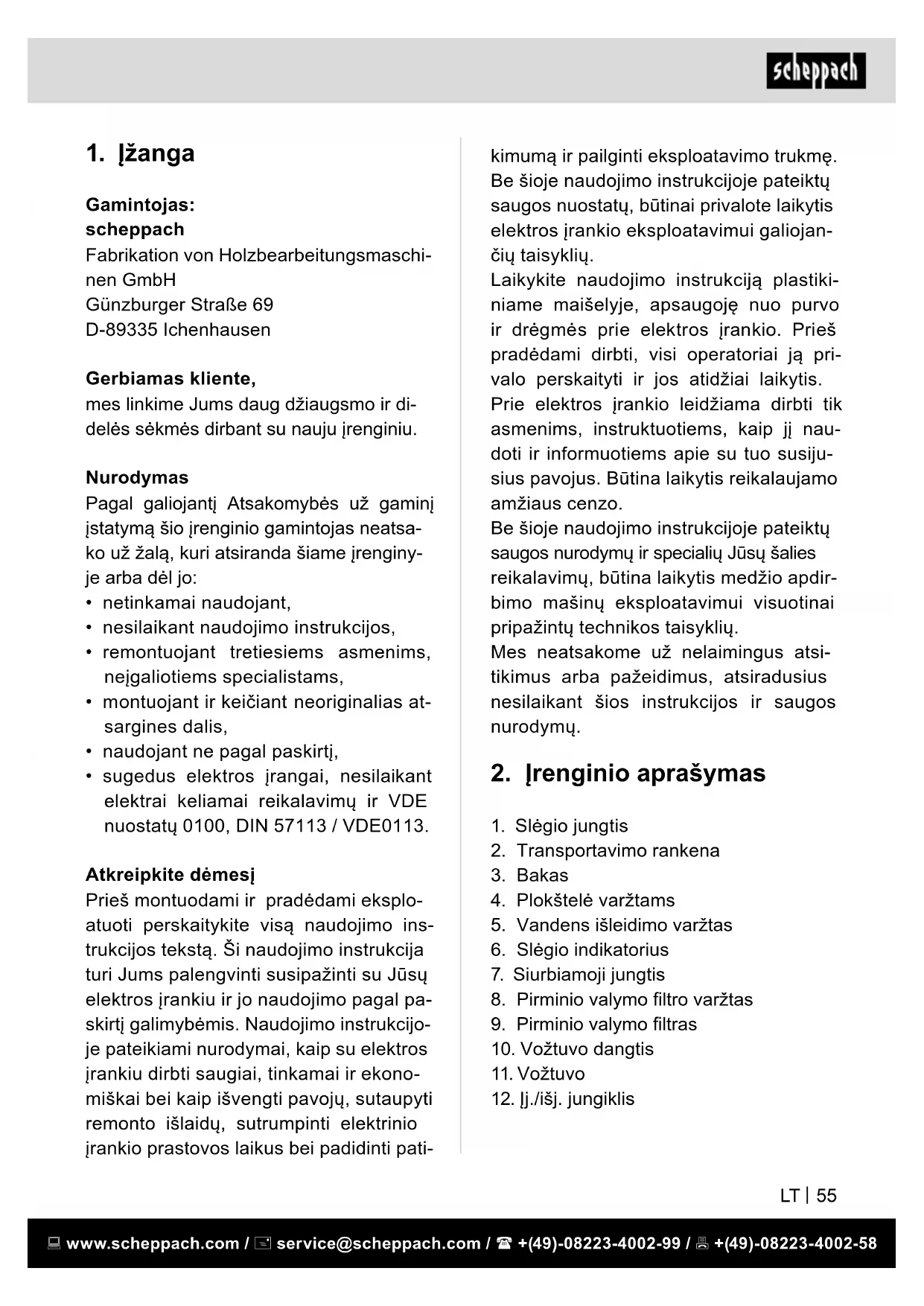- sugedus elektros įrangai, nesilaikant elektrai keliamai reikalavimų ir VDE nuostatų 0100, DIN 57113 / VDE0113. Atkreipkite dėmesį Prieš montuodami ir pradėdami eksplo- atuoti perskaitykite visą naudojimo ins- trukcijos tekstą. Ši naudojimo instrukcija turi Jums palengvinti susipažinti su Jūsų elektros įrankiu ir jo naudojimo pagal pa- skirtį galimybėmis. Naudojimo instrukcijo- je pateikiami nurodymai, kaip su elektros įrankiu dirbti saugiai, tinkamai ir ekono- miškai bei kaip išvengti pavojų, sutaupyti remonto išlaidų, sutrumpinti elektrinio įrankio prastovos laikus bei padidinti pati- www.scheppach.com / service@scheppach.com / +(49)-08223-4002-99 / +(49)-08223-4002-58