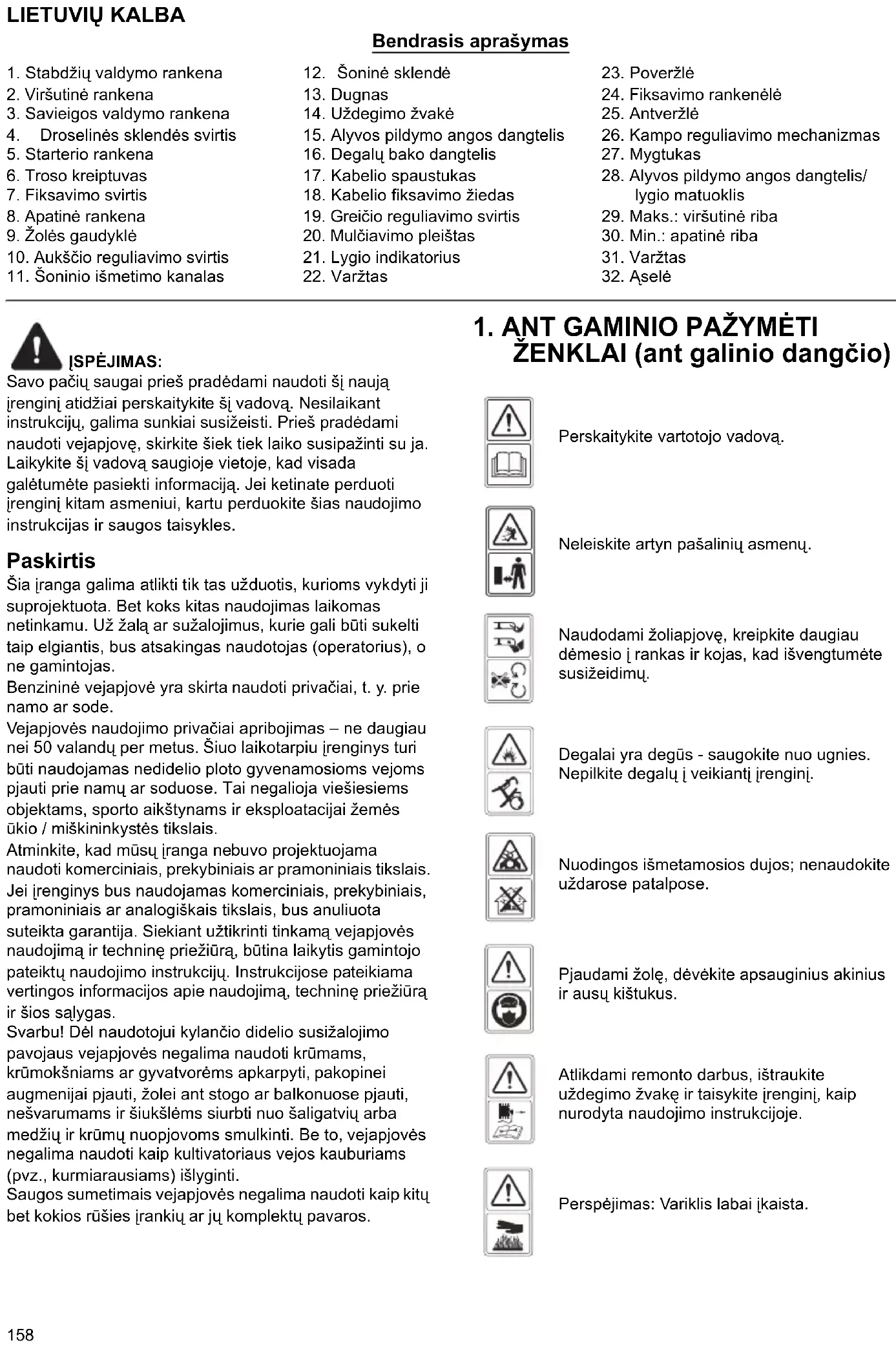 Perskaitykite vartotojo vadovą. Neleiskite artyn pašalinių asmenų. Naudodami žoliapjovę, kreipkite daugiau dėmesio į rankas ir kojas, kad išvengtumėte susižeidimų. Degalai yra degūs - saugokite nuo ugnies. Nepilkite degalų į veikiantį įrenginį. Nuodingos išmetamosios dujos; nenaudokite uždarose patalpose. Pjaudami žolę, dėvėkite apsauginius akinius ir ausų kištukus. Atlikdami remonto darbus, ištraukite uždegimo žvakę ir taisykite įrenginį, kaip nurodyta naudojimo instrukcijoje. Perspėjimas: Variklis labai įkaista.159