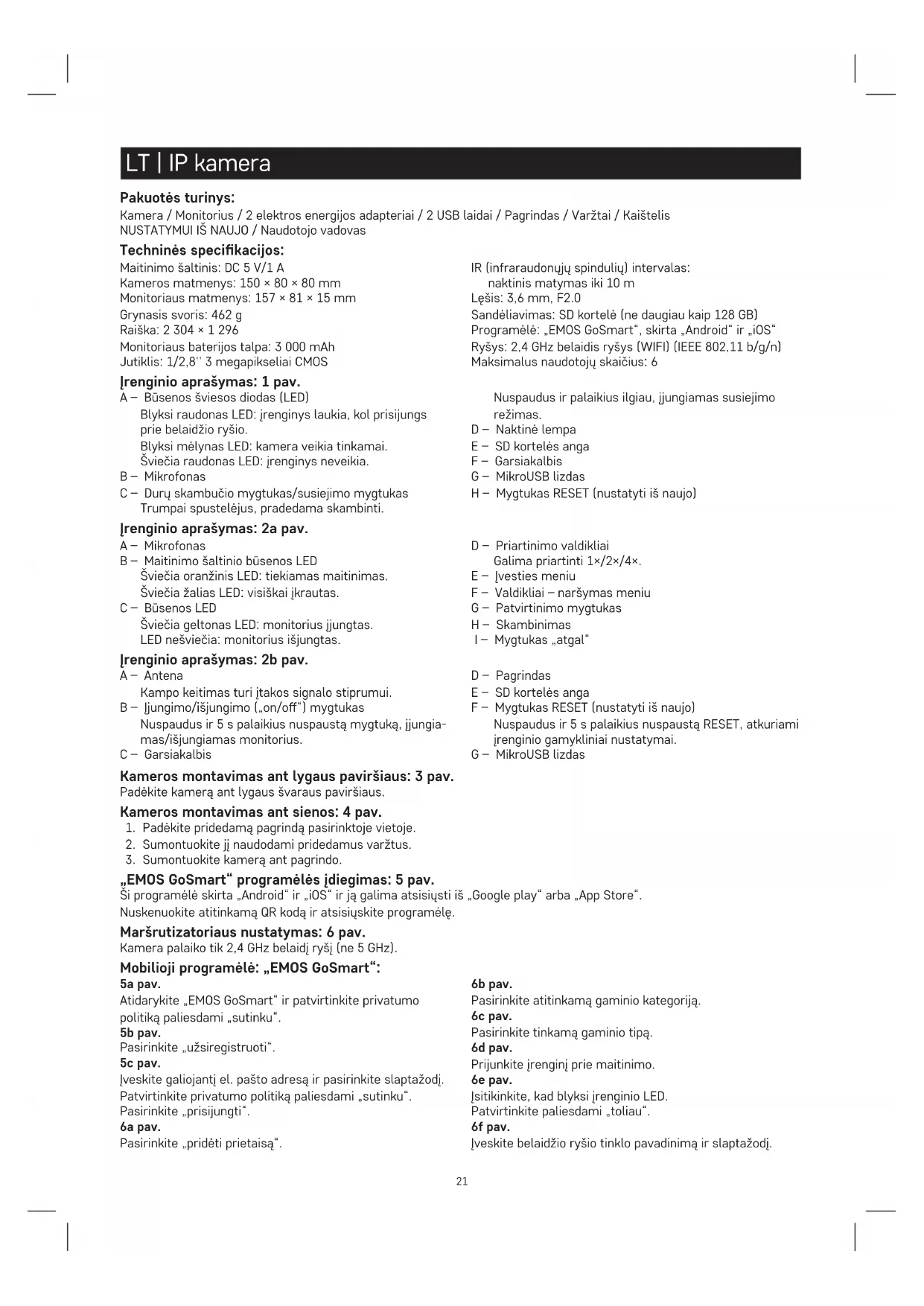 „EMOS GoSmart“ programėlės įdiegimas: 5 pav. Ši programėlė skirta „Android“ ir „iOS“ ir ją galima atsisiųsti iš „Google play“ arba „App Store“. Nuskenuokite atitinkamą QR kodą ir atsisiųskite programėlę. Maršrutizatoriaus nustatymas: 6 pav. Kamera palaiko tik 2,4 GHz belaidį ryšį (ne 5 GHz). Mobilioji programėlė: „EMOS GoSmart“: 5a pav. Atidarykite „EMOS GoSmart“ ir patvirtinkite privatumo politiką paliesdami „sutinku“. 5b pav. Pasirinkite „užsiregistruoti“. 5c pav. Įveskite galiojantį el. pašto adresą ir pasirinkite slaptažodį. Patvirtinkite privatumo politiką paliesdami „sutinku“. Pasirinkite „prisijungti“. 6a pav. Pasirinkite „pridėti prietaisą“. 6b pav. Pasirinkite atitinkamą gaminio kategoriją. 6c pav. Pasirinkite tinkamą gaminio tipą. 6d pav. Prijunkite įrenginį prie maitinimo. 6e pav. Įsitikinkite, kad blyksi įrenginio LED. Patvirtinkite paliesdami „toliau“. 6f pav. Įveskite belaidžio ryšio tinklo pavadinimą ir slaptažodį.22 Patvirtinkite paliesdami „toliau“. 6g pav. Jūsų įrenginio ekrane atsiras QR kodas. Laikykite QR kodą priešais kameros lęšį. Patvirtinkite, kad išgirdote garsinį signalą, reiškiantį, jog susiejimas pavyko sėkmingai. 6h pav. Įrenginys bus aptiktas automatiškai. 6i pav. Įrenginys rastas. Patvirtinkite paliesdami „atlikta“. Kameros susiejimas su monitoriumi: Įjunkite kamerą ir monitorių; jie bus susieti automatiškai. Jei automatinis susiejimas nepavyksta, elkitės, kaip nurodyta toliau.