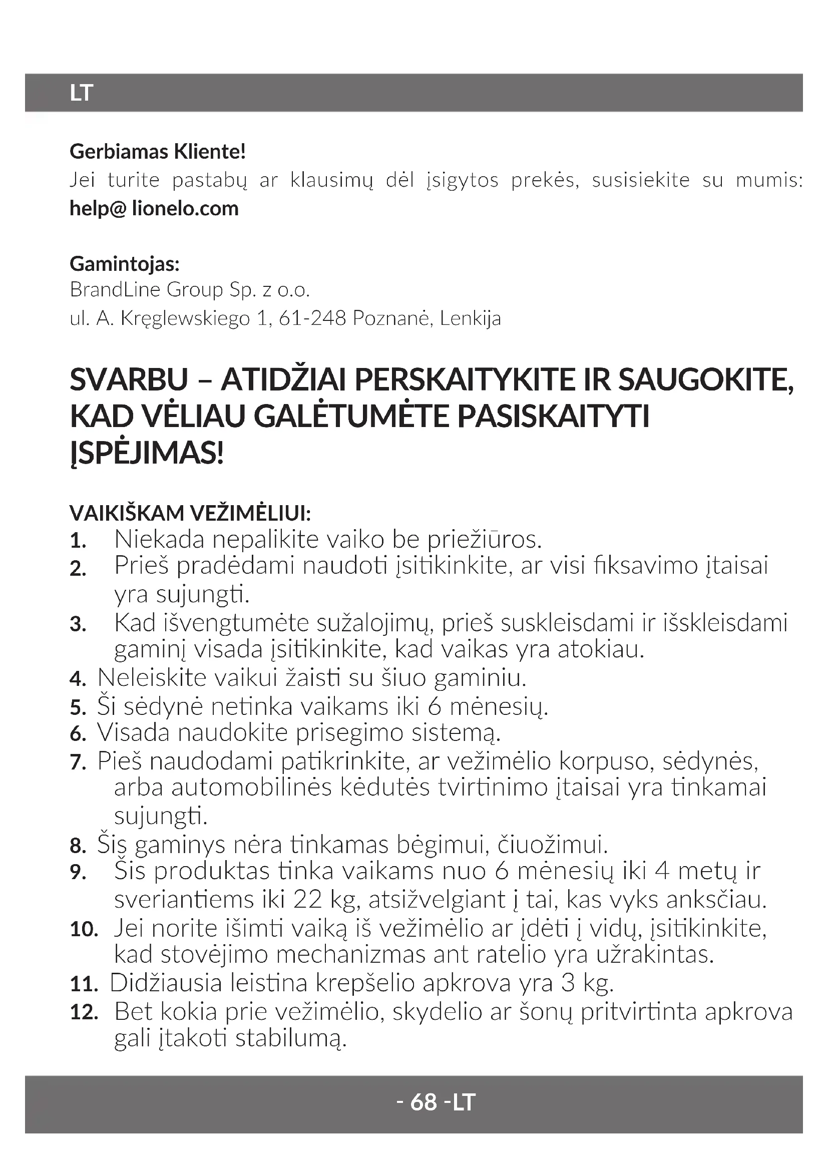 Gerbiamas Kliente! Jei turite pastabų ar klausimų dėl įsigytos prekės, susisiekite su mumis: help@ lionelo.com Gamintojas: BrandLine Group Sp. z o.o. ul. A. Kręglewskiego 1, 61-248 Poznanė, Lenkija SVARBU – ATIDŽIAI PERSKAITYKITE IR SAUGOKITE, KAD VĖLIAU GALĖTUMĖTE PASISKAITYTI ĮSPĖJIMAS! VAIKIŠKAM VEŽIMĖLIUI: