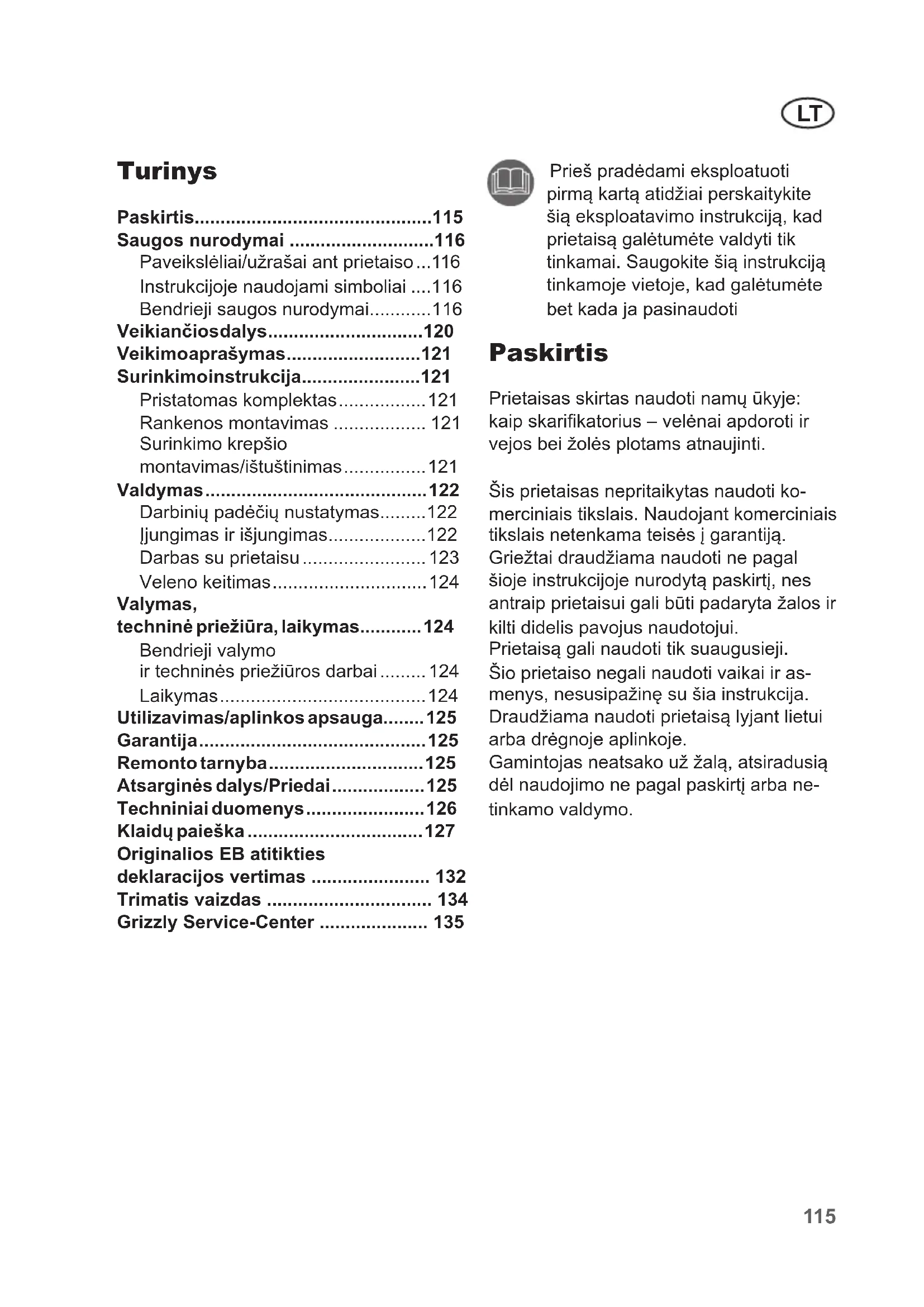 Originalios eksploatavimo instrukcijos vertimas ...............................115 Priešpradėdamieksploatuotipirmąkartąatidžiaiperskaitykitešią eksploatavimoinstrukciją.Saugokitešiąinstrukcijąirprireikusperduo- kitekitamnaudotojui,kadbūtųgalimabetkadapasinaudotiinstrukcijo- jeesančiainformacija.5
