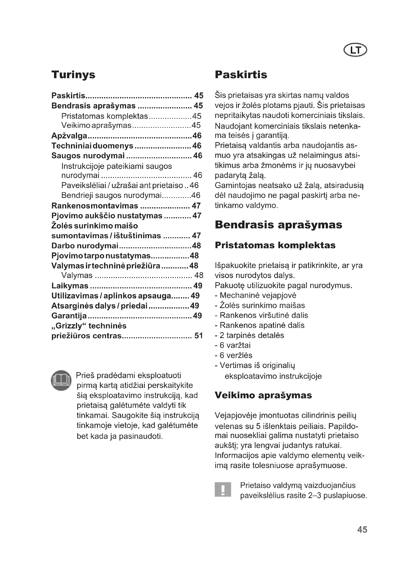 - Paskirtis Šis prietaisas yra skirtas namų valdos vejos ir žolės plotams pjauti. Šis prietaisas nepritaikytas naudoti komerciniais tikslais. Naudojant komerciniais tikslais netenka- ma teisės į garantiją. Prietaisą valdantis arba naudojantis as- muo yra atsakingas už nelaimingus atsi- tikimus arba žmonėms ir jų nuosavybei padarytą žalą. Gamintojas neatsako už žalą, atsiradusią dėl naudojimo ne pagal paskirtį arba ne- tinkamo valdymo. Bendrasis aprašymas Pristatomas komplektas Išpakuokite prietaisą ir patikrinkite, ar yra visos nurodytos dalys. Pakuotę utilizuokite pagal nurodymus. - Mechaninė vejapjovė - Žolės surinkimo maišas - Rankenos viršutinė dalis - Rankenos apatinė dalis - 2 tarpinės detalės - 6 varžtai - 6 veržlės - Vertimas iš originalių eksploatavimo instrukcijoje Veikimo aprašymas Vejapjovėje įmontuotas cilindrinis peilių velenas su 5 išlenktais peiliais. Papildo- mai nuosekliai galima nustatyti prietaiso aukštį; yra lengvai judantys ratukai. Informacijos apie valdymo elementų veik- imą rasite tolesniuose aprašymuose. Prietaiso valdymą vaizduojančius paveikslėlius rasite 2–3 puslapiuose. Prieš pradėdami eksploatuoti pirmą kartą atidžiai perskaitykite šią eksploatavimo instrukciją, kad prietaisą galėtumėte valdyti tik tinkamai. Saugokite šią instrukciją tinkamoje vietoje, kad galėtumėte bet kada ja pasinaudoti. „Grizzly“ techninės priežiūros centras p. 5146