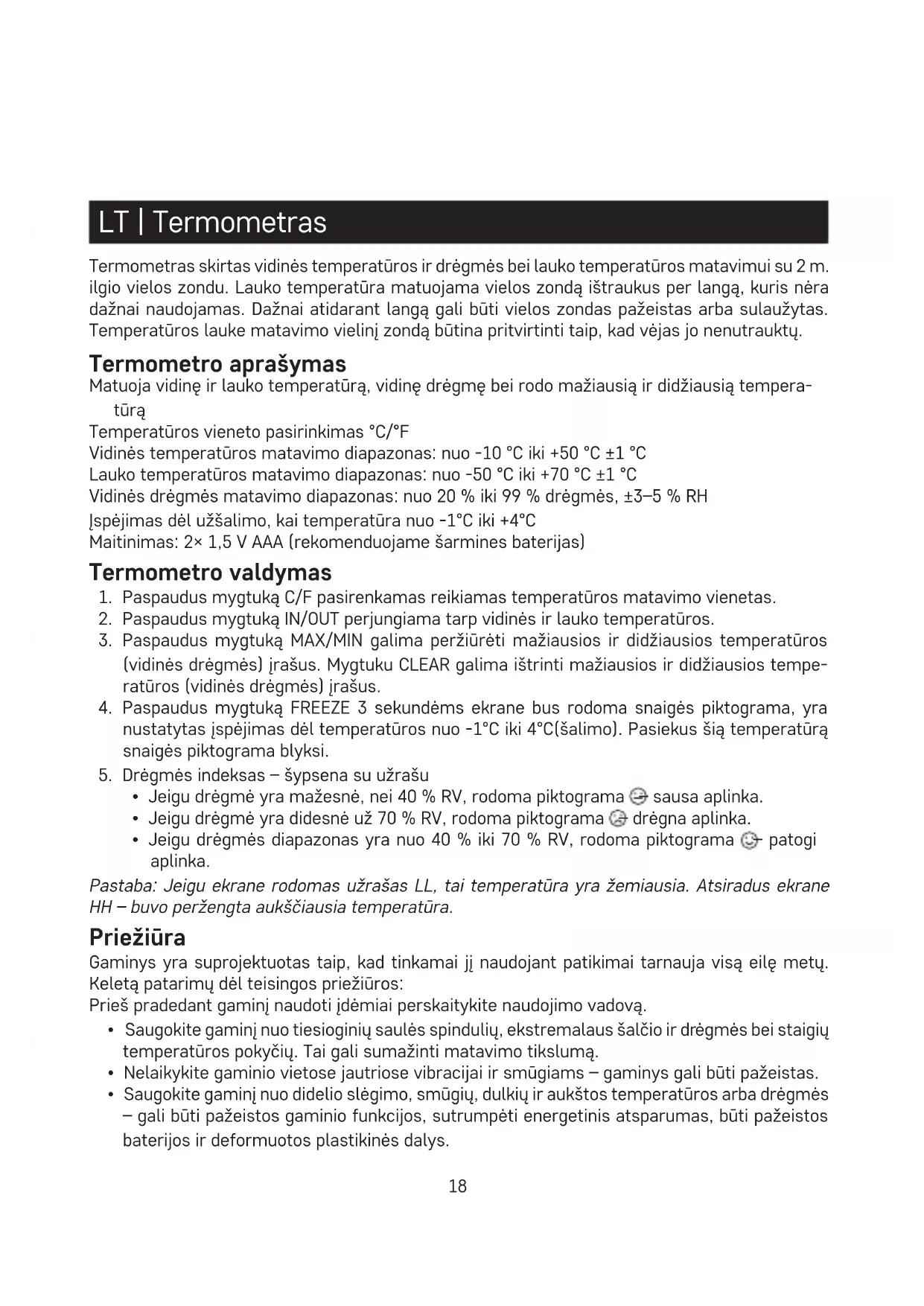 - Jeigu drėgmės diapazonas yra nuo 40 % iki 70 % RV, rodoma piktograma – patogi aplinka. Pastaba: Jeigu ekrane rodomas užrašas LL, tai temperatūra yra žemiausia. Atsiradus ekrane HH – buvo peržengta aukščiausia temperatūra. Priežiūra Gaminys yra suprojektuotas taip, kad tinkamai jį naudojant patikimai tarnauja visą eilę metų. Keletą patarimų dėl teisingos priežiūros: Prieš pradedant gaminį naudoti įdėmiai perskaitykite naudojimo vadovą.