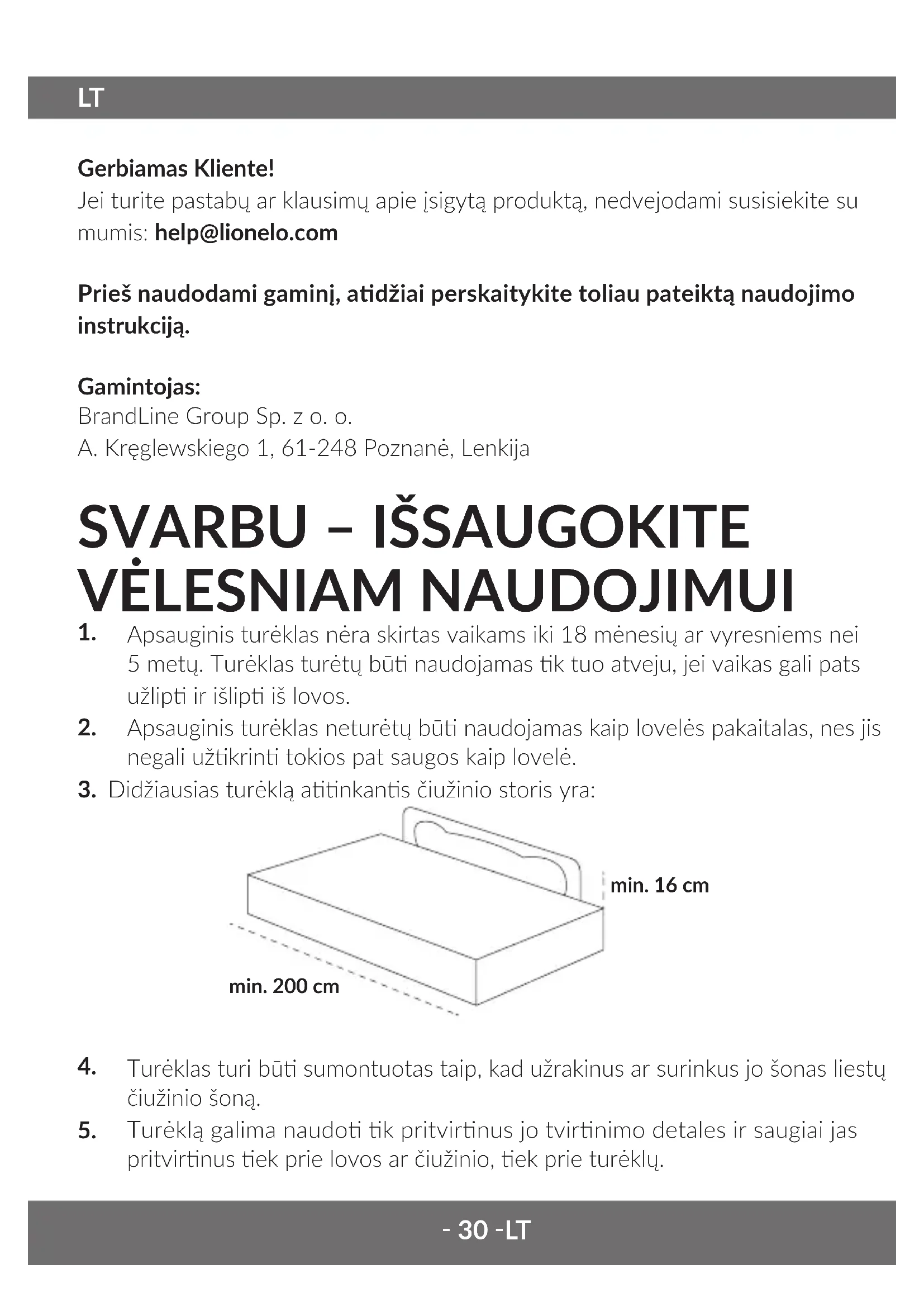 Užkabinkite diržą ant tvirnimo įtaiso ir uždėkite galinę dalį tarp lovos ir čiužinio, tada priveržkite diržą su reguliavimu (10, 11 pav.) Valymas ir plovimas Norėdami išvaly medžiaginį apvalkalą, išardykite vamzdžius ir ištraukite juos iš pagrindo. Nuimkite medžiaginį apvalkalą. Skalbkite rankomis, nelyginkite, nedžiovinkite džiovyklėje. Produktas buvo išbandytas ir anka visus standarnius reikalavimus BS 7972:2001+A1:2009, EN71-3:2019 Instrukcijoje naudojamos nuotraukos yra iliustracinės ir gali keiss neinformavus vartotojo. Šioje instrukcijoje pateikta informacija gali keiss neinformavus vartotojo.‑ 33 ‑ CS Vážení zákazníci! Máte-li jakékoli připomínky nebo dotazy týkající se zakoupeného výrobku, kontaktujte nás: help@lionelo.com Před použim výrobku si prosím pečlivě přečtěte následující uživatelskou příručku. Výrobce: BrandLine Group Sp. z o. o. ul. A. Kręglewskiego 1, 61-248 Poznaň, Polsko
