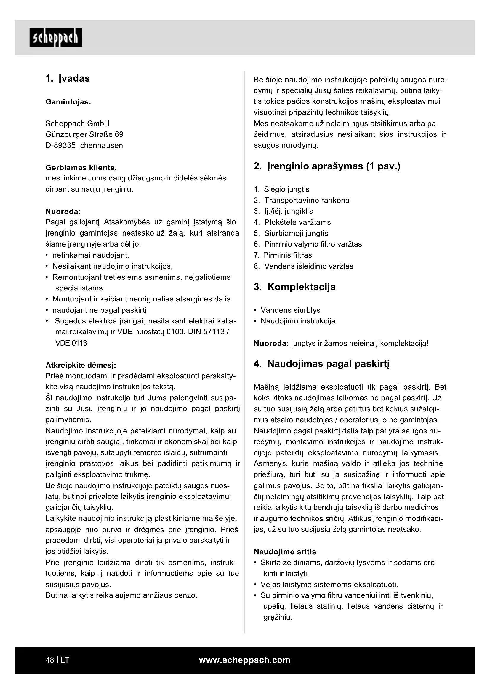 - Sugedus elektros įrangai, nesilaikant elektrai kelia- mai reikalavimų ir VDE nuostatų 0100, DIN 57113 / VDE 0113 Atkreipkite dėmesį: Prieš montuodami ir pradėdami eksploatuoti perskaity- kite visą naudojimo instrukcijos tekstą. Ši naudojimo instrukcija turi Jums palengvinti susipa- žinti su Jūsų įrenginiu ir jo naudojimo pagal paskirtį galimybėmis. Naudojimo instrukcijoje pateikiami nurodymai, kaip su įrenginiu dirbti saugiai, tinkamai ir ekonomiškai bei kaip išvengti pavojų, sutaupyti remonto išlaidų, sutrumpinti įrenginio prastovos laikus bei padidinti patikimumą ir pailginti eksploatavimo trukmę. Be šioje naudojimo instrukcijoje pateiktų saugos nuos- tatų, būtinai privalote laikytis įrenginio eksploatavimui galiojančių taisyklių. Laikykite naudojimo instrukciją plastikiniame maišelyje, apsaugoję nuo purvo ir drėgmės prie įrenginio. Prieš pradėdami dirbti, visi operatoriai ją privalo perskaityti ir jos atidžiai laikytis. Prie įrenginio leidžiama dirbti tik asmenims, instruk- tuotiems, kaip jį naudoti ir informuotiems apie su tuo susijusius pavojus. Būtina laikytis reikalaujamo amžiaus cenzo.www.scheppach.com