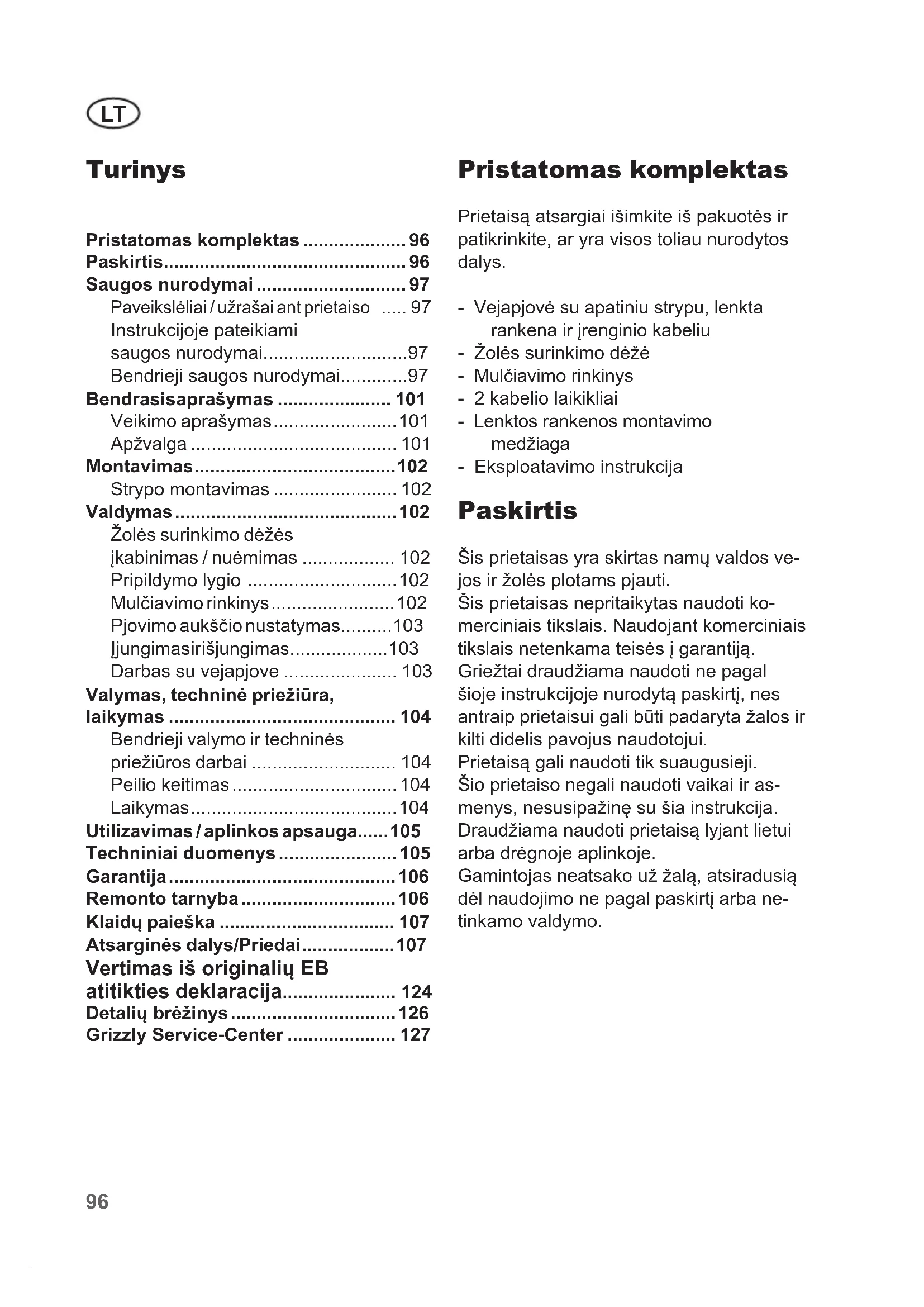 - Instrukcijoje pateikiami saugos nurodymai p. 97