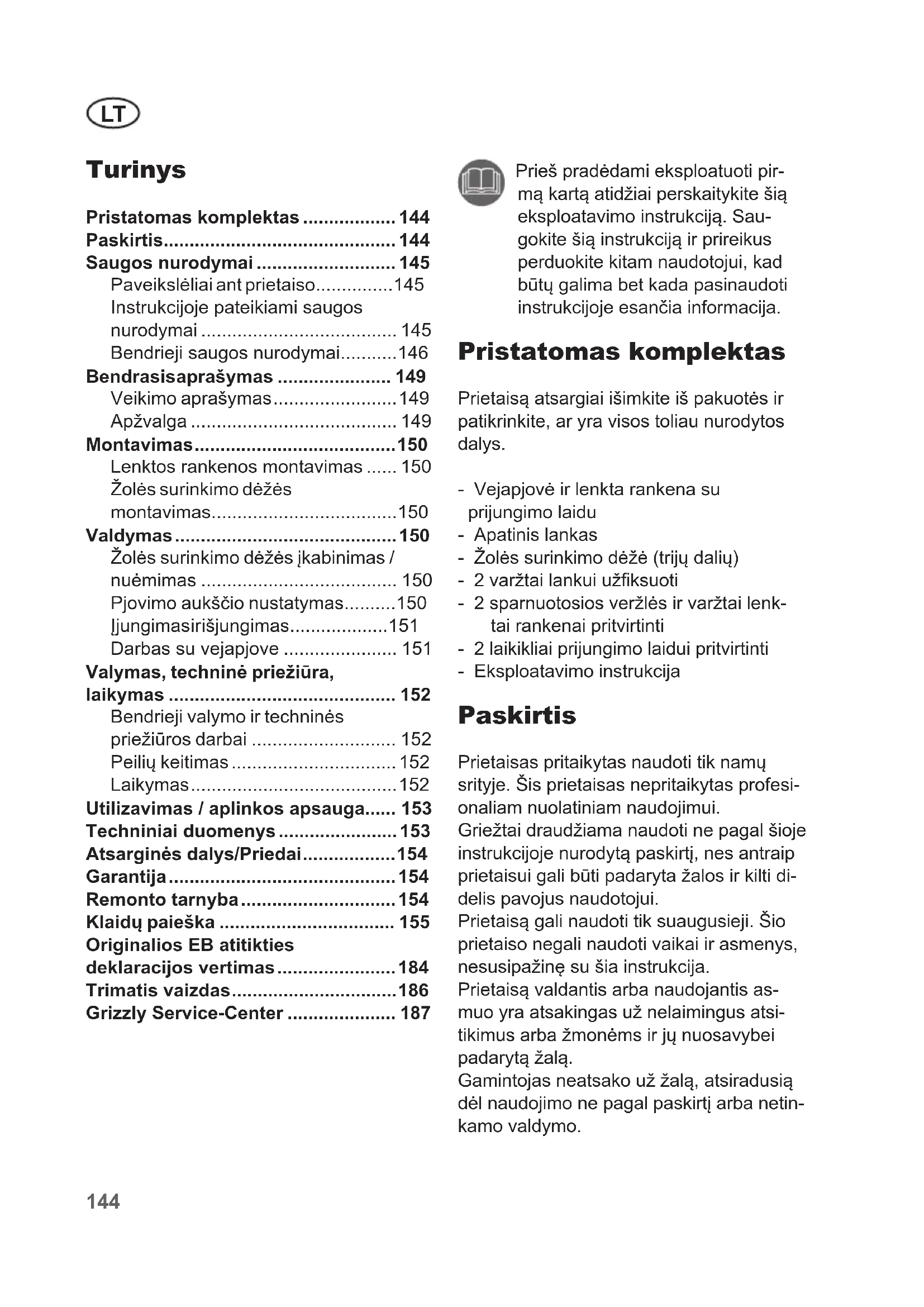 - Instrukcijoje pateikiami saugos nurodymai p. 145
