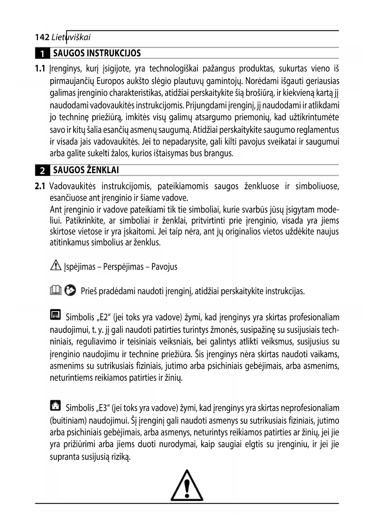 liui. Patikrinkite, ar simboliai ir ženklai, pritvirtinti prie įrenginio, visada yra jiems skirtose vietose ir yra įskaitomi. Jei taip nėra, ant jų originalios vietos uždėkite naujus atitinkamus simbolius ar ženklus. Įspėjimas – Perspėjimas – Pavojus Prieš pradėdami naudoti įrenginį, atidžiai perskaitykite instrukcijas. Simbolis „E2“ (jei toks yra vadove) žymi, kad įrenginys yra skirtas profesionaliam naudojimui, t.y. jį gali naudoti patirties turintys žmonės, susipažinę su susijusiais tech- niniais, reguliavimo ir teisiniais veiksniais, bei galintys atlikti veiksmus, susijusius su įrenginio naudojimu ir technine priežiūra. Šis įrenginys nėra skirtas naudoti vaikams, asmenims su sutrikusiais fiziniais, jutimo arba psichiniais gebėjimais, arba asmenims, neturintiems reikiamos patirties ir žinių. Simbolis „E3“ (jei toks yra vadove) žymi, kad įrenginys yra skirtas neprofesionaliam (buitiniam) naudojimui. Šį įrenginį gali naudoti asmenys su sutrikusiais fiziniais, jutimo arba psichiniais gebėjimais, arba asmenys, neturintys reikiamos patirties ar žinių, jei jie yra prižiūrimi arba jiems duoti nurodymai, kaip saugiai elgtis su įrenginiu, ir jei jie supranta susijusią riziką.143Lietuviškai Judančios dalys. Nelieskite. 0 Išjungimo padėtis