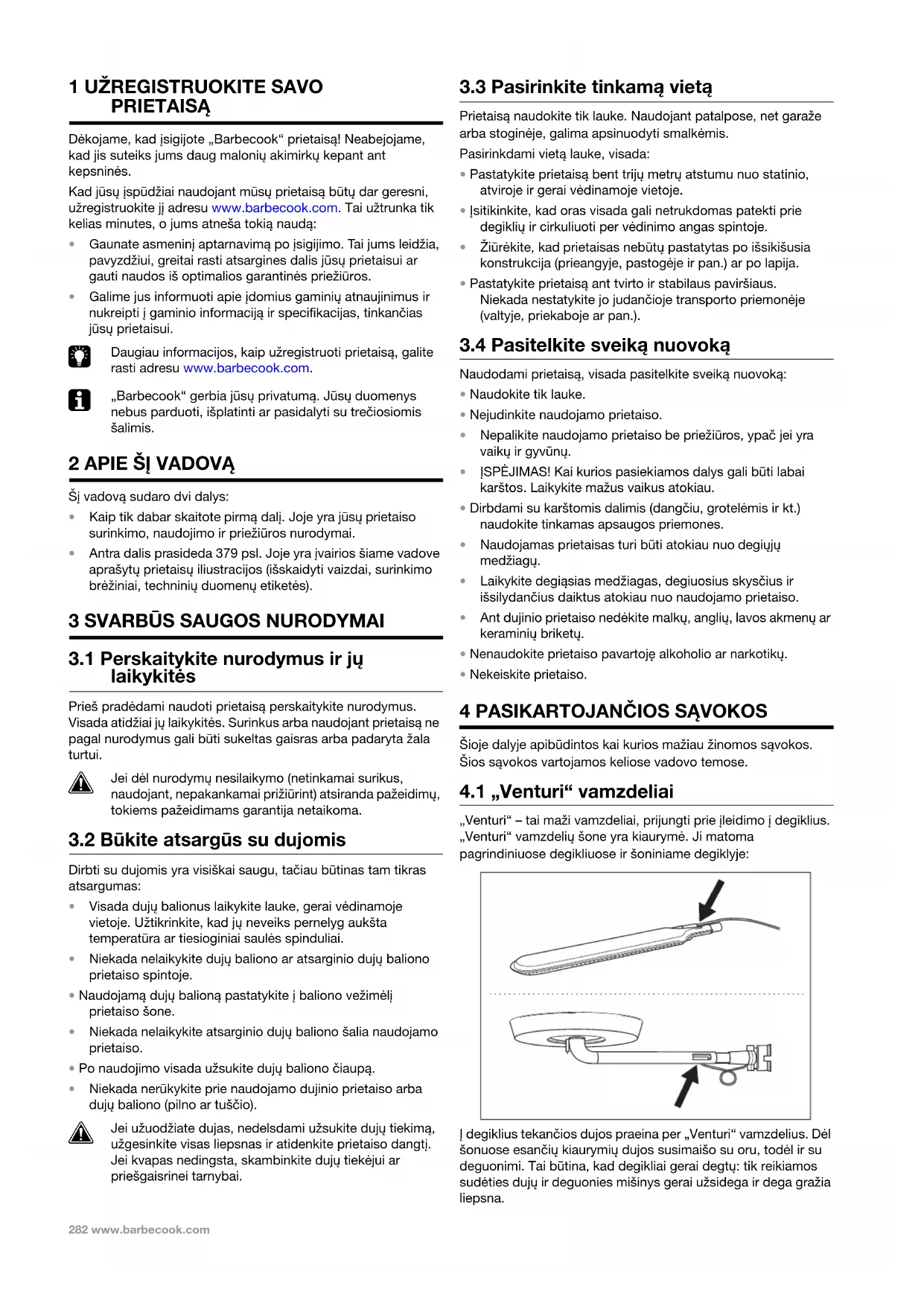 „Venturi“ – tai maži vamzdeliai, prijungti prie įleidimo į degiklius. „Venturi“ vamzdelių šone yra kiaurymė. Ji matoma pagrindiniuose degikliuose ir šoniniame degiklyje: Į degiklius tekančios dujos praeina per „Venturi“ vamzdelius. Dėl šonuose esančių kiaurymių dujos susimaišo su oru, todėl ir su deguonimi. Tai būtina, kad degikliai gerai degtų: tik reikiamos sudėties dujų ir deguonies mišinys gerai užsidega ir dega gražia liepsna. MAN_GAS_QUISSON_BBC_140730_A.book Page 282 Tuesday, February 2, 2016 4:55 PMwww.barbecook.com 283