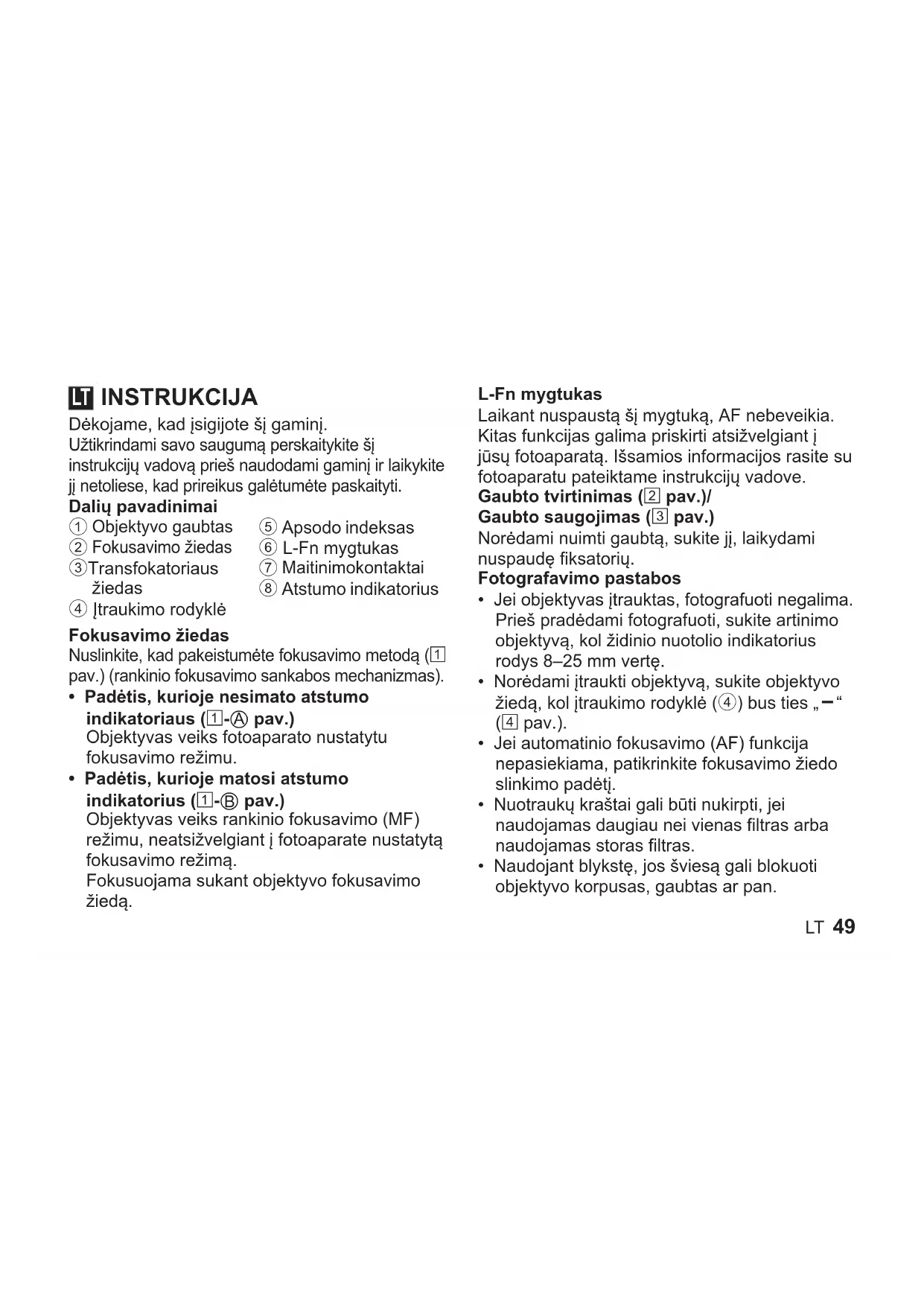 - Naudojant blykstę, jos šviesą gali blokuoti objektyvo korpusas, gaubtas ar pan. LT50 LT