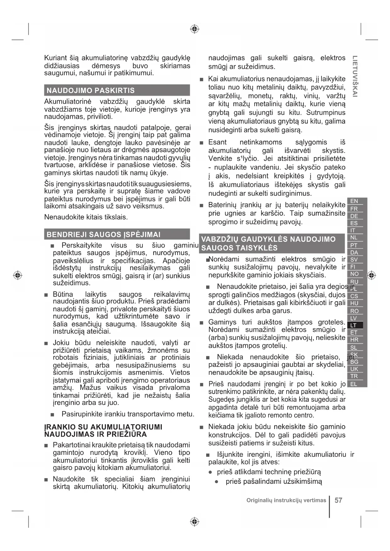 Norėdami sumažinti elektros smūgio ir sunkių susižalojimų pavojų, nevalykite ir nepurkškite gaminio jokiais skysčiais. ■ Nenaudokite prietaiso, jei šalia yra degios ir sprogti galinčios medžiagos (skysčiai, dujos ar dulkės). Prietaisas gali kibirkščiuoti ir gali uždegti dulkes arba garus. ■ Gaminys turi aukštos įtampos groteles. Norėdami sumažinti elektros smūgio ir (arba) sunkių susižalojimų pavojų, nelieskite aukštos įtampos grotelių. ■ Niekada nenaudokite šio prietaiso, jei pažeisti jo apsauginiai gaubtai ar skydeliai, nenaudokite be apsauginių įtaisų. ■ Prieš naudodami įrenginį ir po bet kokio jo sutrenkimo patikrinkite, ar nėra pakenktų dalių. Sugedęs jungiklis ar bet kokia kita sugedusi ar apgadinta detalė turi būti remontuojama arba keičiama tik įgalioto remonto centro. ■ Niekada jokiu būdu nekeiskite šio gaminio konstrukcijos. Dėl to gali padidėti pavojus susižeisti patiems ir sužeisti kitus. ■ Išjunkite irengini, išimkite akumuliatoriu ir palaukite, kol jis atves: ● prieš atlikdami techninę priežiūrą ● prieš pašalindami užsikimšimą58 Originalių instrukcijų vertimas ● prieš tikrindami ar valydami prietaisą arba prieš pradėdami juo pjauti žolę; ● prieš keisdami priedus ● kaskart atlikdami techninę priežiūrą ■ Nelaimingo atsitikimo arba gedimo atveju nedelsdami išjunkite įrenginį ir išimkite akumuliatorių. Nenaudokite įrenginio tol, kol jis nebus išsamiai patikrintas įgaliotos techninės priežiūros centre. ■ Nežiūrėkite tiesiai į ultravioletinių spindulių lempą, kad nebūtų pažeistas regėjimas. PAPILDOMI AKUMULIATORIAUS