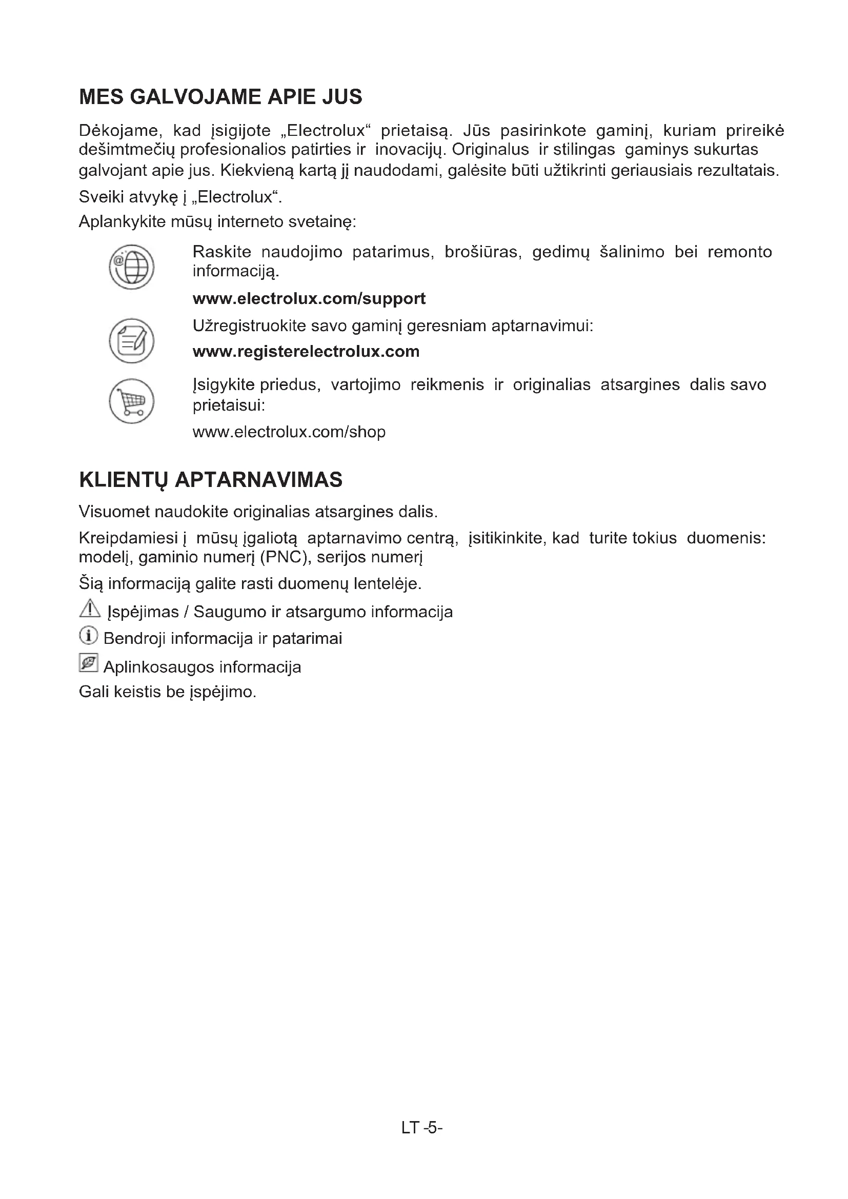 Dėkojame, kad įsigijote „Electrolux“ prietaisą. Jūs pasirinkote gaminį, kuriam prireikė dešimtmečių profesionalios patirties ir inovacijų. Originalus ir stilingas gaminys sukurtas galvojant apie jus. Kiekvieną kartą jį naudodami, galėsite būti užtikrinti geriausiais rezultatais. Sveiki atvykę į „Electrolux“. Aplankykite mūsų interneto svetainę: Raskite naudojimo patarimus, brošiūras, gedimų šalinimo bei remonto informaciją. www.electrolux.com/support Užregistruokite savo gaminį geresniam aptarnavimui: www.registerelectrolux.com Įsigykite priedus, vartojimo reikmenis ir originalias atsargines dalis savo prietaisui: www.electrolux.com/shop KLIENTŲ APTARNAVIMAS Visuomet naudokite originalias atsargines dalis. Kreipdamiesi į mūsų įgaliotą aptarnavimo centrą, įsitikinkite, kad turite tokius duomenis: modelį, gaminio numerį (PNC), serijos numerį Šią informaciją galite rasti duomenų lentelėje. Įspėjimas / Saugumo ir atsargumo informacija Bendroji informacija ir patarimai Aplinkosaugos informacija Gali keistis be įspėjimo.LT -6-