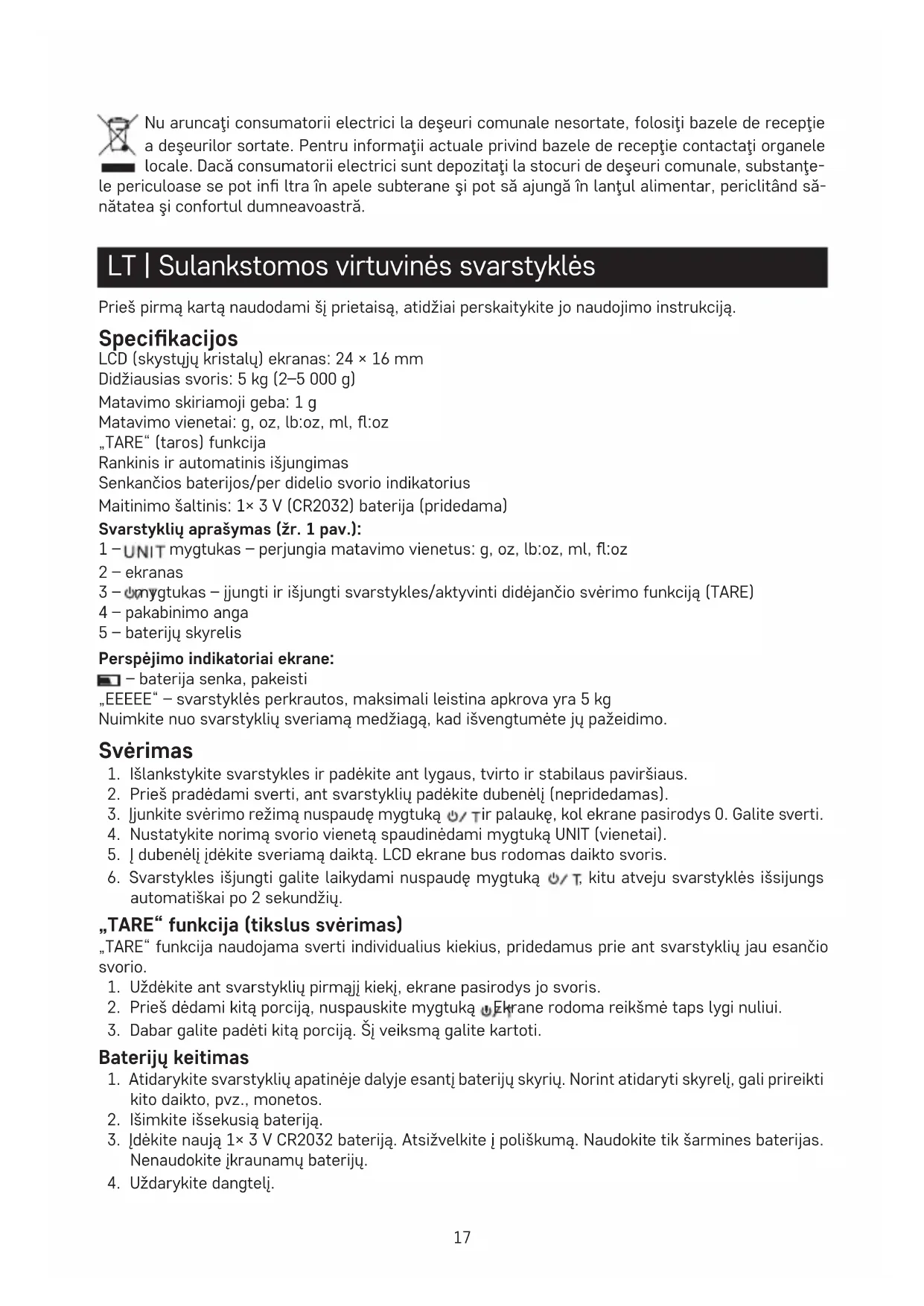 - Svarstyklės skirtos sverti maisto produktus ir tik buitiniam naudojimui.