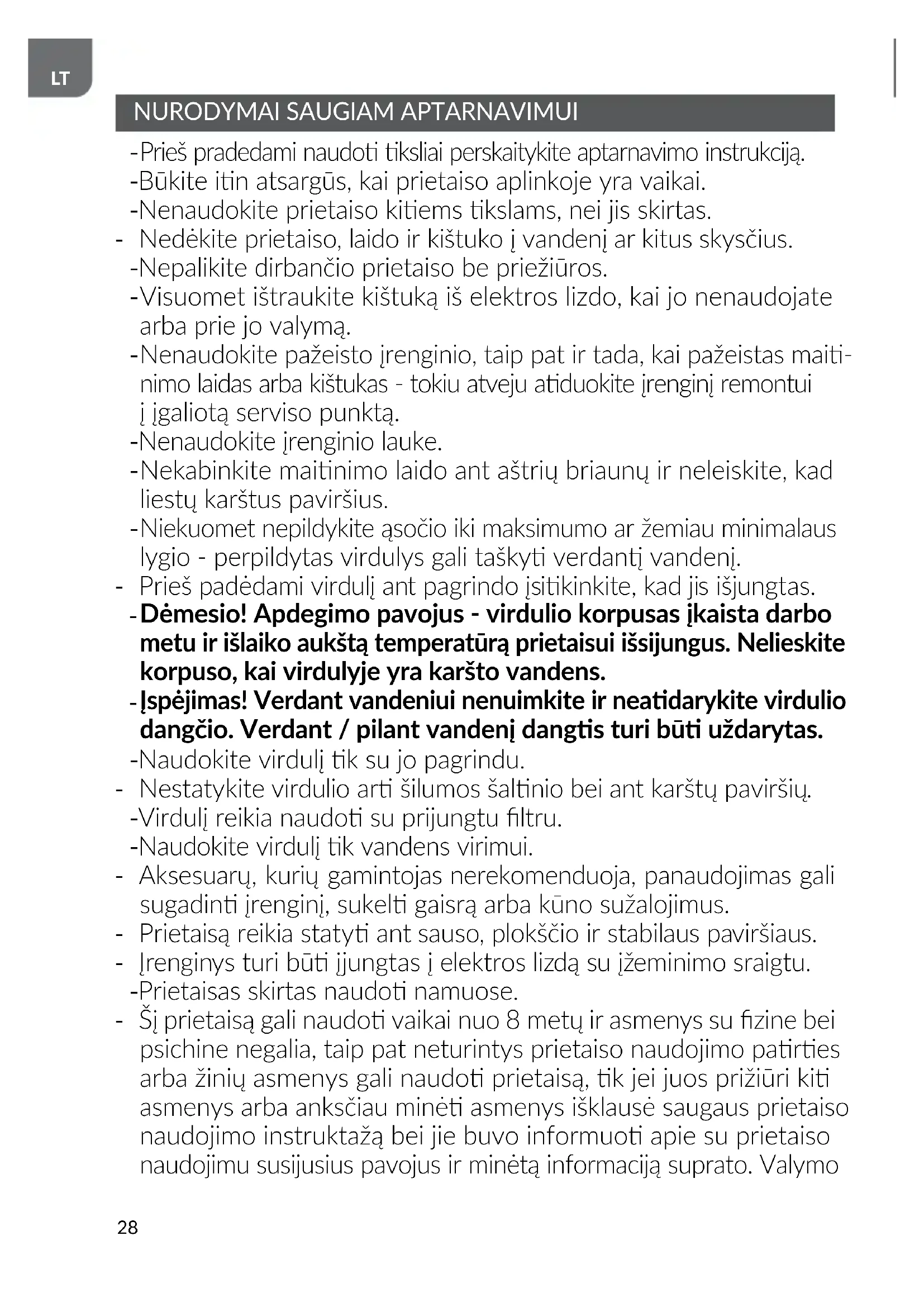 Įspėjimas! Verdant vandeniui nenuimkite ir neadarykite virdulio dangčio. Verdant / pilant vandenį dangs turi bū uždarytas. - Naudokite virdulį k su jo pagrindu. - Nestatykite virdulio ar šilumos šalnio bei ant karštų paviršių. - Virdulį reikia naudo su prijungtu ltru. - Naudokite virdulį k vandens virimui. - Aksesuarų, kurių gamintojas nerekomenduoja, panaudojimas gali sugadin įrenginį, sukel gaisrą arba kūno sužalojimus. - Prietaisą reikia staty ant sauso, plokščio ir stabilaus paviršiaus. - Įrenginys turi bū įjungtas į elektros lizdą su įžeminimo sraigtu. - Prietaisas skirtas naudo namuose. - Šį prietaisą gali naudo vaikai nuo 8 metų ir asmenys su zine bei psichine negalia, taip pat neturintys prietaiso naudojimo pares arba žinių asmenys gali naudo prietaisą, k jei juos prižiūri ki asmenys arba anksčiau minė asmenys išklausė saugaus prietaiso naudojimo instruktažą bei jie buvo informuo apie su prietaiso naudojimu susijusius pavojus ir minėtą informaciją suprato. Valymo29