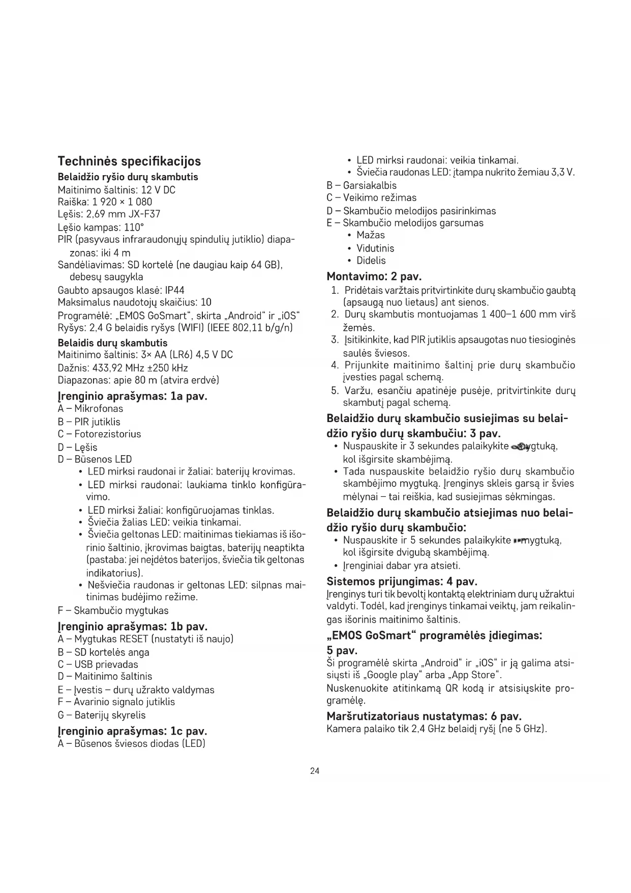 - Įrenginiai dabar yra atsieti. Sistemos prijungimas: 4 pav. Įrenginys turi tik bevoltį kontaktą elektriniam durų užraktui valdyti. Todėl, kad įrenginys tinkamai veiktų, jam reikalin- gas išorinis maitinimo šaltinis. „EMOS GoSmart“ programėlės įdiegimas: 5 pav. Ši programėlė skirta „Android“ ir „iOS“ ir ją galima atsi- siųsti iš „Google play“ arba „App Store“. Nuskenuokite atitinkamą QR kodą ir atsisiųskite pro- gramėlę. Maršrutizatoriaus nustatymas: 6 pav. Kamera palaiko tik 2,4 GHz belaidį ryšį (ne 5 GHz).25 Mobilioji programėlė: „EMOS GoSmart“: 7a pav. Atidarykite „EMOS GoSmart“ ir patvirtinkite privatumo politiką paliesdami „sutinku“. 7b pav. Pasirinkite „užsiregistruoti“. 7c pav. Įveskite galiojantį el. pašto adresą ir pasirinkite slaptažodį. Patvirtinkite privatumo politiką paliesdami „sutinku“. Pasirinkite „prisijungti“. 8a pav. Pasirinkite „pridėti prietaisą“. 8b pav. Pasirinkite atitinkamą gaminio kategoriją. 8c pav. Pasirinkite tinkamą gaminio tipą. 8d pav. Prijunkite įrenginį prie maitinimo. 8e pav. Įsitikinkite, kad blyksi įrenginio LED. Patvirtinkite paliesdami „toliau“. 8f pav. Įveskite belaidžio ryšio tinklo pavadinimą ir slaptažodį. Patvirtinkite paliesdami „toliau“. 8g pav. Jūsų įrenginio ekrane atsiras QR kodas. Laikykite QR kodą priešais kameros lęšį. Patvirtinkite, kad išgirdote garsinį signalą, reiškiantį, jog susiejimas pavyko sėkmingai. 8h pav. Įrenginys bus aptiktas automatiškai. 8i pav. Įrenginys rastas. Patvirtinkite paliesdami „atlikta“. Junglumas: belaidis ryšys 2,4 GHz IEEE 802,11 b/g/n Dažnio juosta: 2,400–2,4835 GHz Nemeskite kartu su buitinėmis atliekomis. Prista- tykite į specialius rūšiuojamoms atliekoms skirtus surinkimo punktus. Susisiekite su vietinėmis val- džios institucijomis, kad šios suteiktų informaciją apie surinkimo punktus. Jei elektroniniai prietaisai yra išme- tami atliekų užkasimo vietose, kenksmingos medžiagos gali patekti į gruntinius vandenis, o paskui ir į maisto grandinę, ir tokiu būdu pakenkti žmonių sveikatai. Aš, EMOS spol. s r.o. patvirtinu, kad radijo įrenginių tipas H4031 atitinka Direktyvą 2014/53/ES. Visas ES atitikties deklaracijos tekstas prieinamas šiuo interneto adresu: http://www.emos.eu/download. LV | IP durvju kameras komplekts Komplektācija Wi-Fi durvju zvans (raidītājs) Pārsegs (nokrišņu vāciņš) Bezvadu zvans (uztvērējs) Barošanas bloks Savienotājkabelis Montāžas materiāli – skrūves Lietošanas instrukcija Tehniskā specikācija Wi-Fi durvju zvans (raidītājs) Barošanas avots: 12 V līdzstrāva Izšķirtspēja: 1 920 × 1 080 Objektīvs: 2,69 mm JX-F37 Objektīva leņķis: 110° Pasīvā infrasarkanā starojuma sensora (PIR) darbības rādiuss: līdz 4 m Datu glabāšana: SD karte (maks. 64 GB), mākoņkrātuve Elektroiekārtas korpusa aizsargātības pakāpe: IP44 Maksimālais lietotāju skaits: 10 Lietotne: EMOS GoSmart operētājsistēmai Android un iOS Savienojums: 2,4 GHz Wi-Fi (IEEE802.11b/g/n) Bezvadu zvans (uztvērējs) Barošanas avots: trīs AA (LR6) tipa baterijas, 4,5 V līdzstrāva Frekvence: 433,92 MHz ±250 kHz Darbības rādiuss: apm. 80 m (atklātās vietās) Ierīces apraksts (1.a att.) A – Mikrofons B – PIR sensors C – Fotorezistors D – Objektīvs E – Statusa LED indikators
