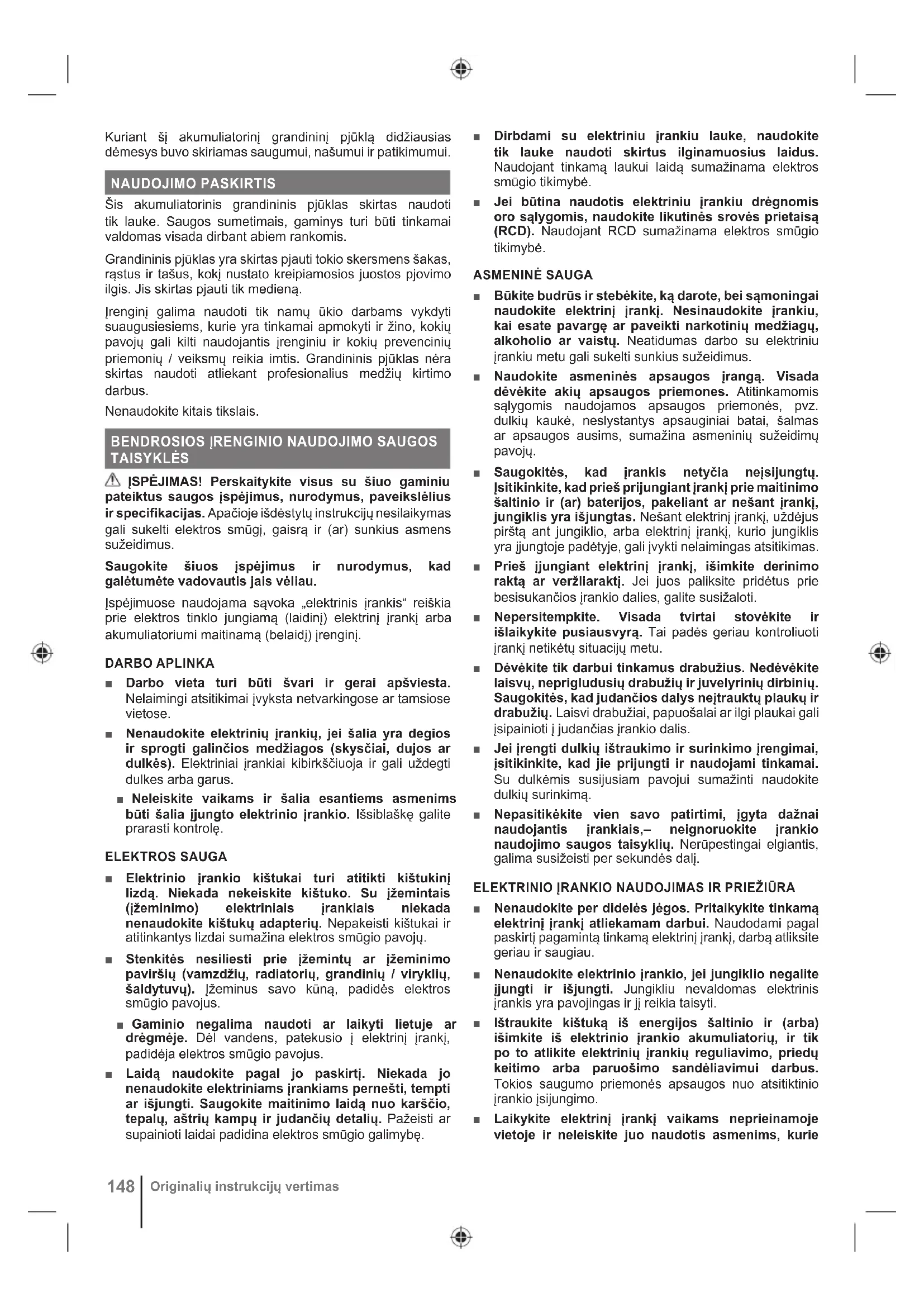 ■ Pjaudami grandininiu pjūklu, būkite atokiai nuo pjūklo grandinės. Prieš paleisdami grandininį pjūklą, būtinai patikrinkite, ar pjūklo grandinė nesiliečia su jokiais kitais objektais. Pjaunant grandininiu pjūklu, nors akimirksnį esant neatidiems, į pjūklo grandinę gali įsivelti drabužiai ar žmogaus kūno dalys. ■ Grandininį pjūklą laikykite dešiniąja plaštaka paėmę už galinės rankenos, o kairiąja – už priekinės. Grandininį pjūklą laikant priešinga tvarka, padidėja asmens susižeidimo pavojus, todėl būtina elgtis saugiai. ■ Grandinį pjūklą laikykite tik už izoliuotų paviršių, nes grandininiu pjūklu galite užkliudyti nematomus laidus arba jo paties laidą. Pjovimo grandinei prisilietus prie „gyvo“ laido, neizoliuotos metalinės grandininio pjūklo dalys gali sukelti elektros smūgį ir nutrenkti naudotoją. ■ Dėvėkite apsauginius akinius Rekomenduojama naudoti papildomas apsaugos priemones ausims, galvai, rankoms, kojoms ir pėdoms apsaugoti. Tinkamos apsaugos priemonės sumažins sužalojimo pavojų, keliamą lekiančių skiedrų ar netyčinio prisilietimo prie pjovimo grandinės. ■ Nenaudokite grandininio pjūklo būdami ant medžio, kopėčių, ant stogo krašto ar kitos nestabilios konstrukcijos. Taip naudojant grandininį pjūklą, galima sunkiai susižaloti. ■ Būtinai tvirtai atsistokite ir pjaukite grandininiu pjūklu tik stovėdami ant tvirto ir lygaus paviršiaus. Būdami ant slidžių ar nestabilių paviršių galite prarasti pusiausvyrą arba nesuvaldyti grandininio pjūklo. ■ Pjaudami įtemptą šaką, saugokitės, nes šaka gali atšokti kaip spyruoklė. Kai medienos plaušo įtempimas nuslūgsta, įsitempusi šaka gali atsimušti į darbuotoją ir (arba) grandininis pjūklas gali tapti nevaldomas. ■ Būkite ypatingai atsargūs pjaudami krūmus ir medelius. Laibas kotelis gali įsivelti į pjūklo grandinę ir kaip botagas nupliekti jus arba išmušti jus iš pusiausvyros. ■ Išjungtą iš maitinimo grandininį pjūklą neškite paėmę už priekinės rankenos ir atokiai nuo savęs. Transportuojant ar nenaudojamą grandininį pjūklą padedant į sandėlį, būtina uždėti kreipiamosios juostos gaubtą. Tinkamai naudojant grandininį pjūklą, sumažėja tikimybė atsitiktinai susiliesti su judančia pjūklo grandine. ■ Vadovaukitės nurodymais, kaip tepti įrenginį, įtempti jo grandinę ar pakeisti juostą ir grandinę. Netinkamai įtempta ar sutepta grandinė gali sutrūkti arba gali padidėti galimybė įvykti atatrankai. ■ Pjaukite tik medieną. Nenaudokite grandininio pjūklo ne pagal paskirtį. Pavyzdžiui: nepjaukite grandininiu pjūklu metalo, plastiko, mūro ar nemedinių statybinių medžiagų. Grandininį pjūklą naudojant ne pagal paskirtį, gali kilti pavojinga situacija. ■ Nebandykite nukirsti medžio, kol nenustatysite visų rizikų ir kaip jų išvengti. Kertant medį, operatorius arba pašaliniai asmenys gali būti sunkiai sužaloti. ■ Vadovaukitės visais nurodymais, kaip tinkamai pašalinti užstrigusias medžiagas, saugoti ir techniškai prižiūrėkite grandininį pjūklą. Jungiklis būtinai privalo būti išjungtas, o jo akumuliatorius – išimtas. Netyčia įjungus grandinį pjūklą, valant jį užkimšusius nešvarumus arba vykdant techninės priežiūros darbus, galima sunkiai susižaloti.150 Originalių instrukcijų vertimas