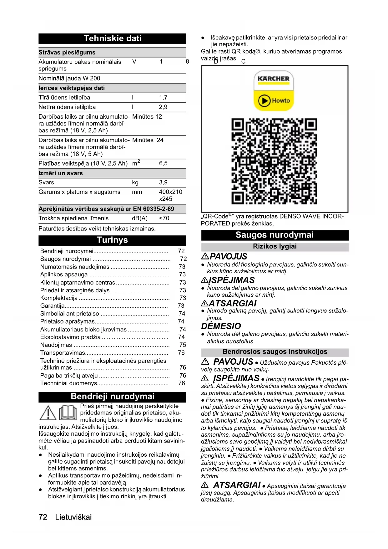 • 6,5 Izmēri un svars Svars kg 3,9 Garums x platums x augstums mm 400x210 x245 Aprēķinātās vērtības saskaņā ar EN 60335-2-69 Trokšņa spiediena līmenis dB(A) <70 Bendrieji nurodymai p. 72